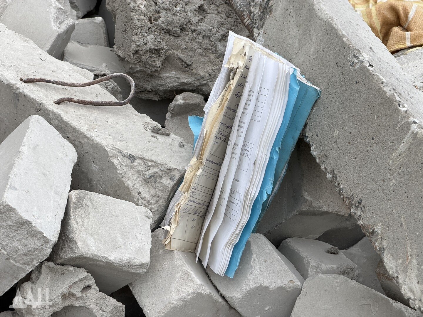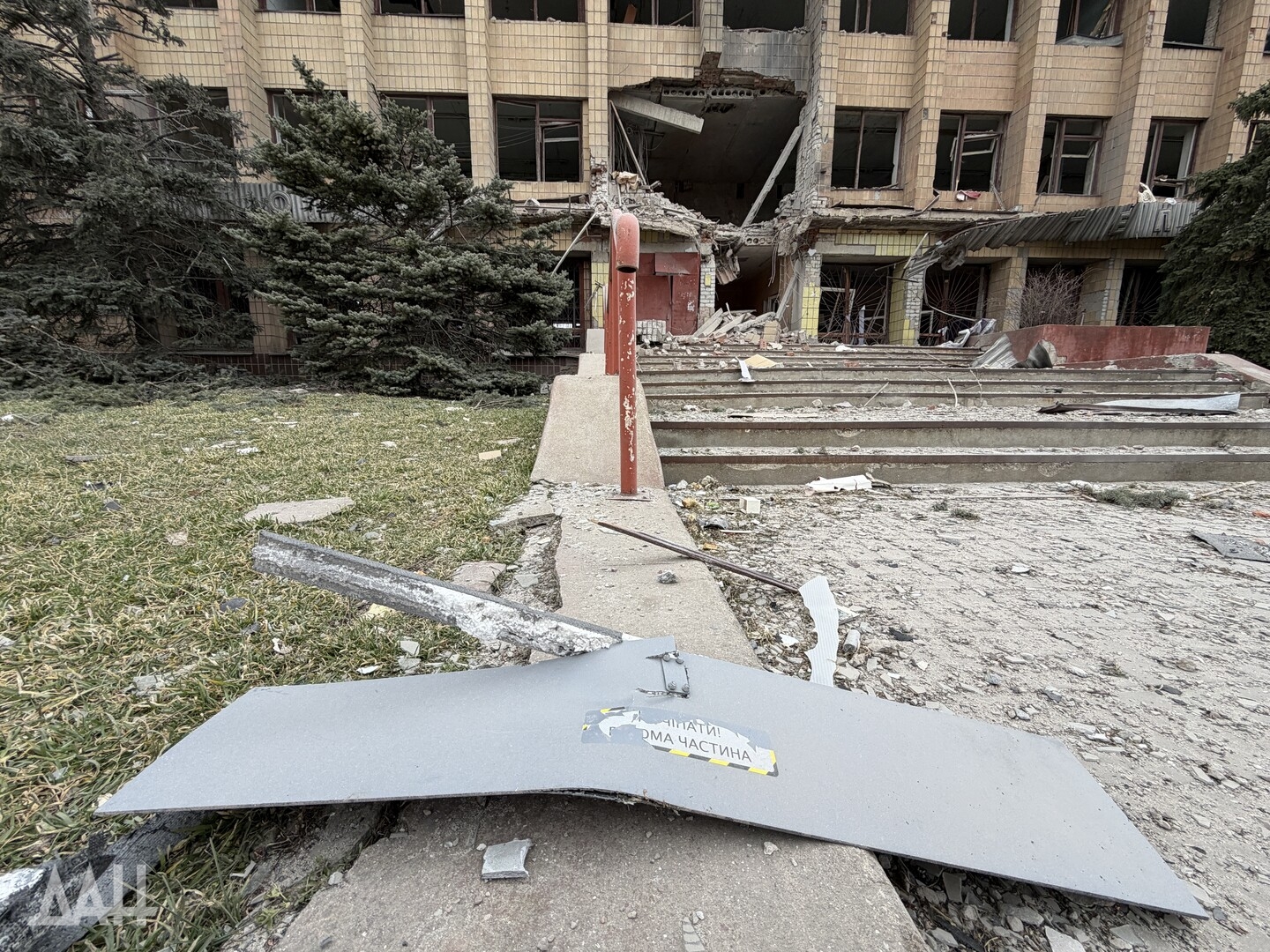 На ступеньках перед зданием лежат фрагменты беспилотника с надписями на украинском.