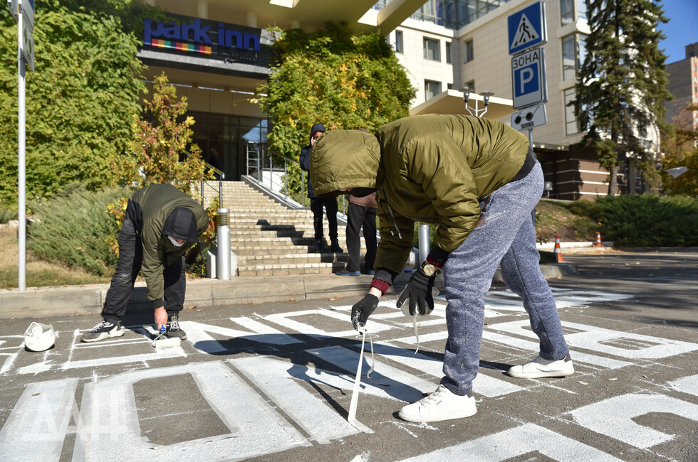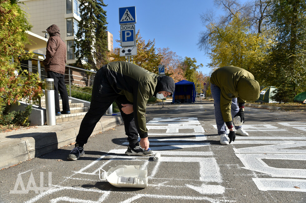 Donetsk, Oct 20 – DAN. Bouncy music woke up the OSCE SMM members in Donetsk this morning, as the rally against the mission's lack of actions entered its sixth day. The protesters, who set up tents a couple of days ago outside the Park Inn hotel at the Pushkina Blvd where the mission is based, started the day with a morning exercise and then wrote "OSCE, your blindness is someone's death" in front of the hotel.