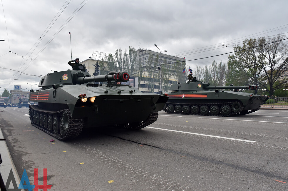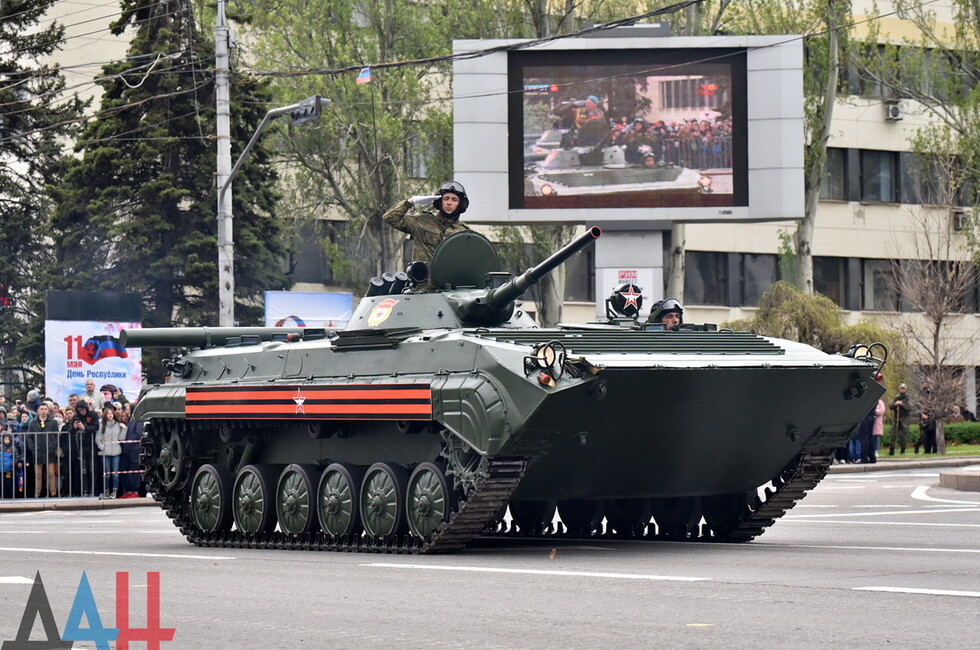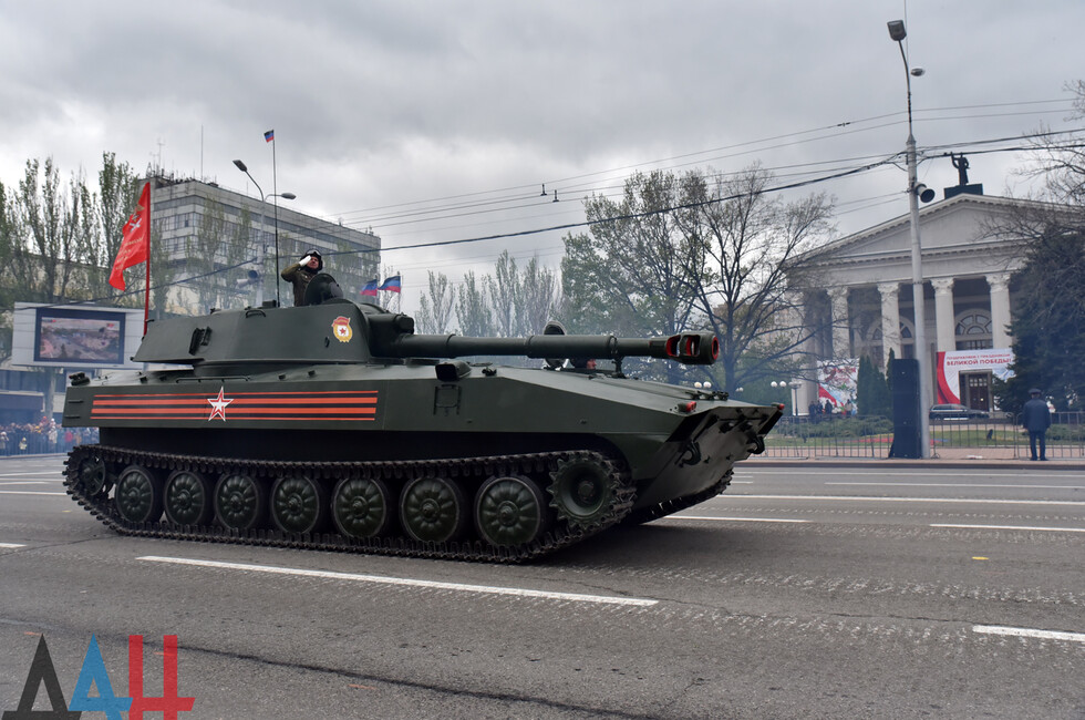 Modern equipment was represented by DPR people's militia equipment and pieces seized from Ukrainian army. PTS-2 amphibious transport was showcased in the parade for the first time. The total of 76 equipment pieces rolled through the central Donetsk street.