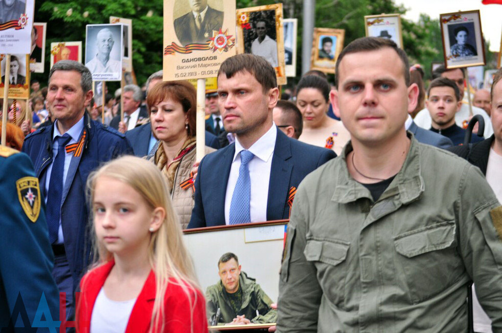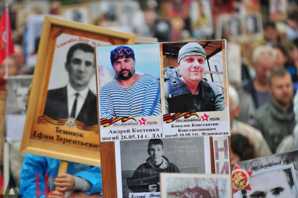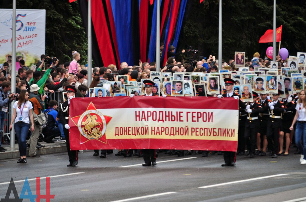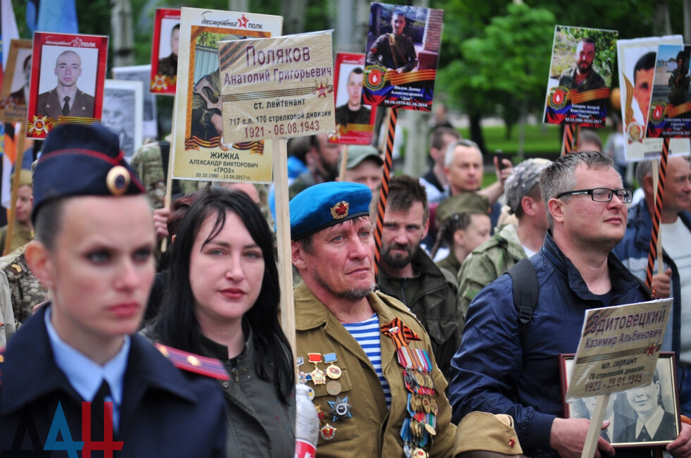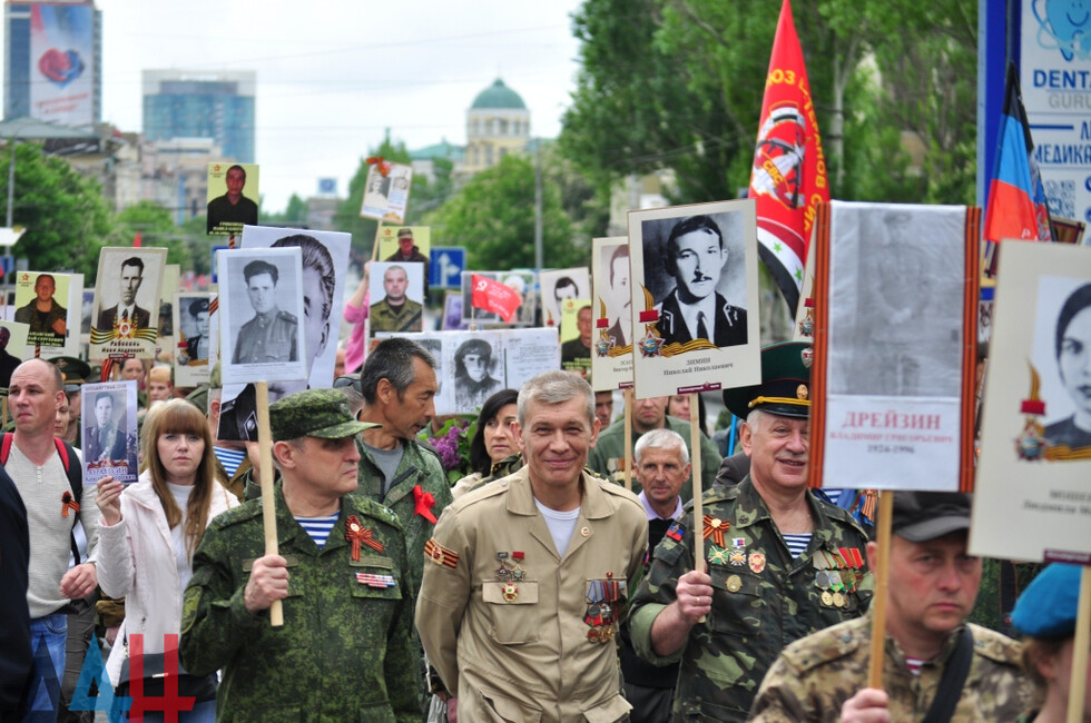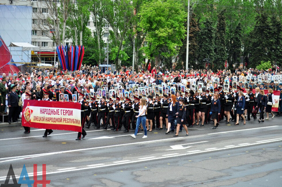 Nineteen DPR towns hosted commemorative events. The largest march was held in the Republic’s capital. Updated reports said some 100,000 people had marched along the city’s main street holding portraits of WWII soldiers and DPR defenders. The participants included war veterans, DPR authorities, public activists and residents.