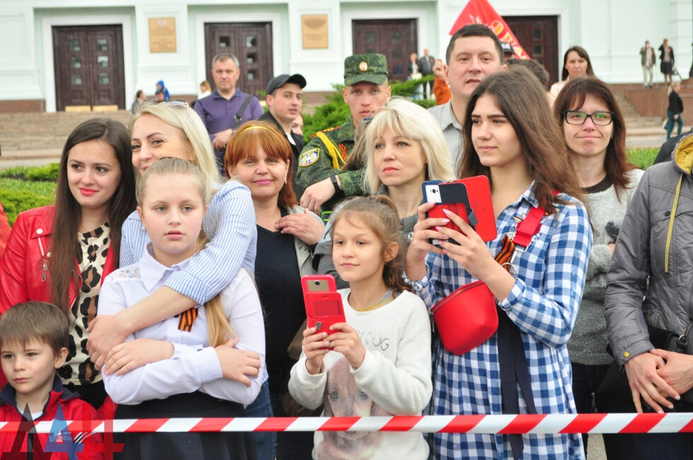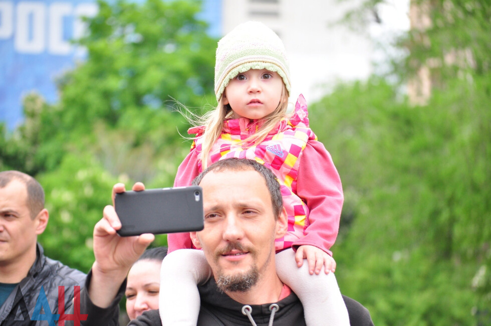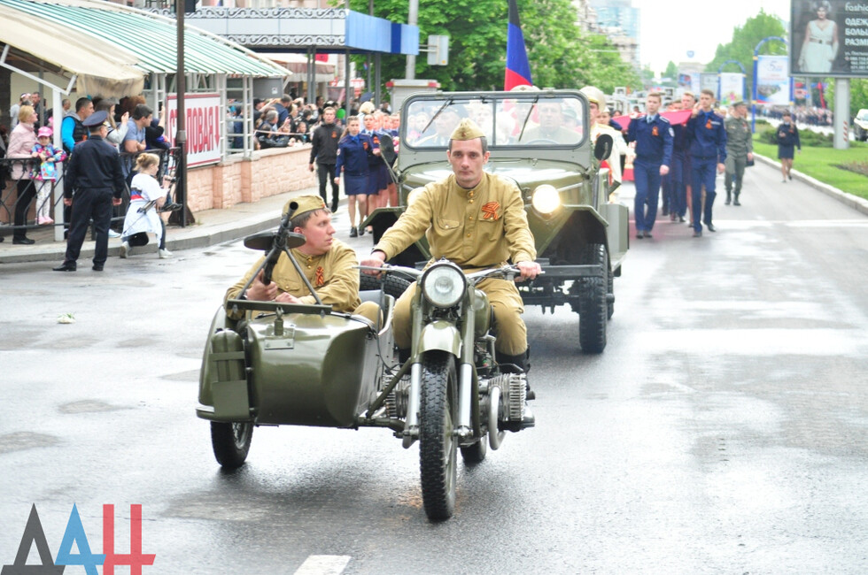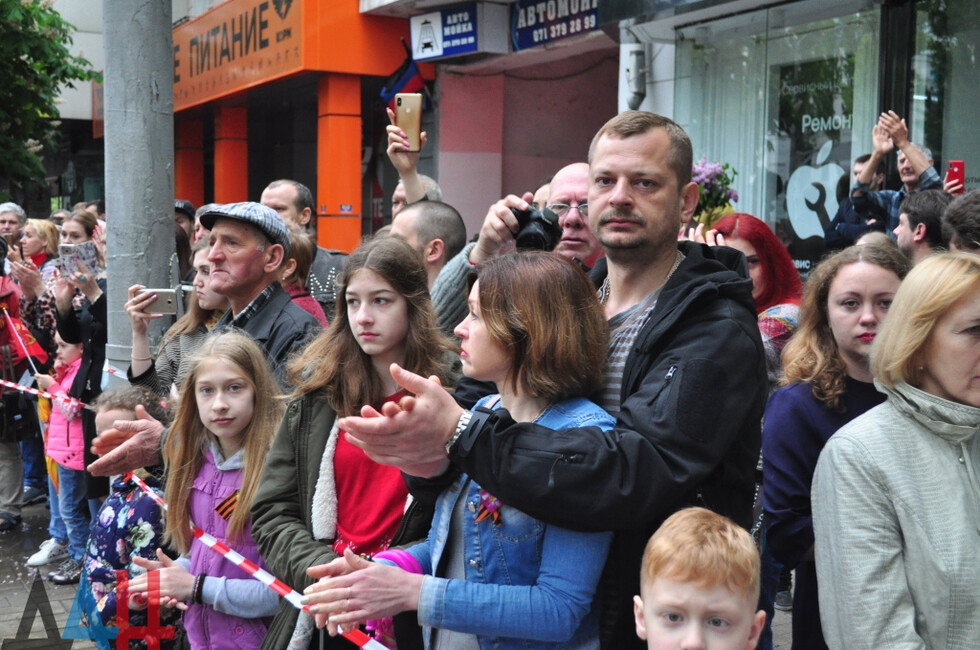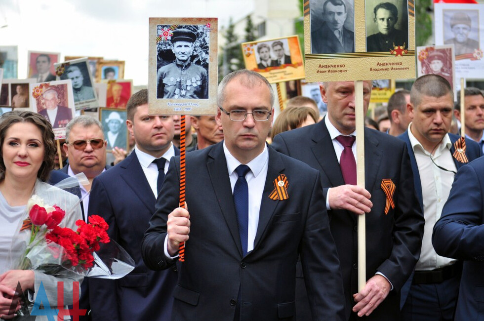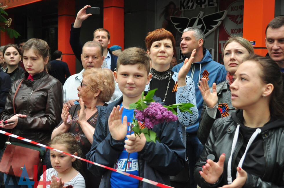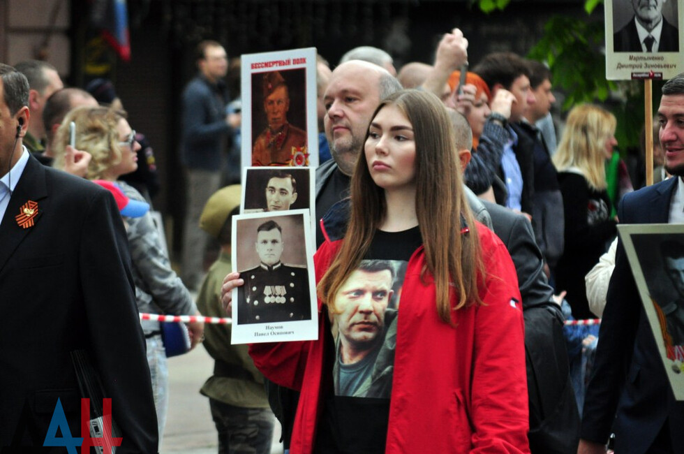 Nineteen DPR towns hosted commemorative events. The largest march was held in the Republic’s capital. Updated reports said some 100,000 people had marched along the city’s main street holding portraits of WWII soldiers and DPR defenders. The participants included war veterans, DPR authorities, public activists and residents.