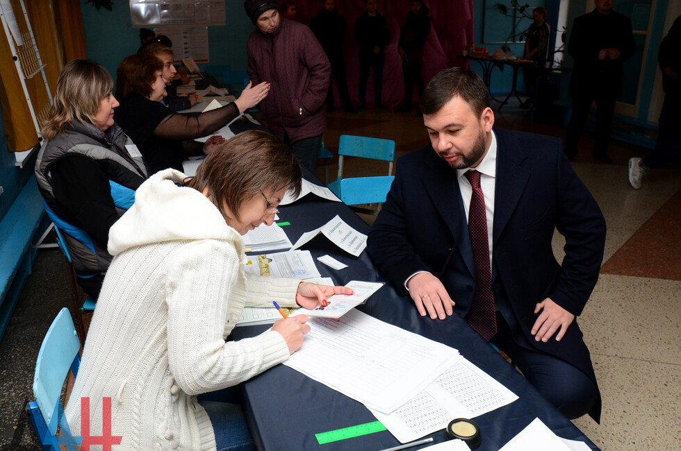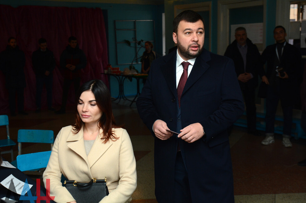 Pushilin, accompanied by his spouse Irina, arrived at the polling station No. 156 based on the premises of school No. 64 in the frontline Kuibysheva district of Donetsk.