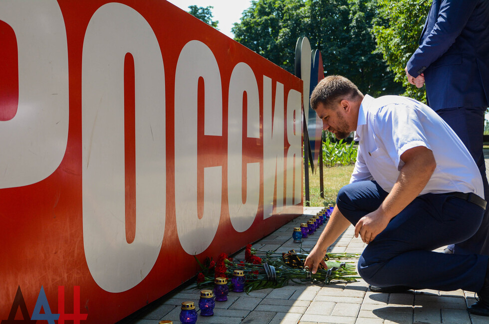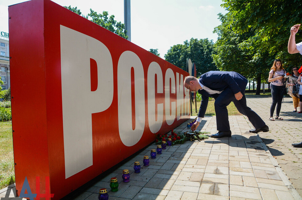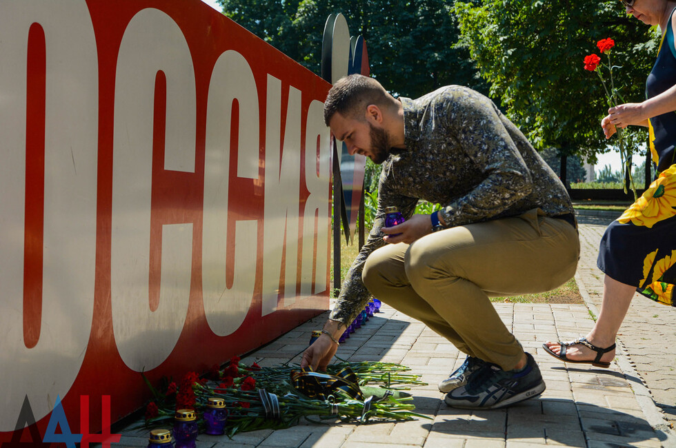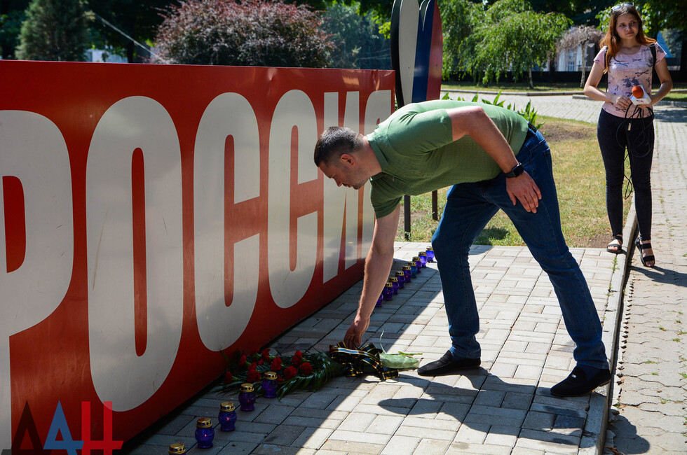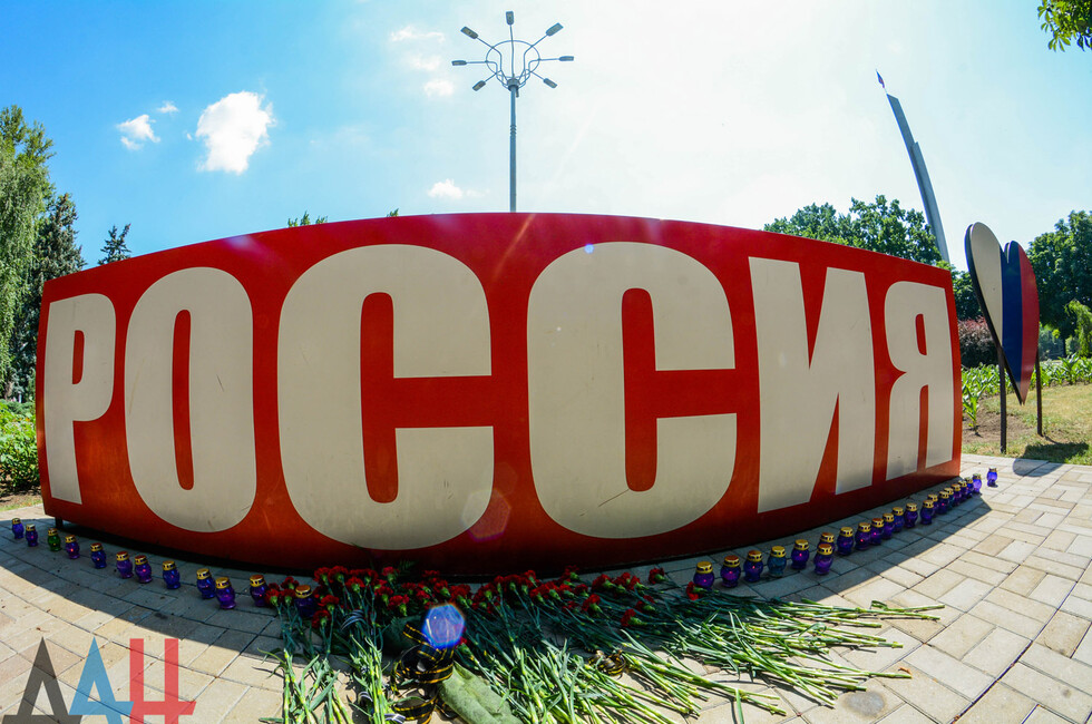 Donetsk, Jul 3 – DAN. DPR residents bring flowers to the 'Russia' art installation in Donetsk to commemorate the 14 Russian sailors killed in fire on board the AS-12 submarine off Severomorsk. *ot