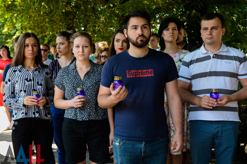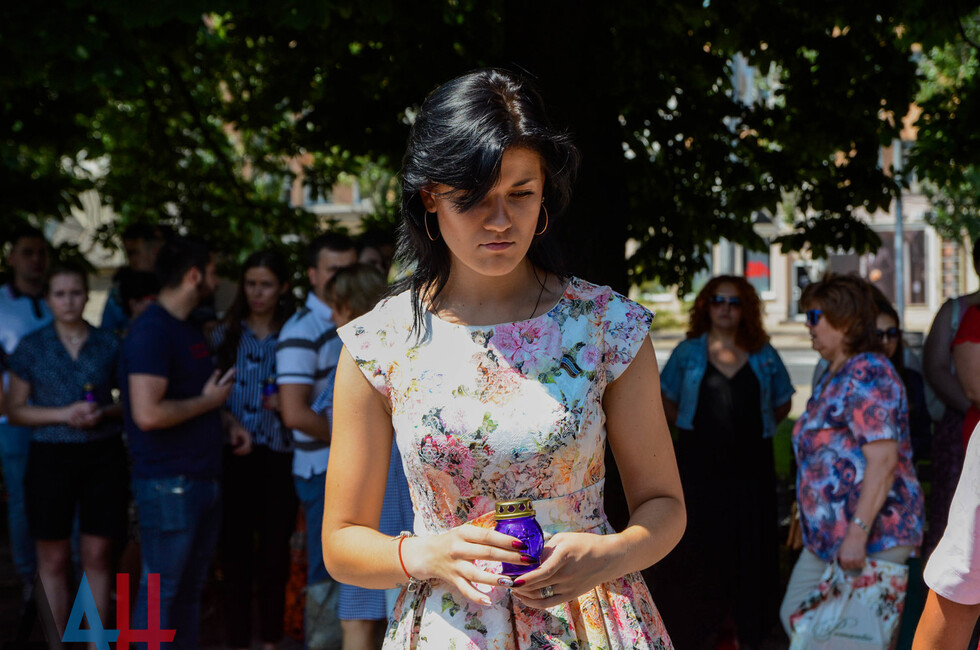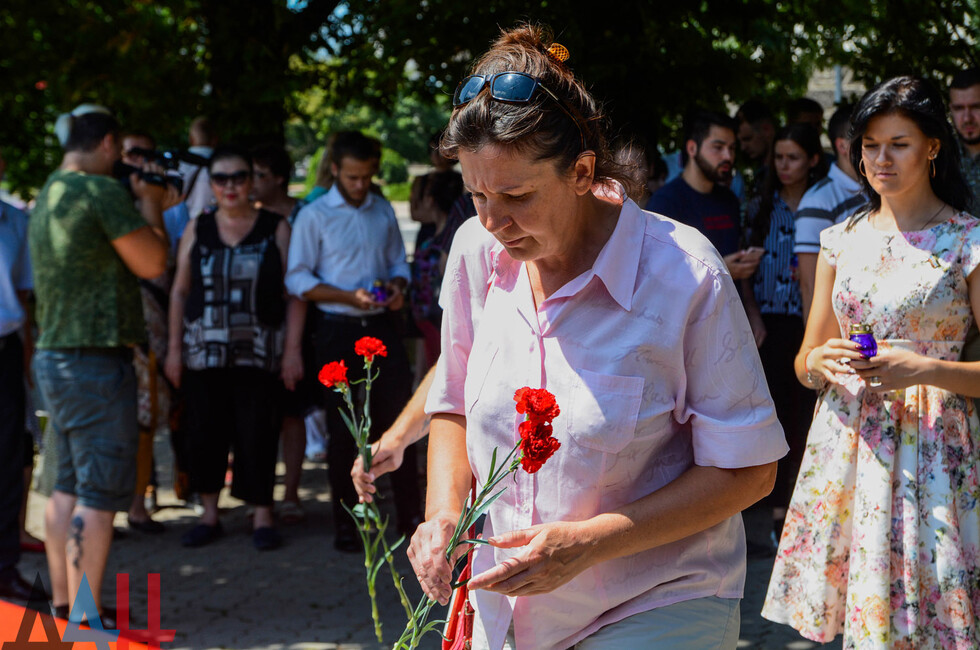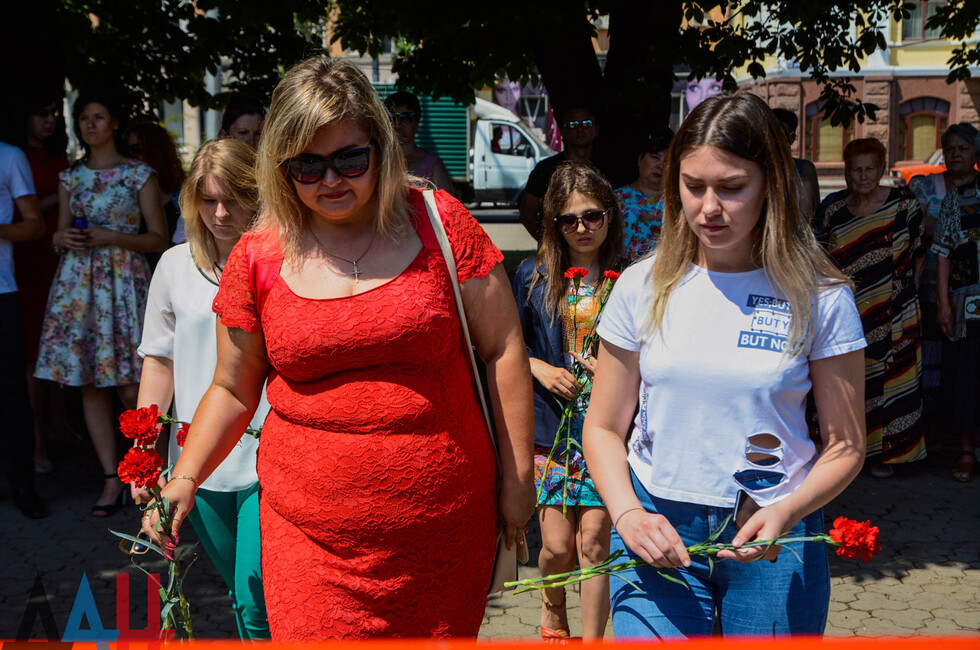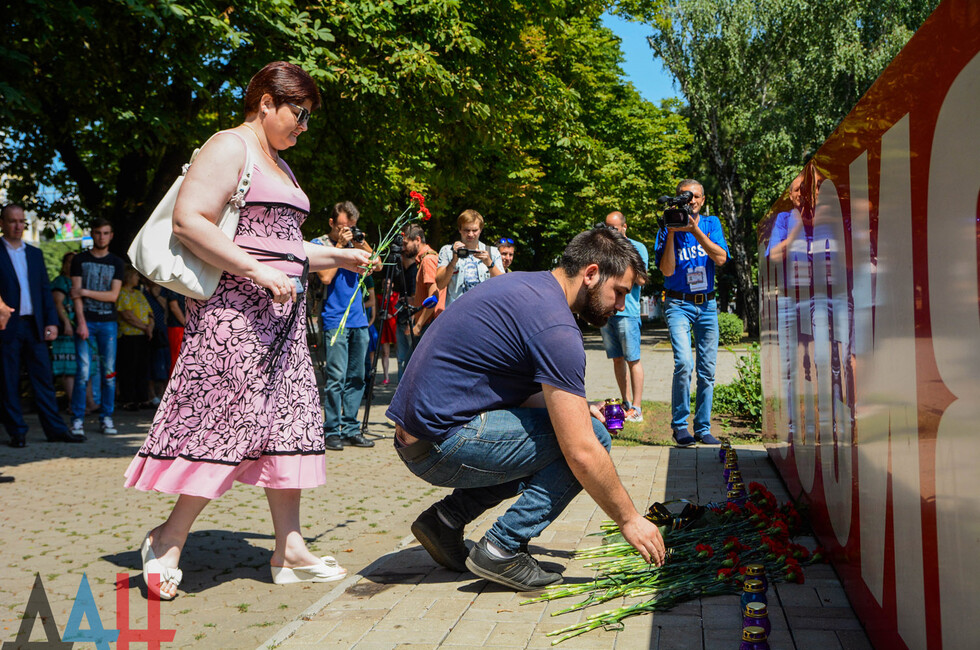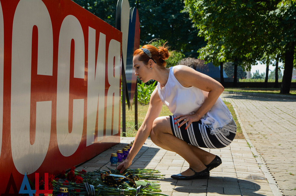 Donetsk, Jul 3 – DAN. DPR residents bring flowers to the 'Russia' art installation in Donetsk to commemorate the 14 Russian sailors killed in fire on board the AS-12 submarine off Severomorsk. *ot