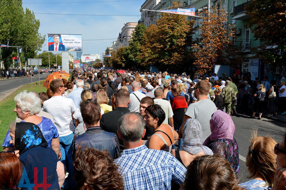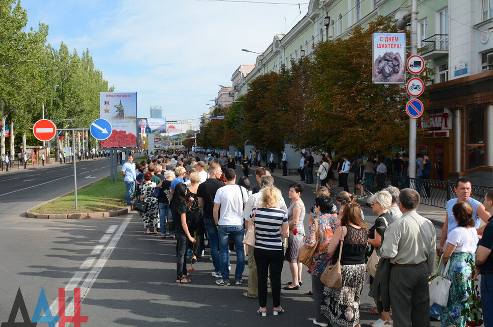 He is eulogized by ministers, deputies, administration heads, military men, workers, pensioners, students. Overall, thousands of people queue to pay tribute to the late Zakharchenko.