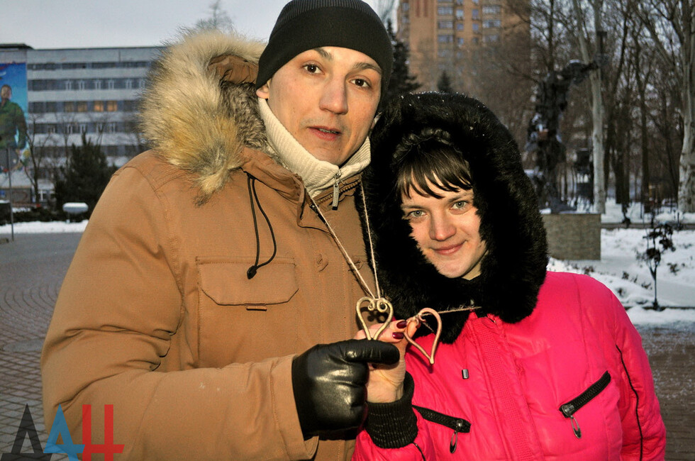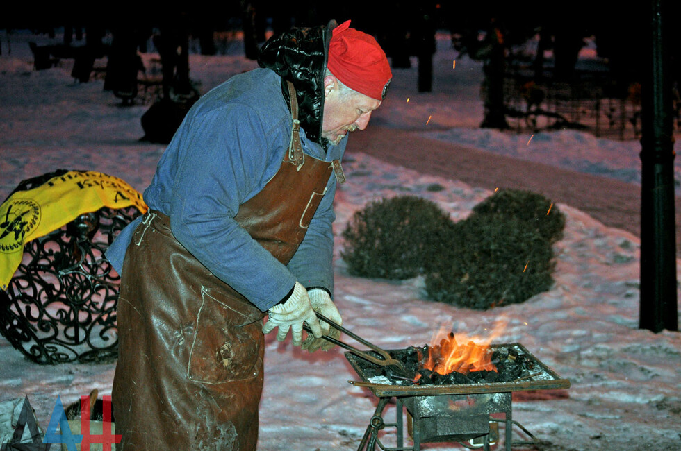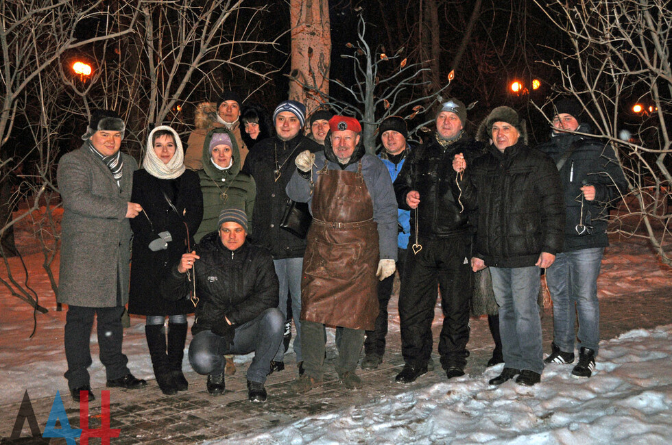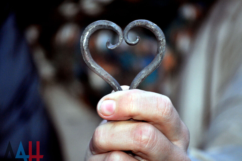 Donetsk, Feb 14 – DAN. Donetsk residents on Tuesday morning flocked to central Forged Figurers Park to celebrate Valentine’s Day. Donbass Blacksmith Guild activists staged a traditional outdoor show forging iron hearts for lovers.