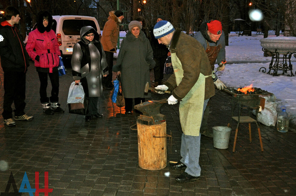 Donbass Blacksmiths Guild activists stage Valentine’s Day shows each year. It is the tenth such show. Before the war, it used to begin at 5:00 a.m ., but then moved to later hours because of the curfew. The blacksmiths did not cancel the celebration even despite active hostilities.