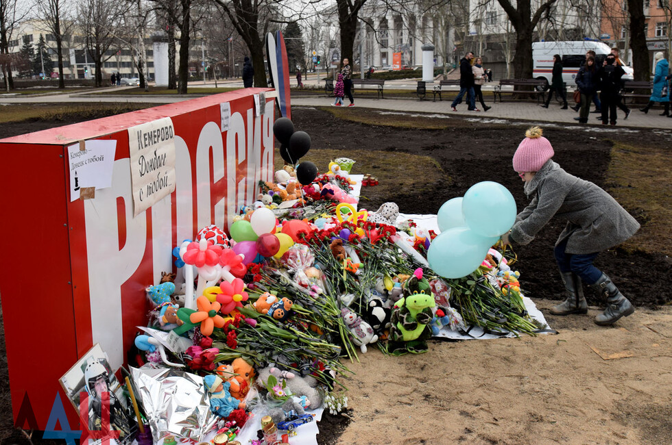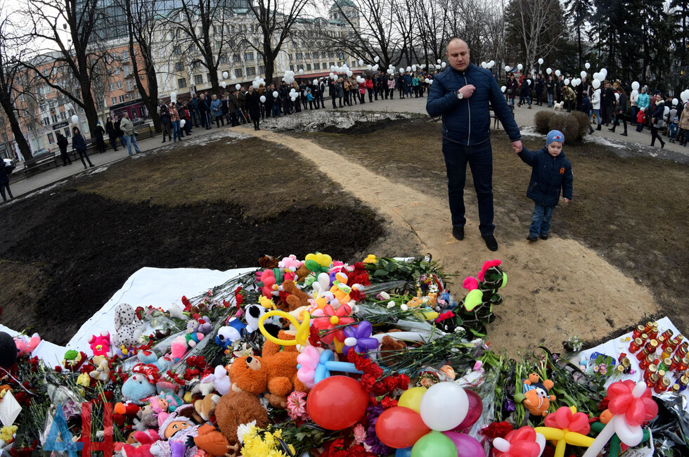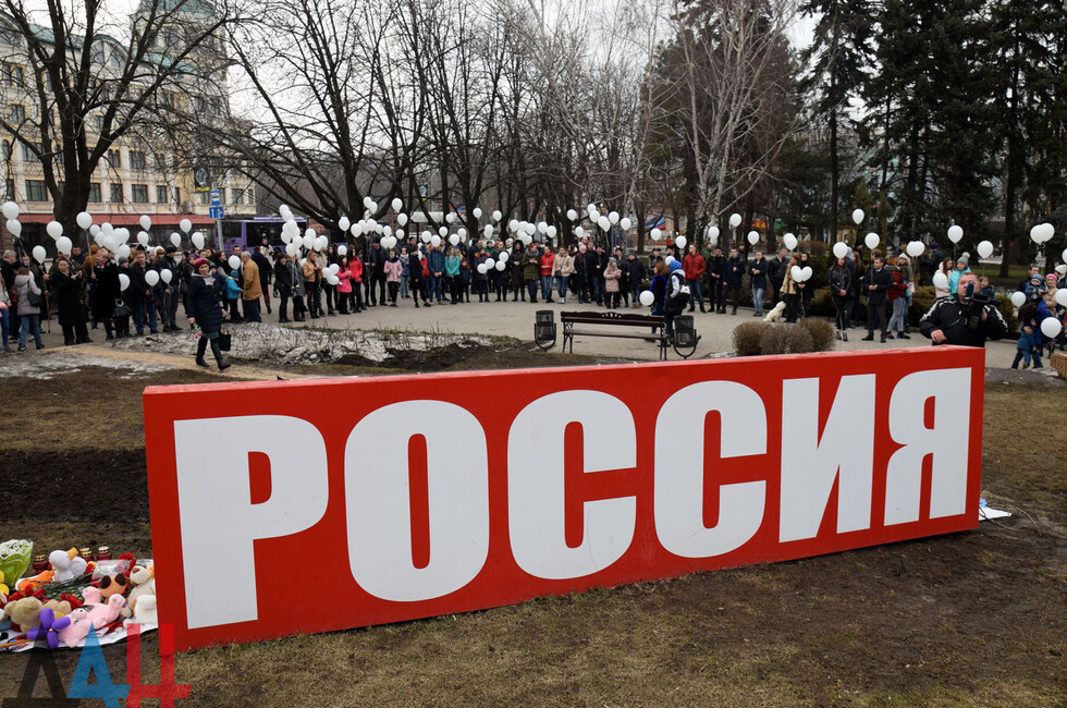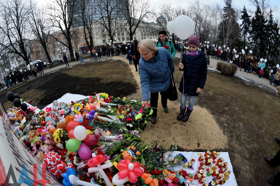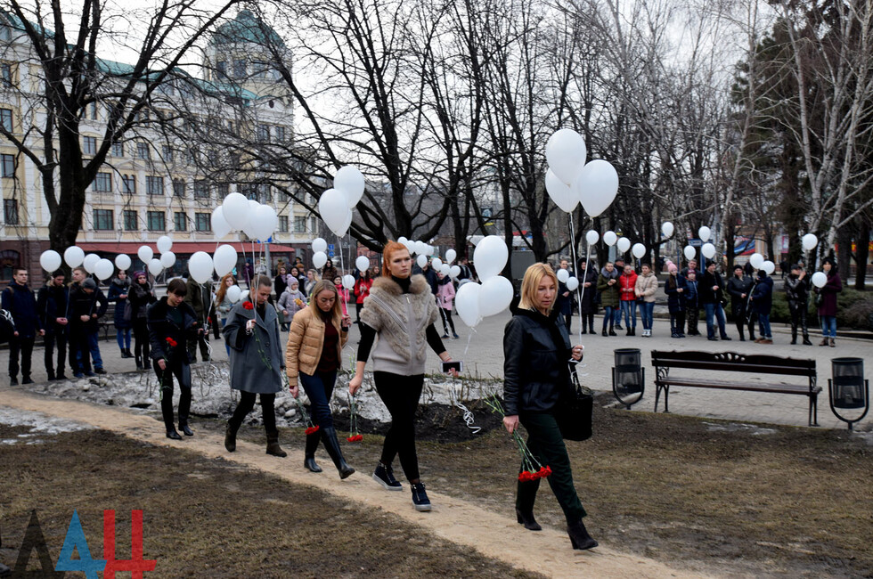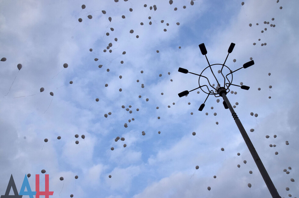 Donetsk residents release white balloons to the air to commemorate Kemerovo fire victims
