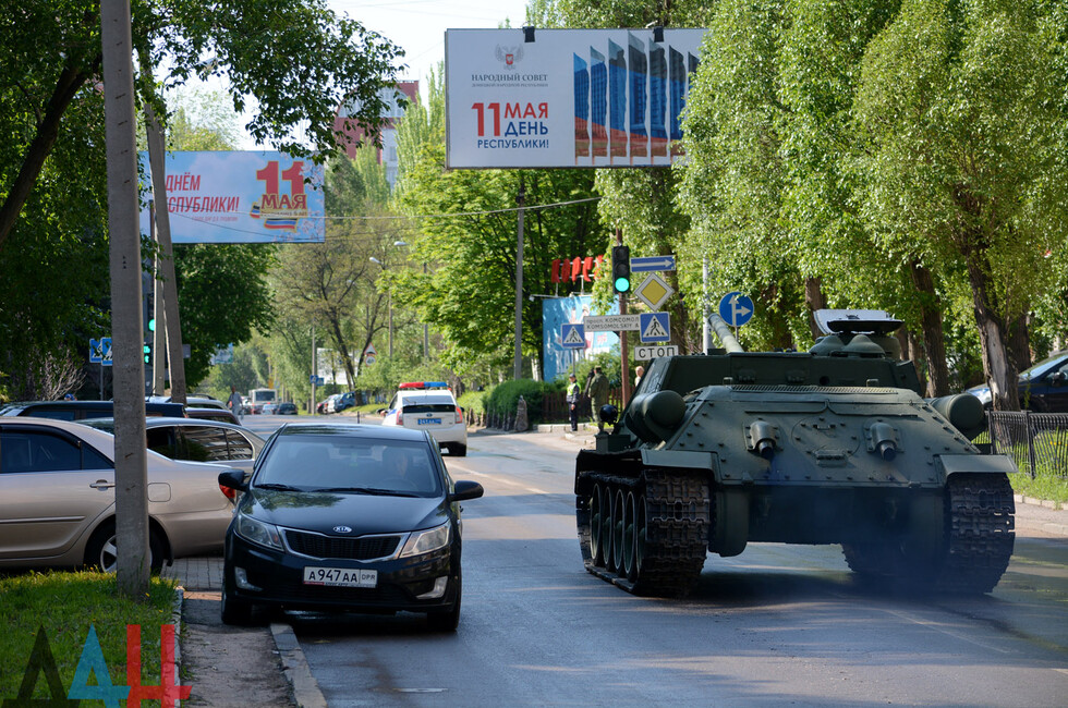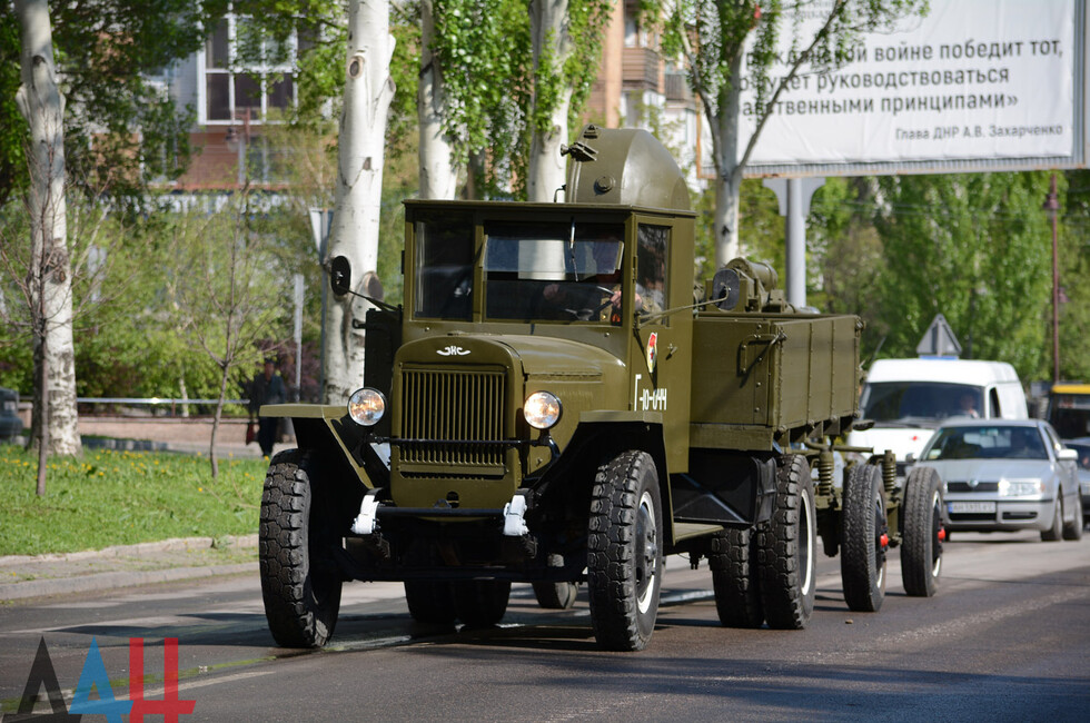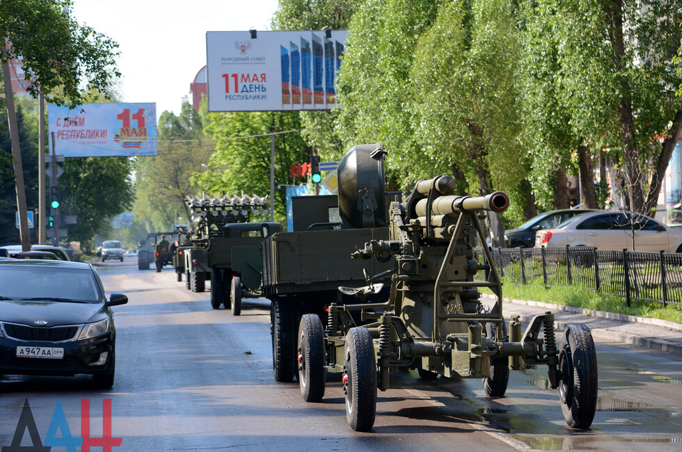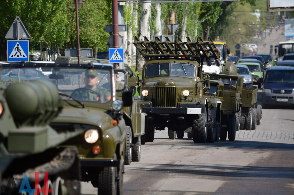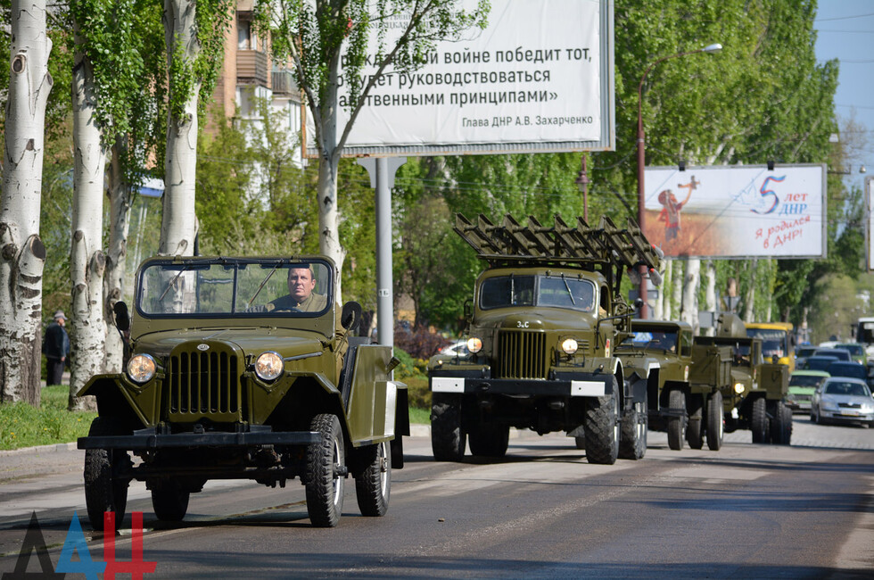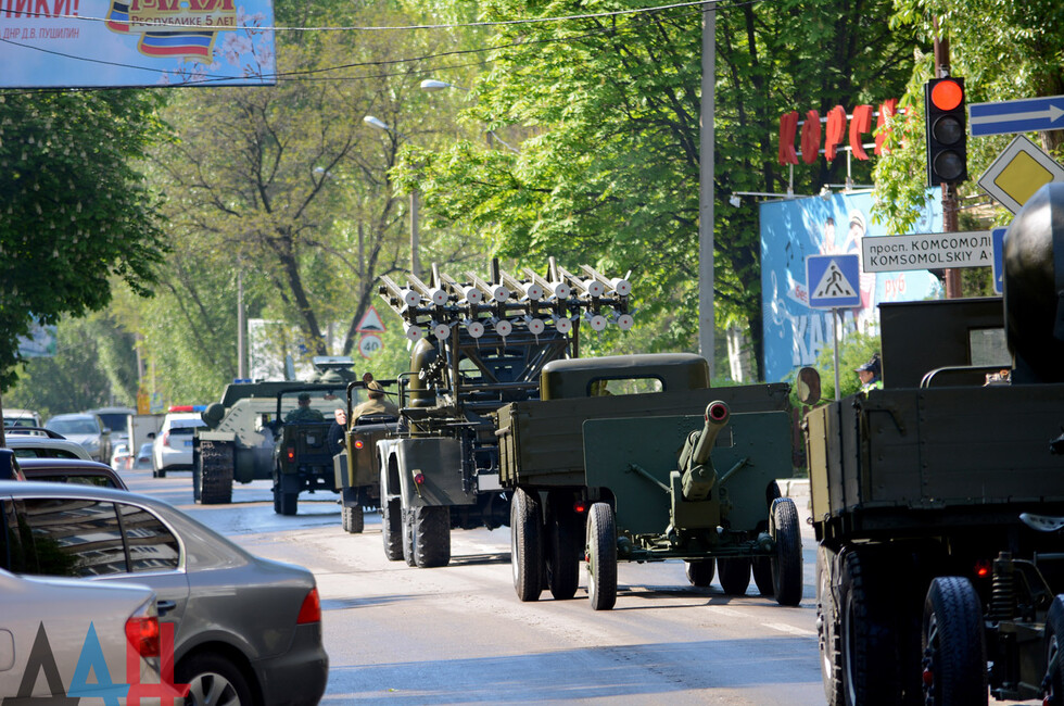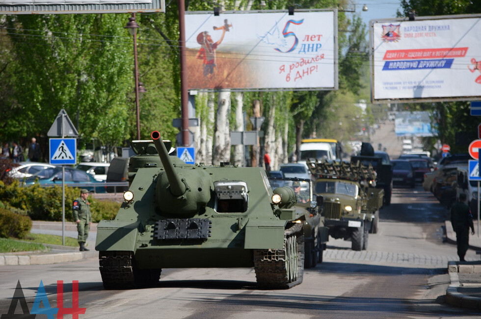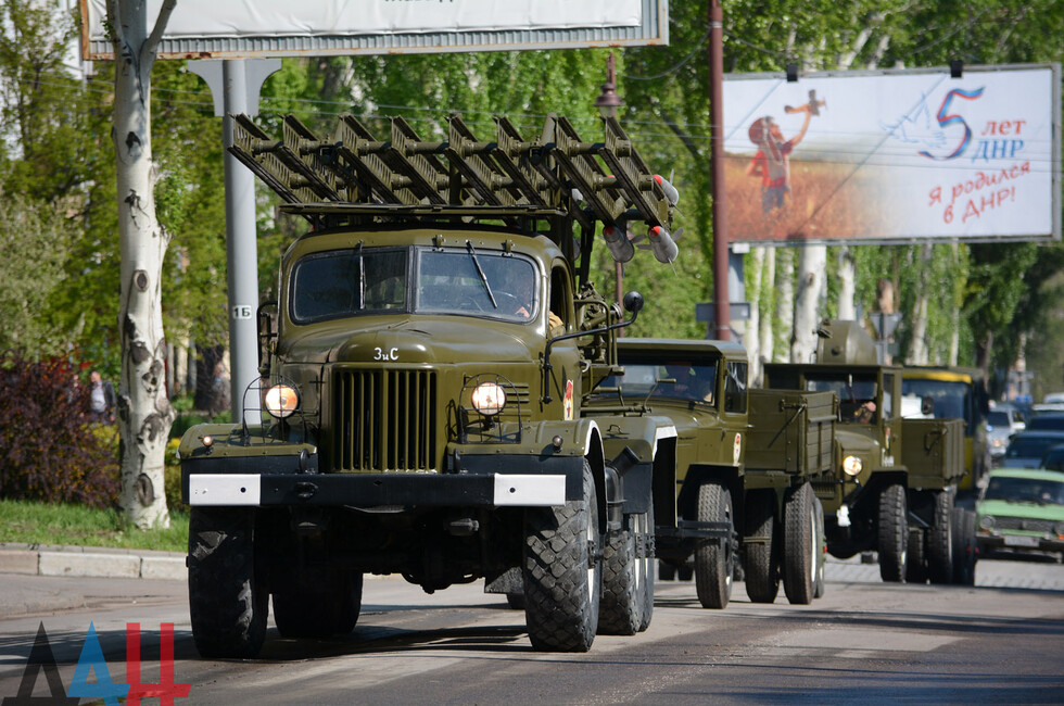 The equipment of the WWII times rode along the central streets of Donetsk, including BM-13 Katyusha multiple rocket launchers, GAZ AA trucks, self-propelled SU-100 tank destroyer, and pieces held by the DPR Army: T-64 and T-72 tanks, IFVs, MLRS Grad, artillery, anti-aircraft guns, etc.