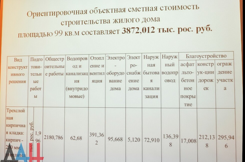 The experts of Donbass National Academy of Construction and Architecture based in Makeevka presented a detailed plan for the reconstruction. Each house cost is set at 3.8 mln RUR, overall 20 residential buildings are to be erected. The total project cost is 120 mln RUR.