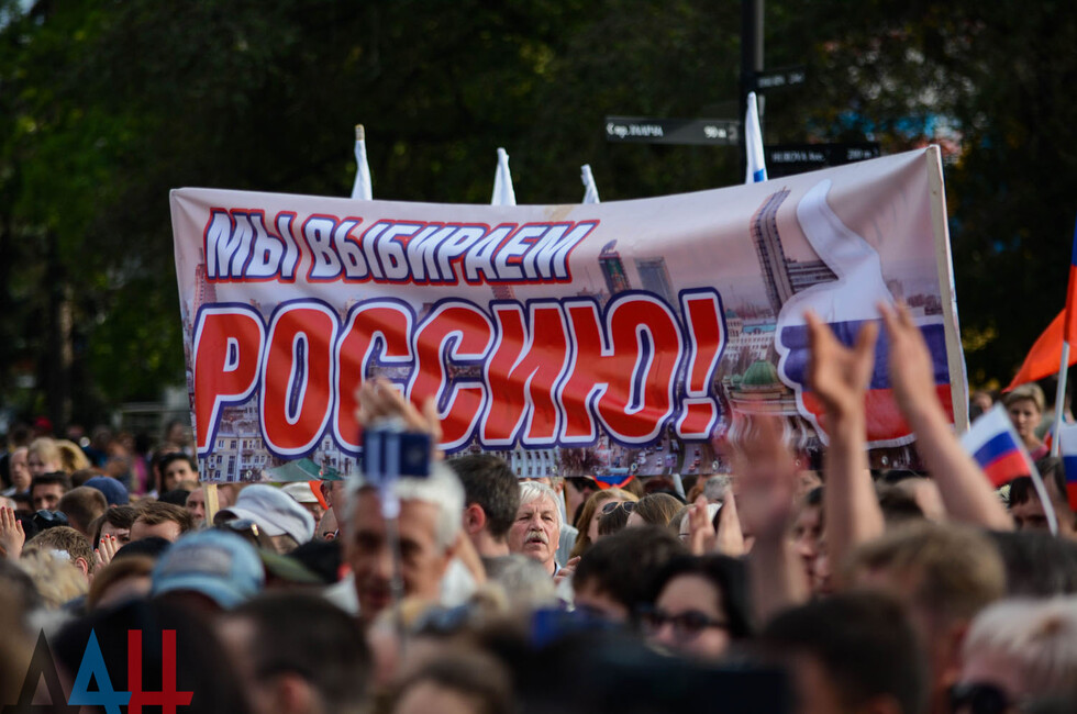 People are carrying Russian flags and many were taking photos with a man-size mock-up of a Russian passport installed in the Pervomaisk square as a nationwide campaign of collecting and filing documents for Russian citizenship is under way.