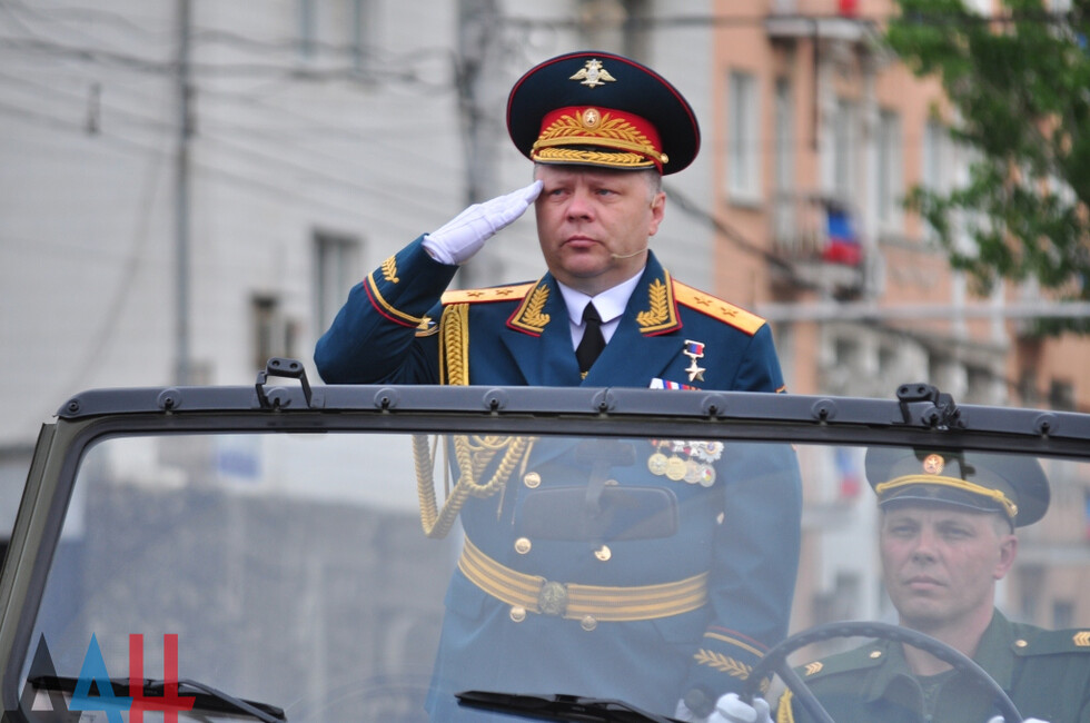 Defense Minister Lieutenant-General Vladimir Kononov inspected the parade. Kononov is a full chevalier of the Saint Nicholas Order. In April 2014 he voluntarily enlisted to the people's militia and assumed command of a company in Slavyansk. He has been into 40-plus military operations, including battles for Slavyansk, Shakhtersk and Ilovaisk.