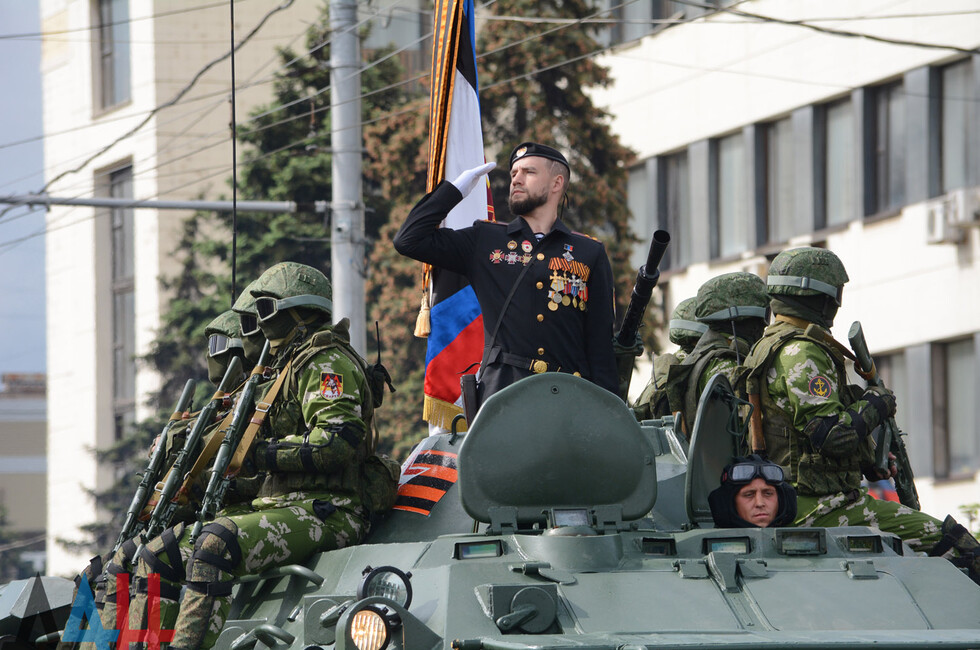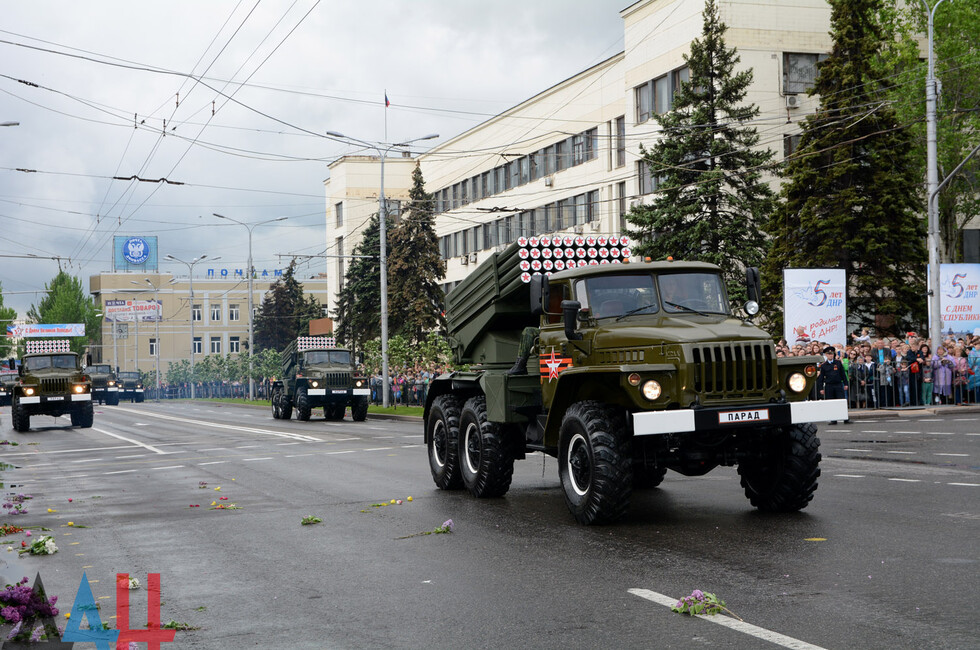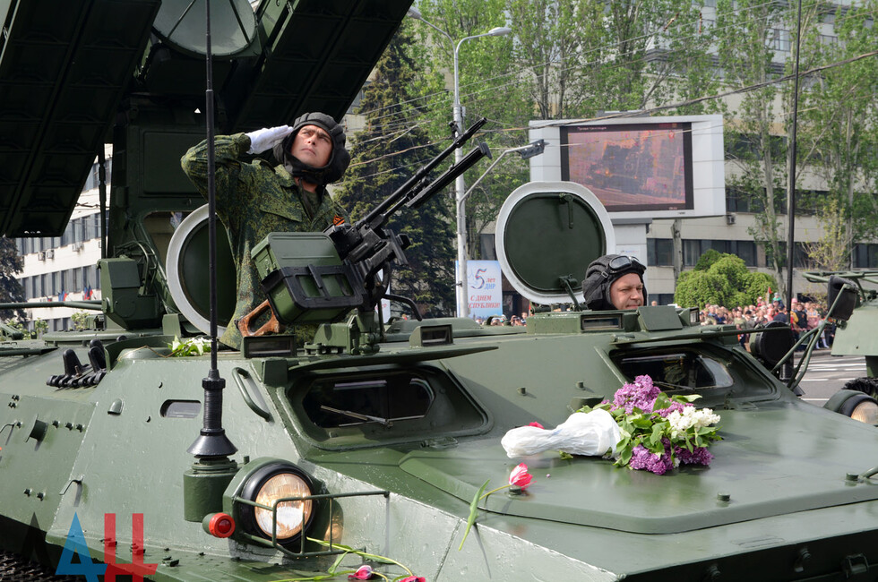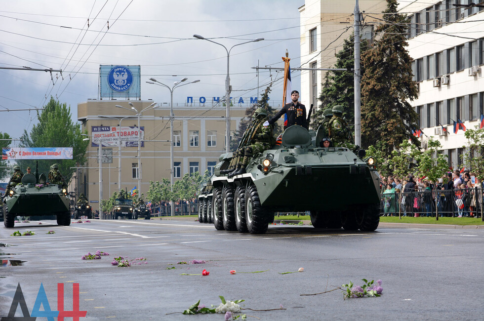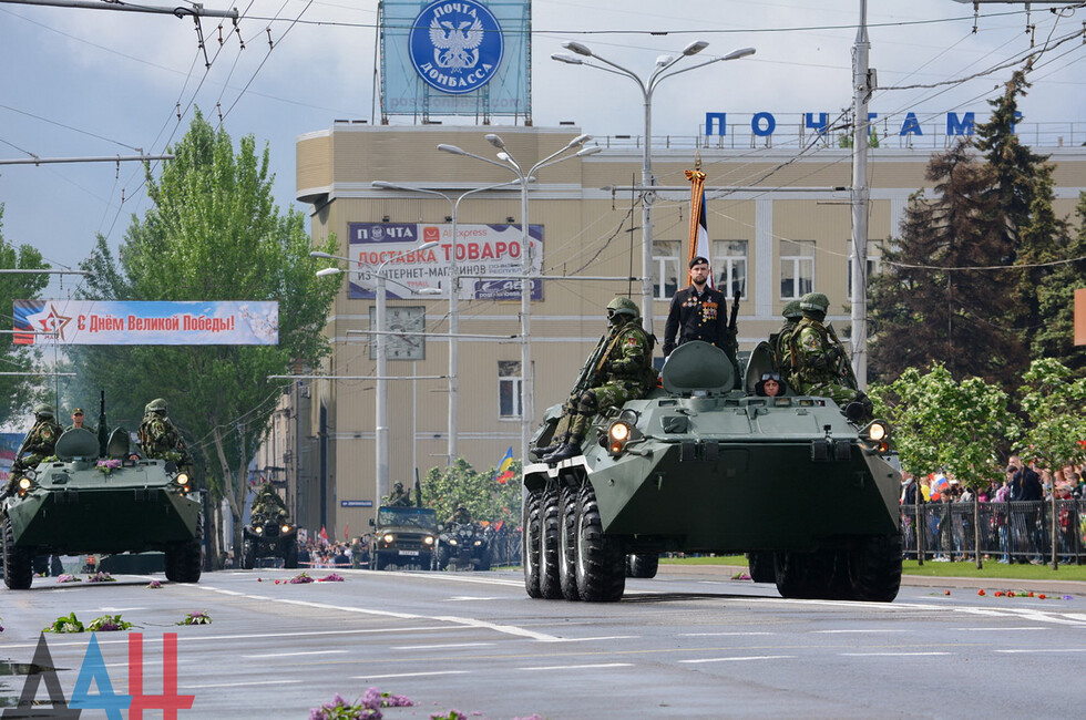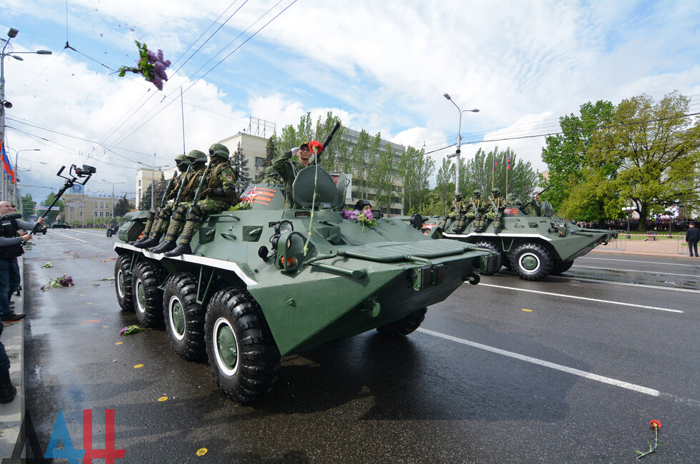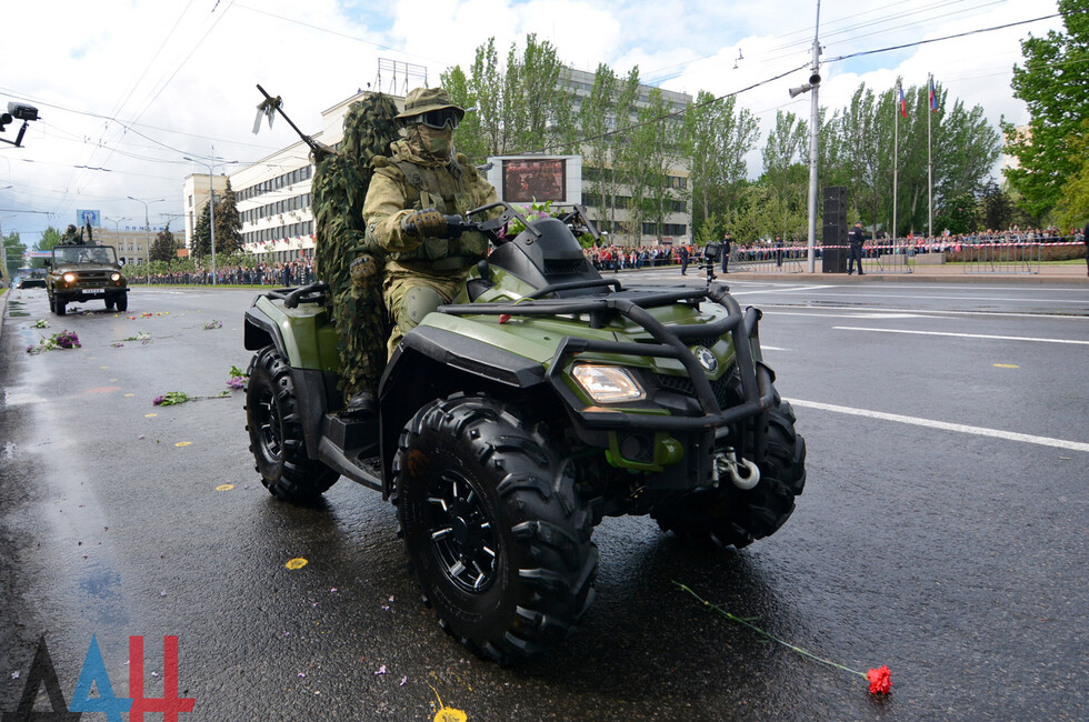 The modern military equipment shown at the parade included BTR-80 armoured personnel carriers of the Jaguar rapid response force which was once commanded by DPR hero Arsen Pavlov (call sign Motorola). Snipers on quad bikes, armed with DPR-designed Donchanka rifles, a DPR anti-sabotage unit, were in the rear of the column.