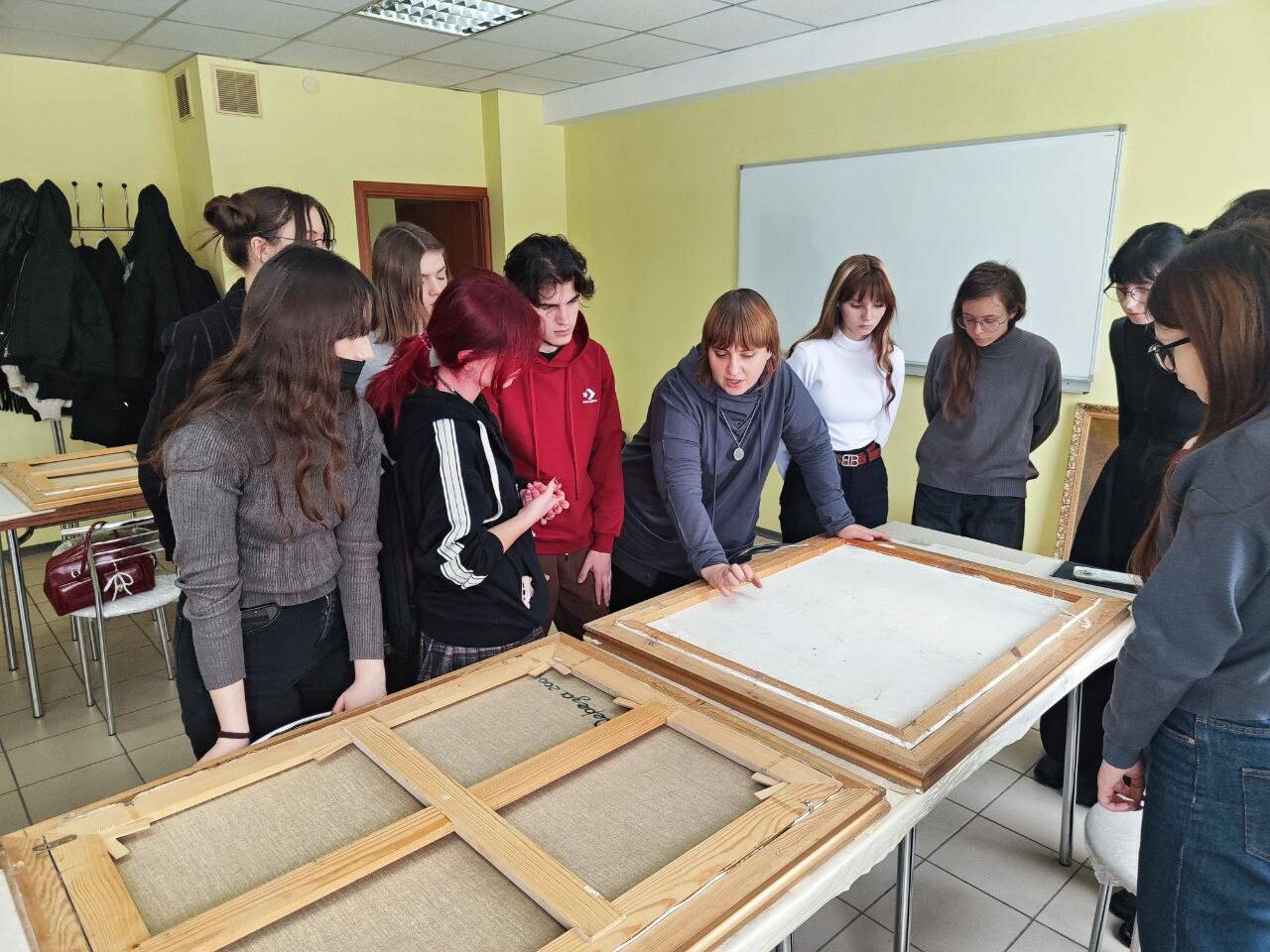 «Будет обеспыливание лицевой стороны, там, где есть прорывы, будет стыкование прорывов, там, может быть, восполнение утрат холста, где есть такие утраты. Красочный слой будут учить укреплять, грунт. То есть будут учить, как правильно обеспыливать тыльную сторону картины», — рассказывает Портнова о программе реставрационного практикума.