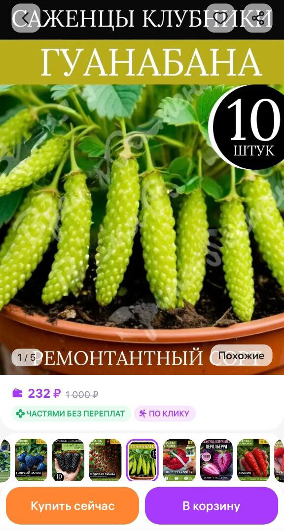 Множество предложений о продаже семян несуществующих растений появились на торговых площадках в преддверии дачного сезона. Среди них, например, «клубничное дерево», которое продавец описывает как «самоплодный летний сорт, устойчивый к морозам и дающий крупные ягоды». Утверждается, что дерево вырастает до 2,6–2,8 метра. Также активно рекламируется «синий ремонтантный сорт клубники» с весом ягоды до 50 граммов, «синяя клубника-земляника Ампельная», которая якобы плодоносит круглый год, и «малинно-клубничное дерево».