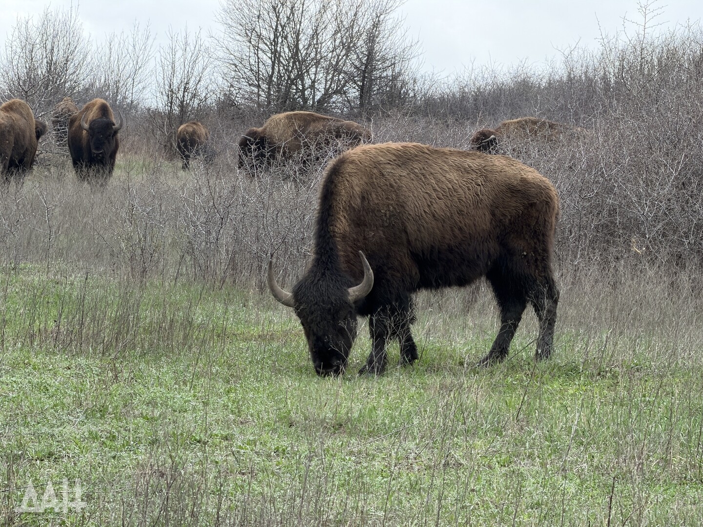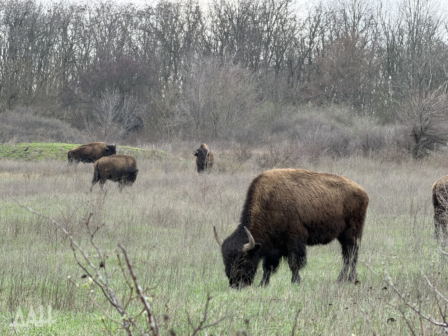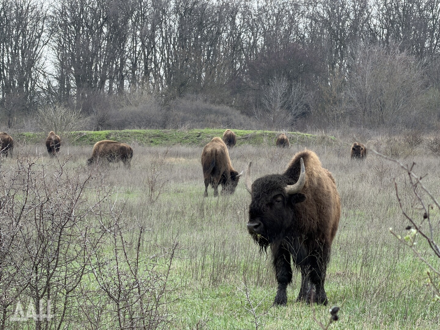 Он добавил, что бизонов привезли в ландшафтно-рекреационный парк «Донецкий кряж» в конце 2000-х по инициативе сельхозпредприятия, расположенного в селе Тараны. Предприятие было основано в 2007 году, занималось разведением КРС и сельхозкультурами, а также «осуществлением охотничьей деятельности, включающей адаптацию редких видов животных к климатическим условиям степного Донбасса». Животных привезли из заповедника «Аскания-Нова», специалисты которого помогали в адаптации степных гигантов. За два года в донецком крае поселились семь особей. Раз в полгода к ним приезжали ученые из заповедника, чтобы проведать подопечных и составить заключение, насколько успешно они прижились. Конфликт 2014 года разделил два региона, и сотрудничество прекратилось.