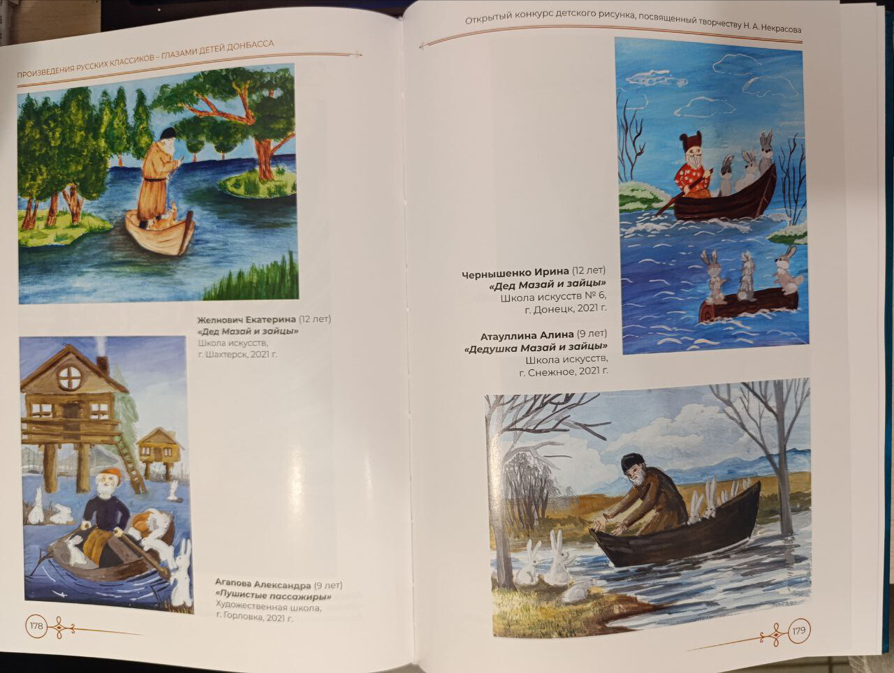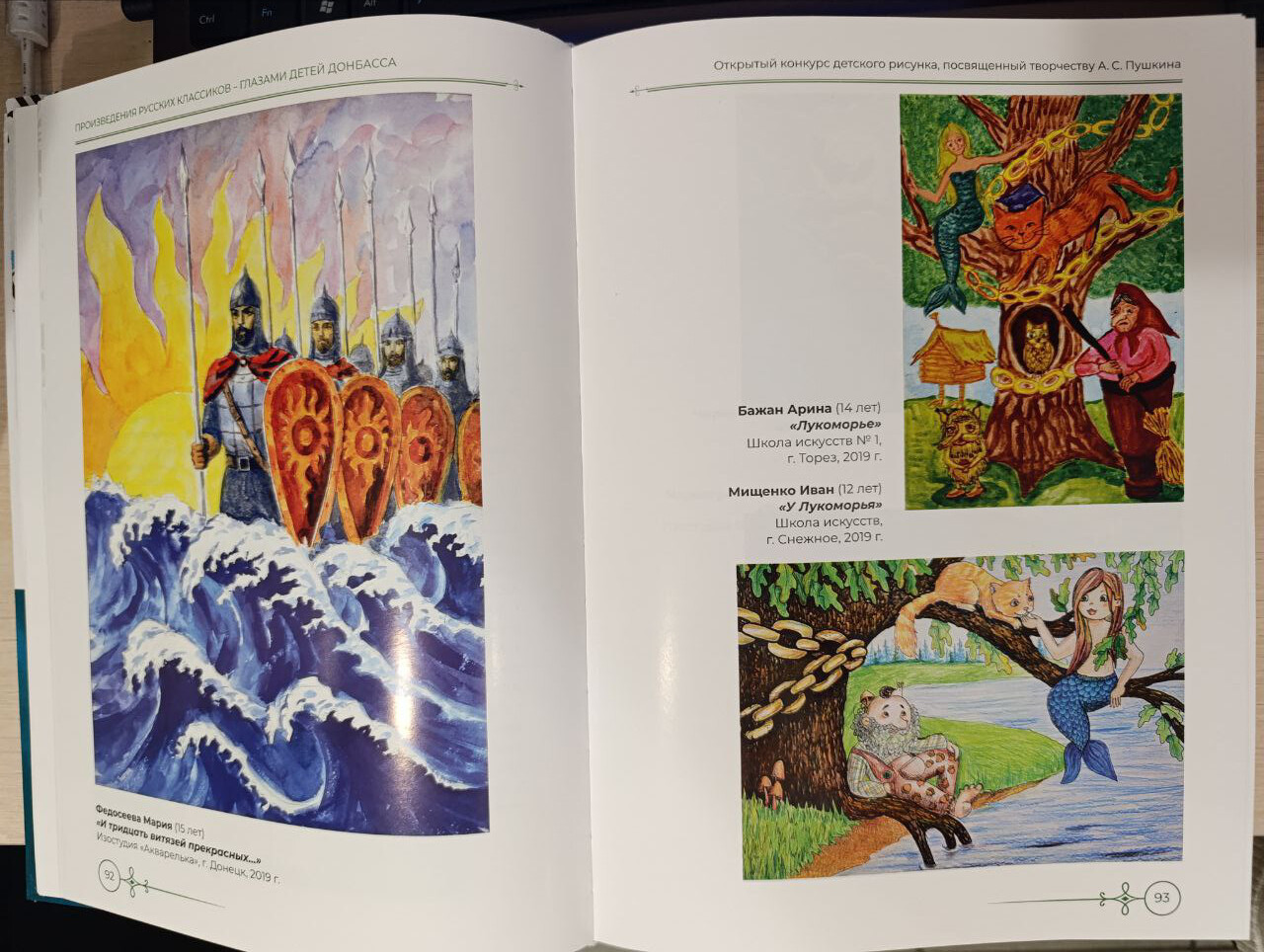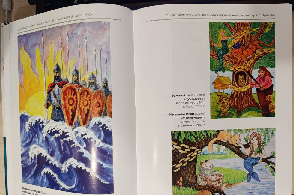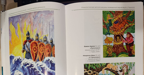 Там отметили, что в книгу вошли фотографии работ от детей Донбасса и Новороссии, которые представляют собой их художественное видение представителей русской классики и их произведений. В частности, речь идет о творчестве Пушкина, Чехова, Тургенева, Некрасова, Чуковского, Пришвина, Прокофьева и других. Эти картины были нарисованы с 2016 по 2024 годы в рамках одноименных конкурсов.