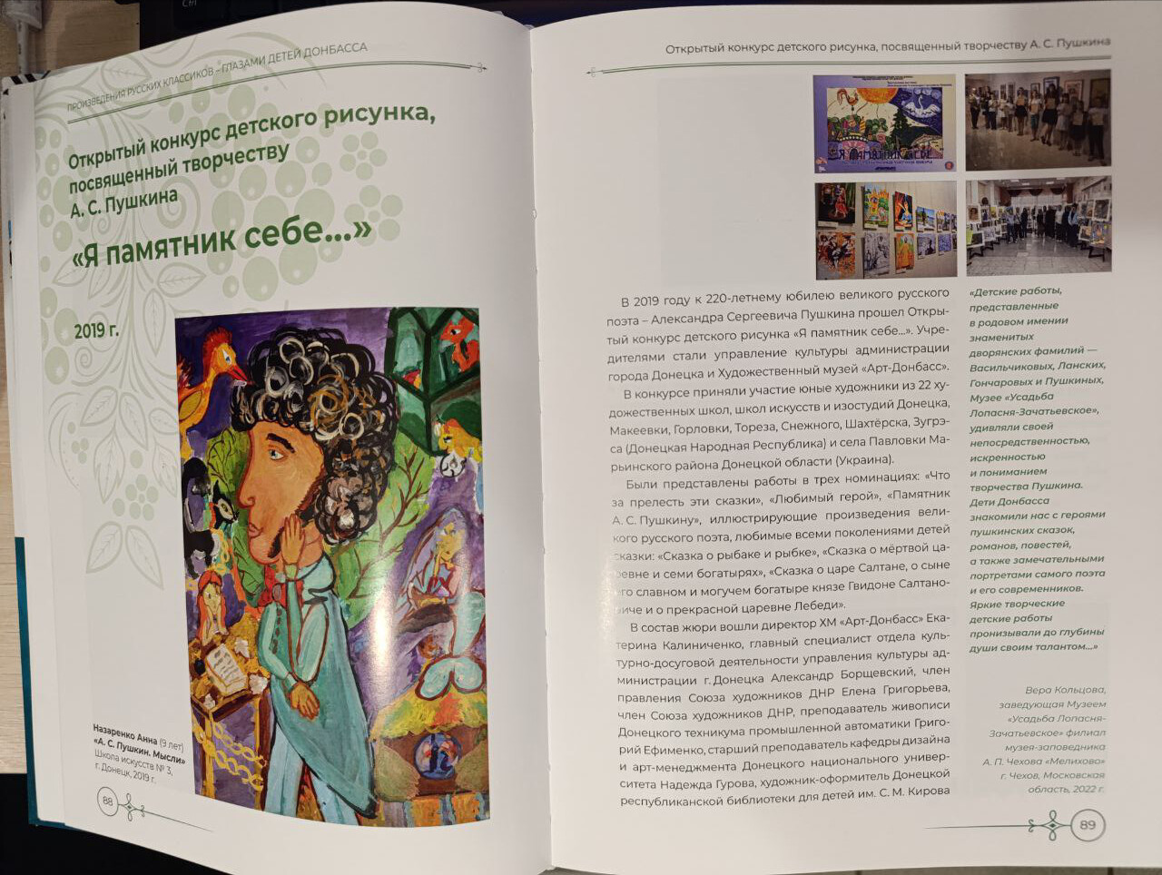 «Альбом „Произведения русских классиков — глазами детей Донбасса“ — это уникальное издание, которое поможет продлить жизнь рисунков, выполненных ребенком в определённый период его жизни. Это возможность максимально снизить эмоциональный разрыв, между детьми одного возраста на освобожденных территориях с их сверстниками из Российской Федерации и, в частности, ДНР, связь с которыми была насильно прервана с 2014 года», — подчеркнули в музее.