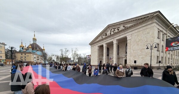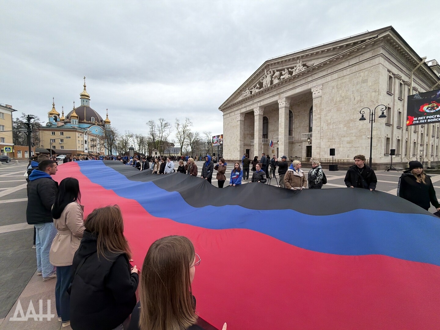 Так, сегодня утром у восстановленного Мариупольского драматического театра активисты «Молодой Гвардии» ДНР растянули Республиканский триколор длиной в 200 метров. Это сопровождалось под песню «Донбасс за нами», которую вживую исполнила заслуженная артистка ДНР Маргарита Лисовина.