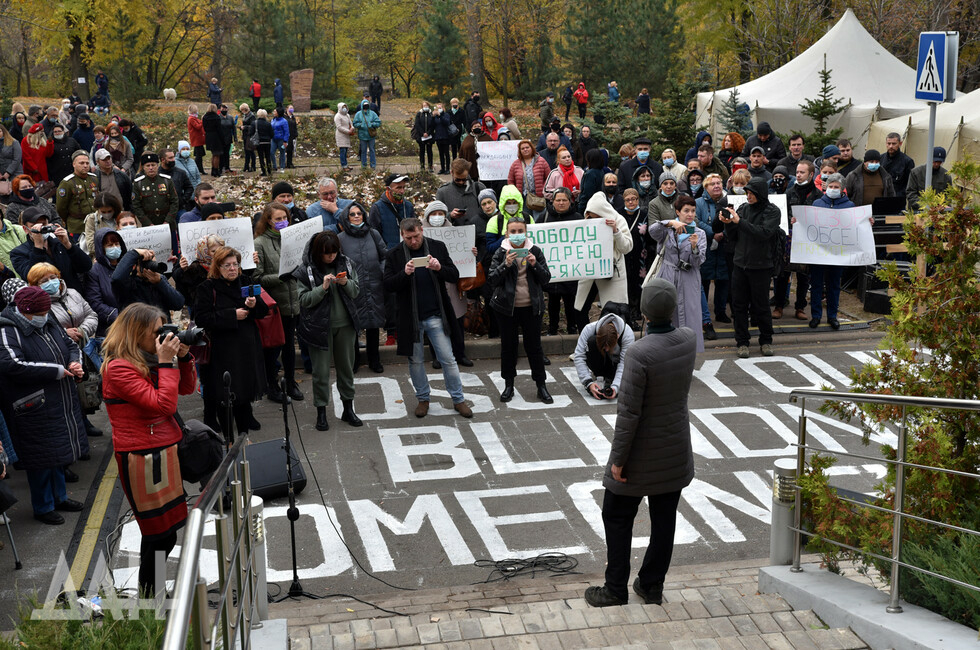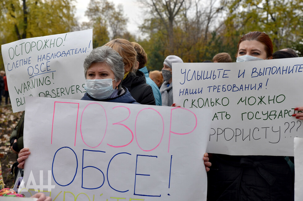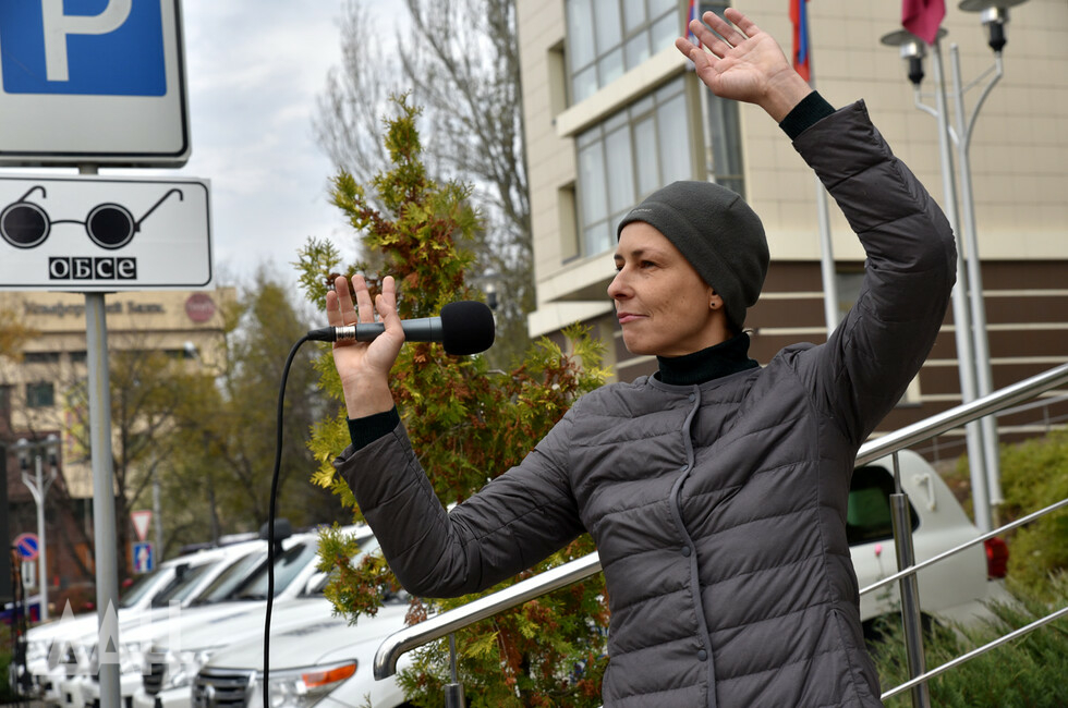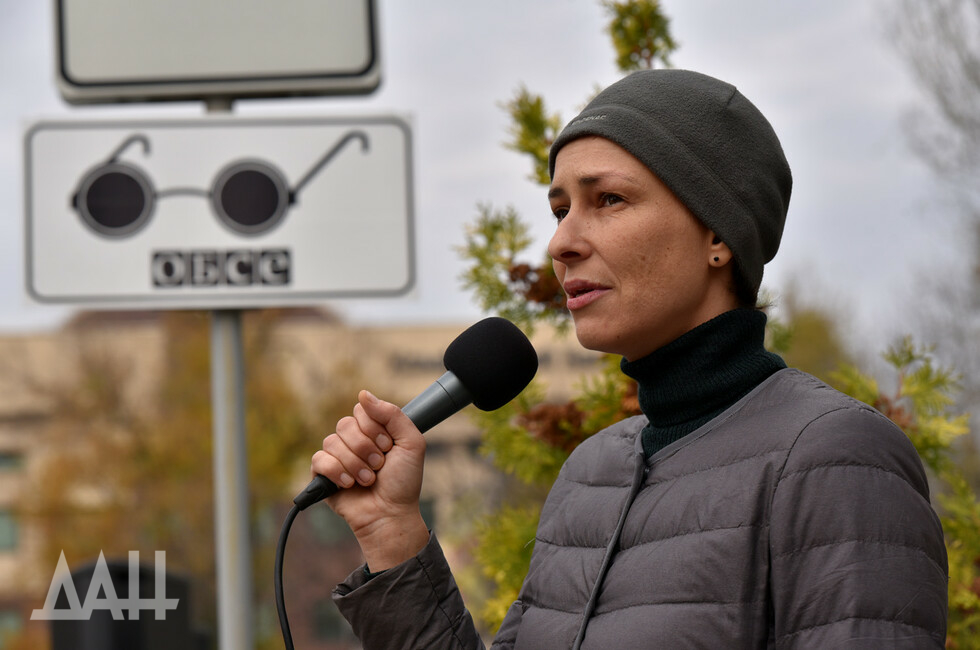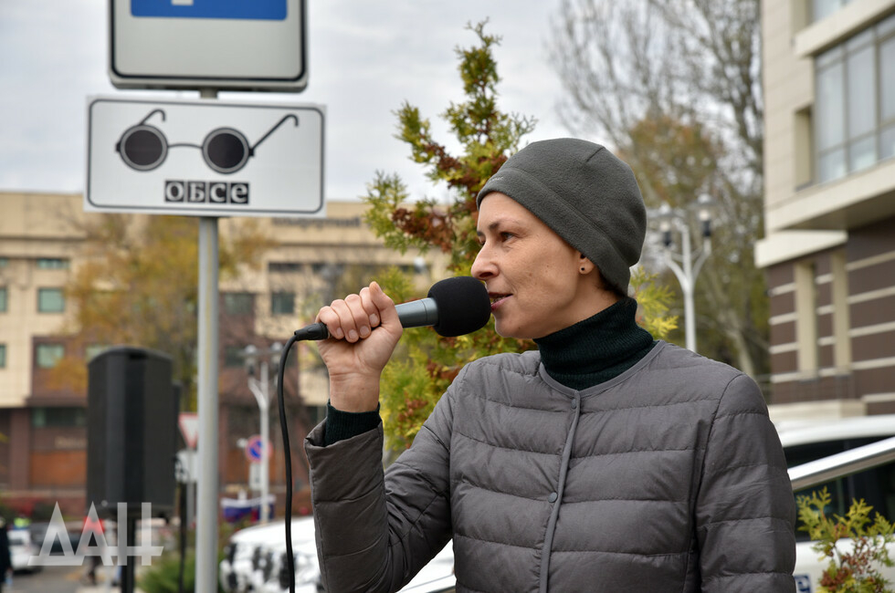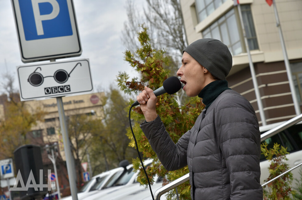 Сегодня она пела на протестной акции в поддержку захваченного украинскими боевиками наблюдателя ЛНР в СЦКК Андрея Косяка. Вооруженное нападение на него произошло 13 октября во время согласованных с украинской стороной в СЦКК работ по очистке дороги у КПВВ «Первомайск-Золотое». Это привело к пикетам у штаб-квартир СММ в Донецке и Горловке, где граждане протестуют против бездействия ОБСЕ.