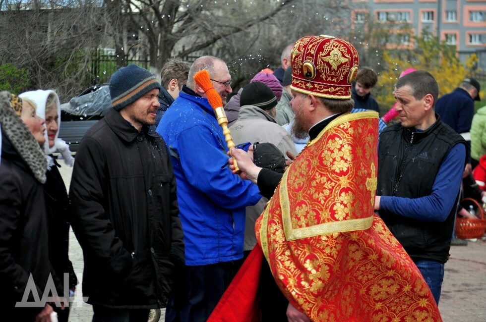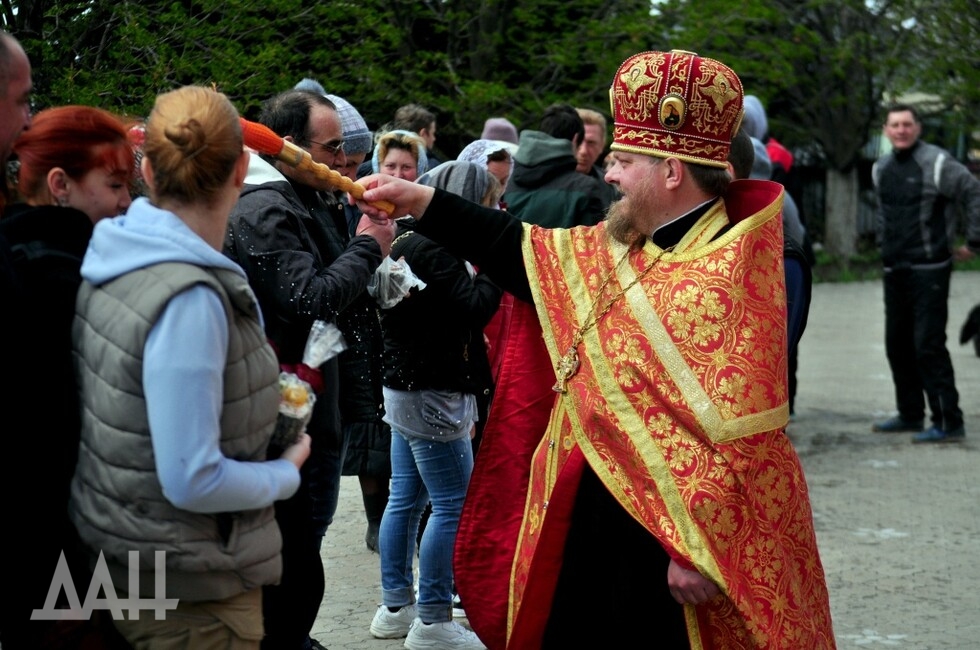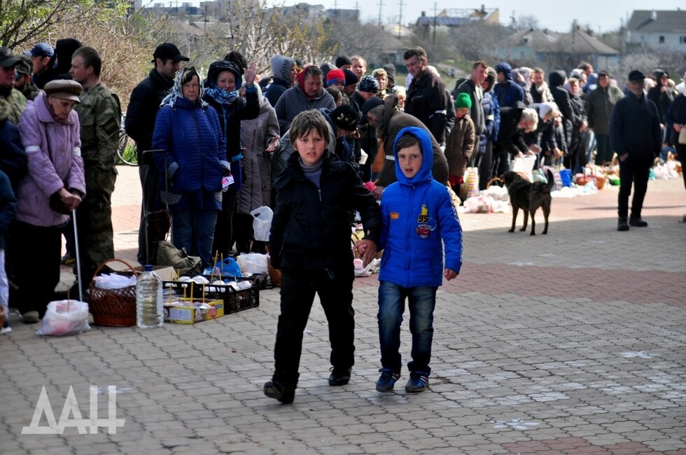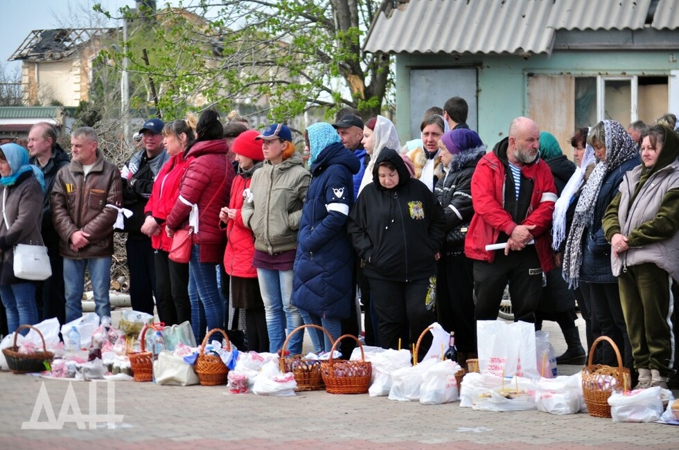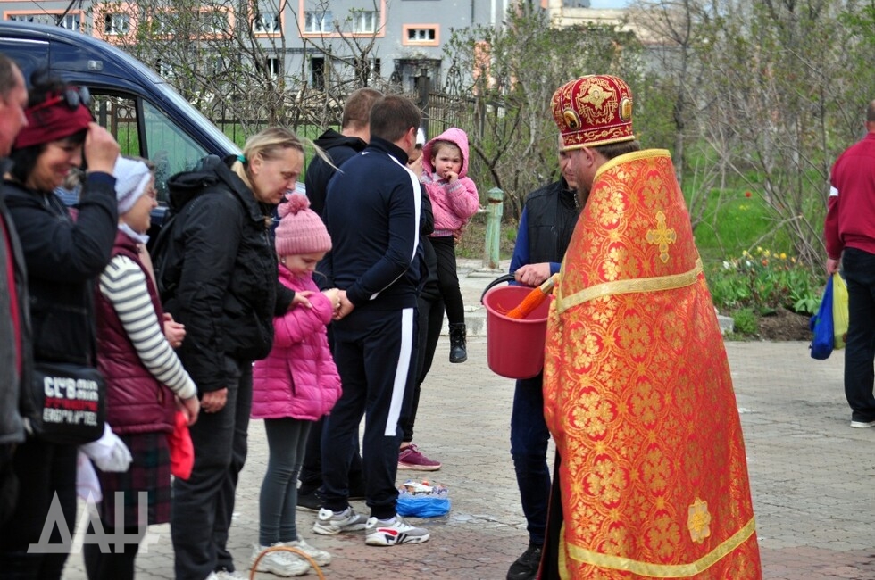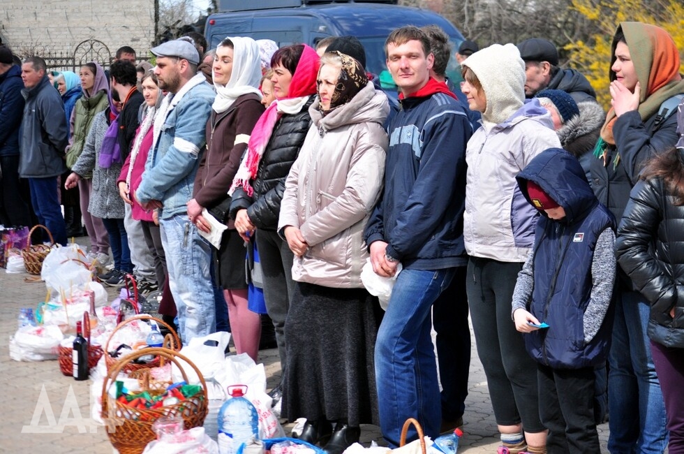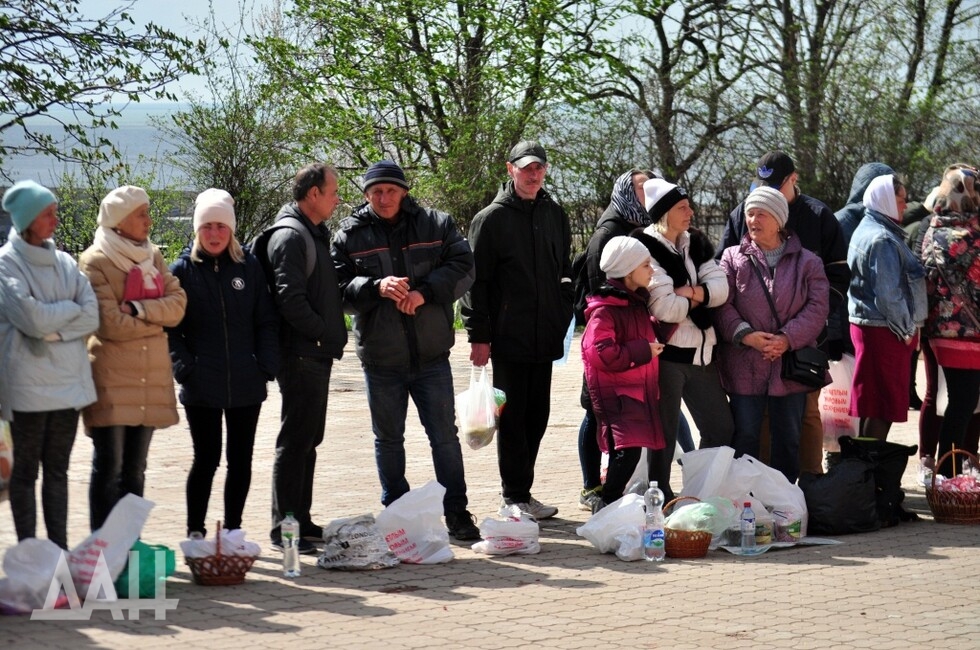 У храма можно было увидеть людей самых разных возрастов – от младенцев, до стариков. Были там и военнослужащие Народной милиции. Надо сказать, что у большинства мариупольцев нет никакой возможности испечь пасхальные куличи, или купить их. Поэтому на территории храма паски раздавались бесплатно. Их доставила делегация из России.