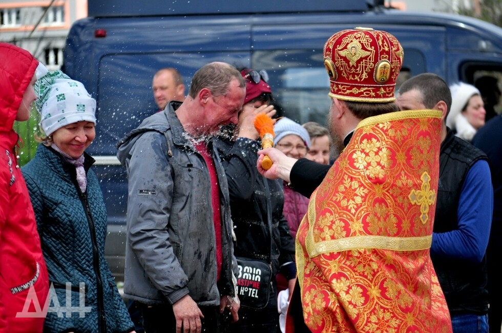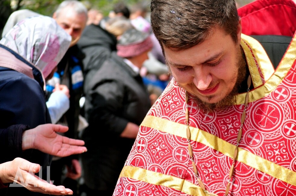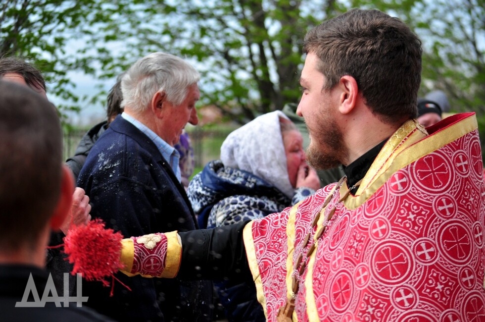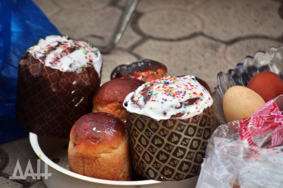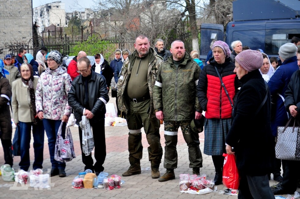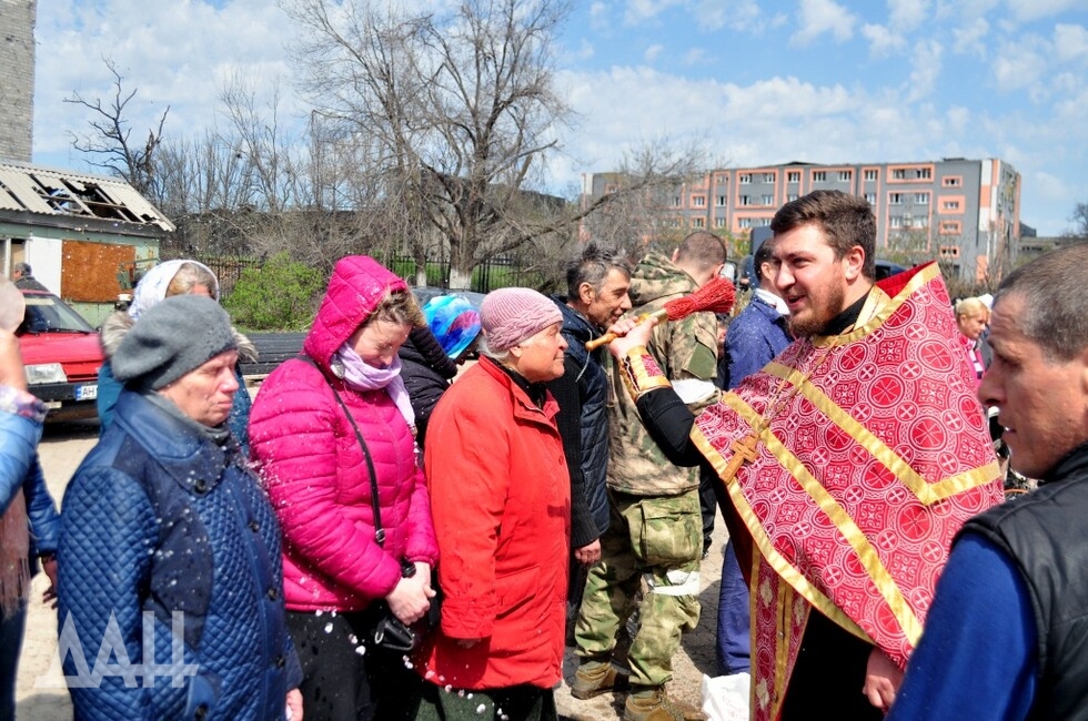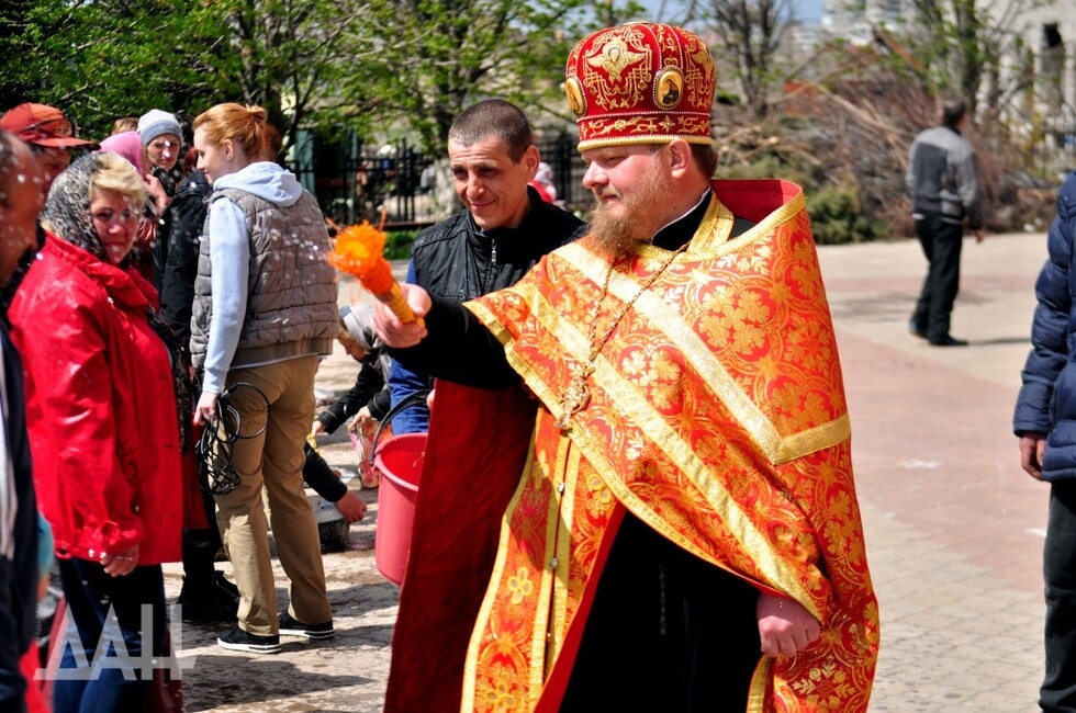 У храма можно было увидеть людей самых разных возрастов – от младенцев, до стариков. Были там и военнослужащие Народной милиции. Надо сказать, что у большинства мариупольцев нет никакой возможности испечь пасхальные куличи, или купить их. Поэтому на территории храма паски раздавались бесплатно. Их доставила делегация из России.