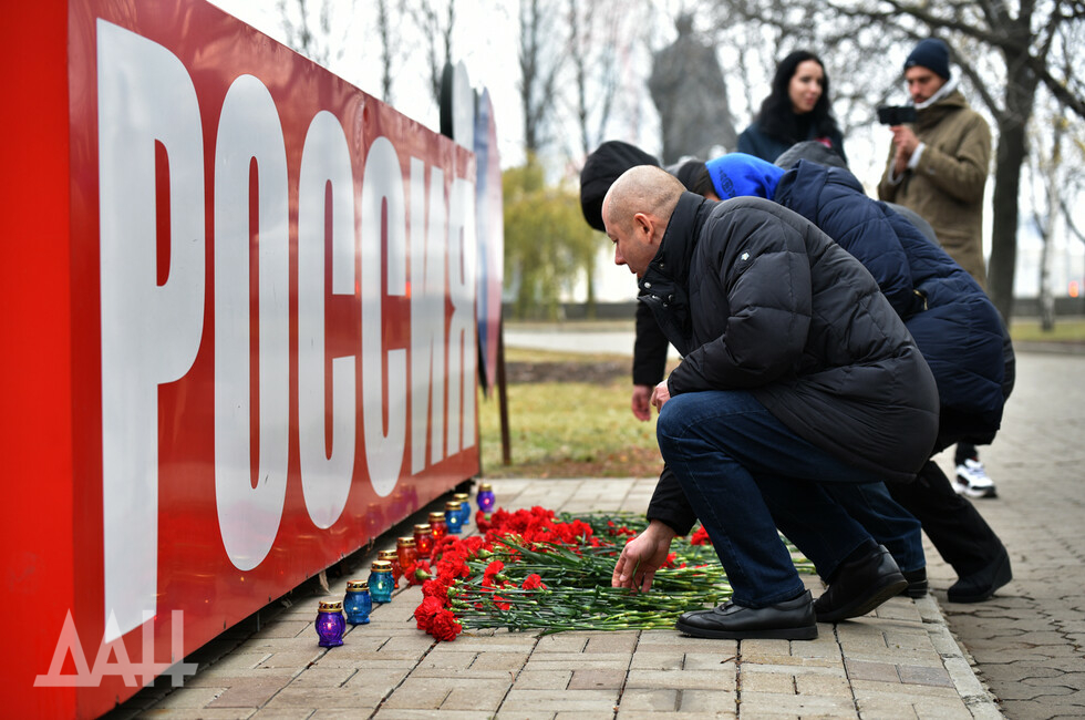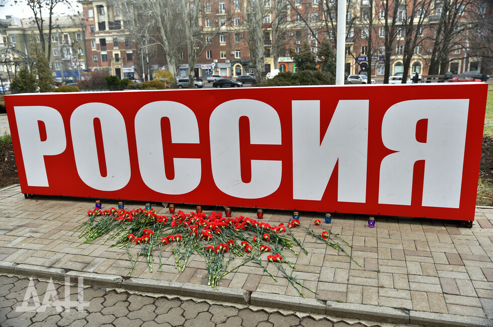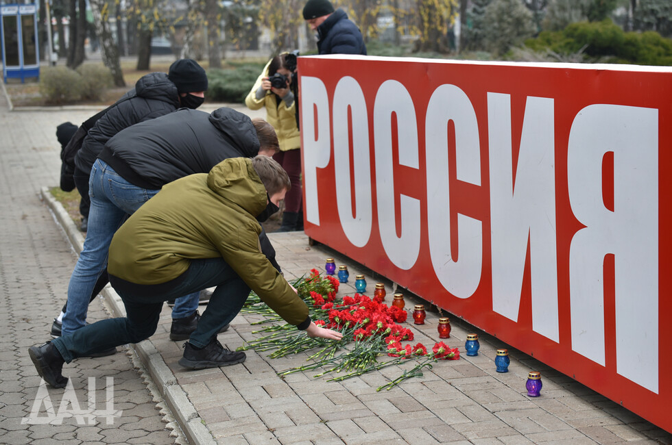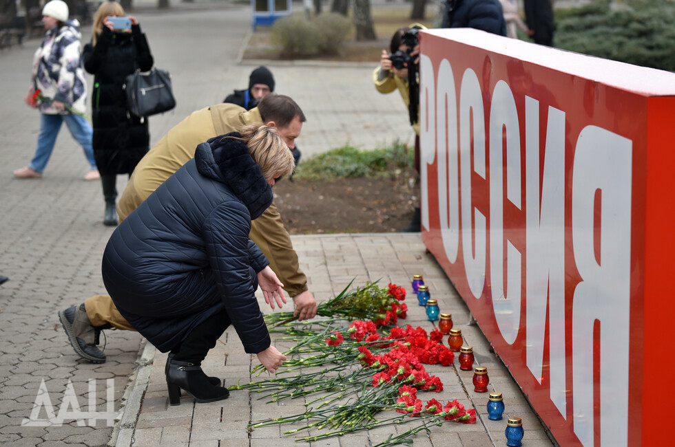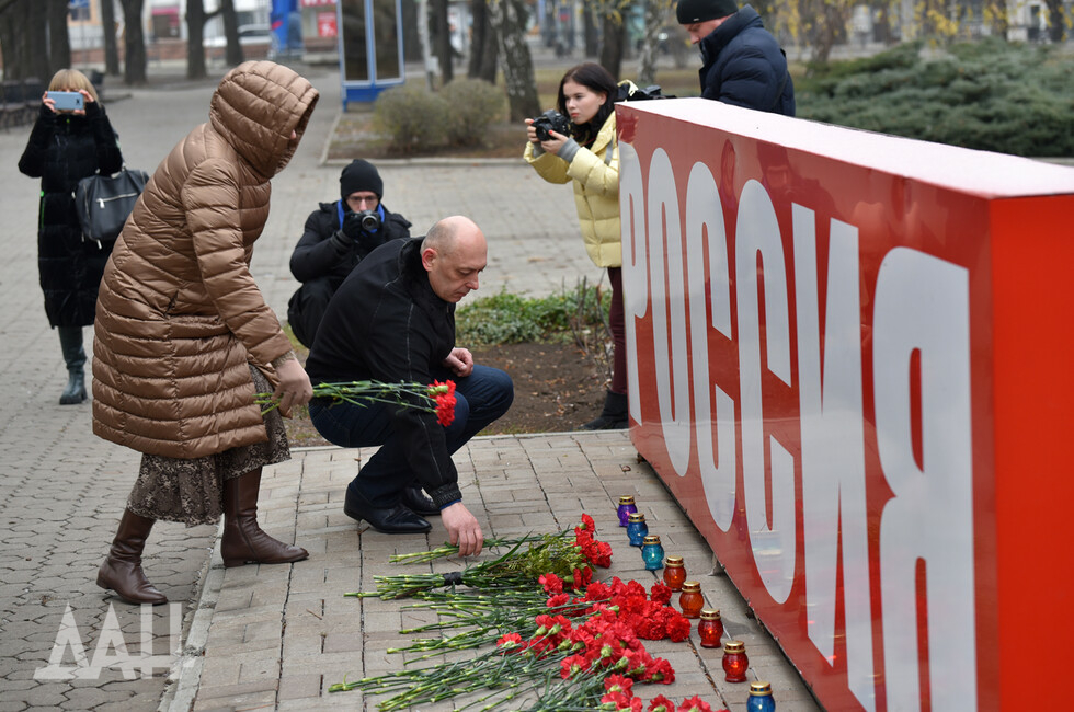 Донецк, 26 ноя – корр. ДАН. Знак «Россия» возле площади Ленина в центре Донецка сегодня стал временным мемориалом. Туда жители и гости города несут цветы в память о погибших в результате трагедии на шахте в Кемеровской области.