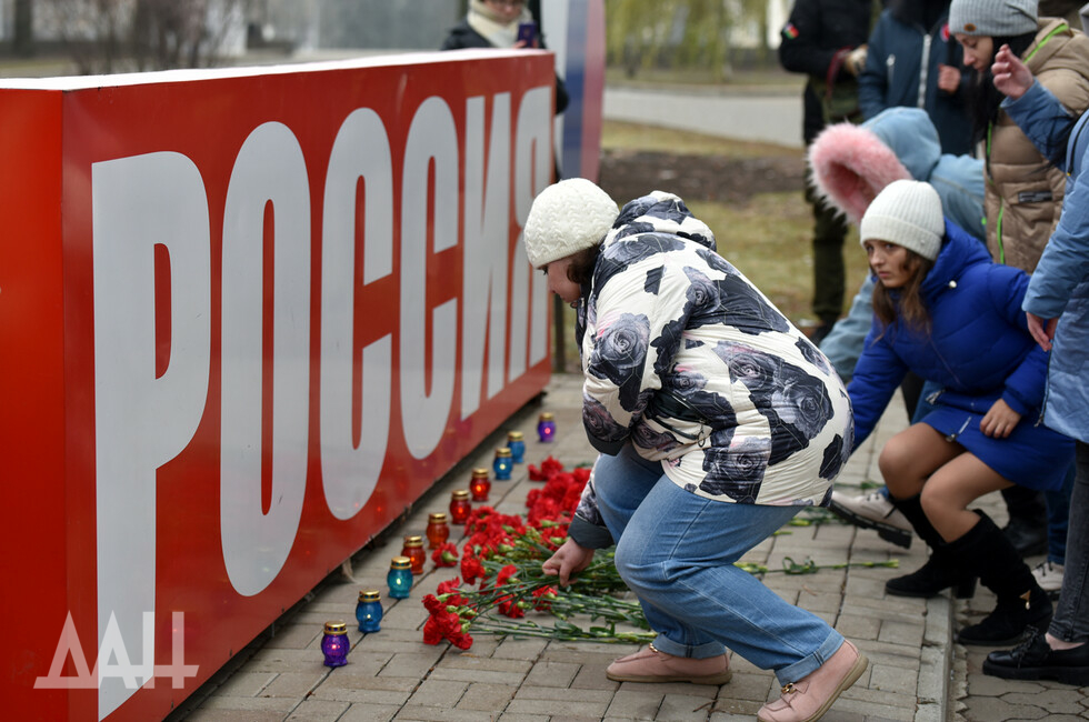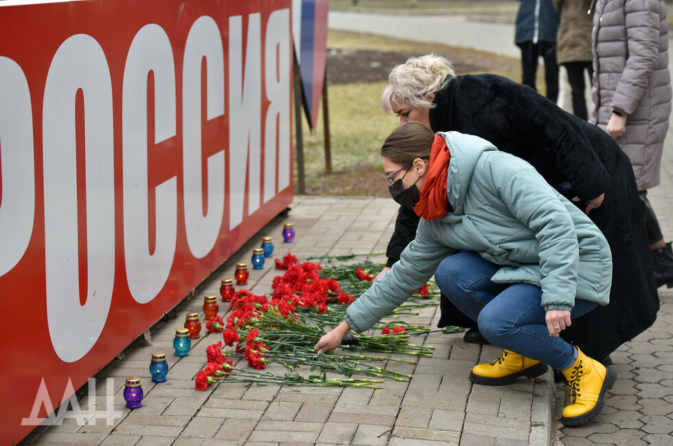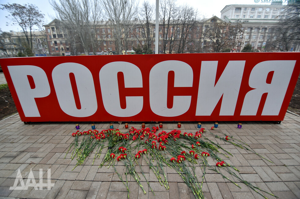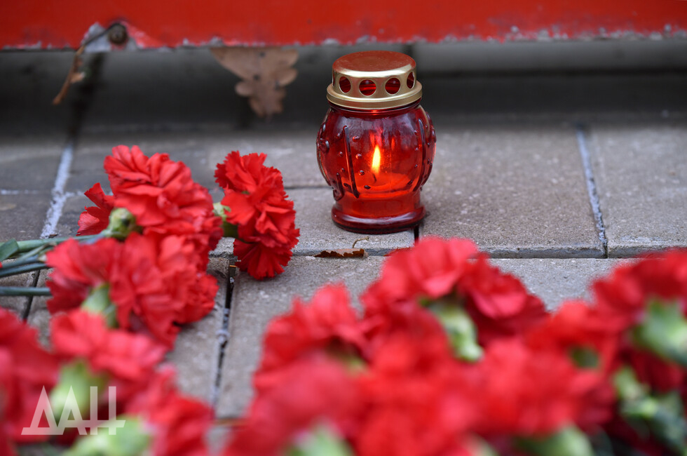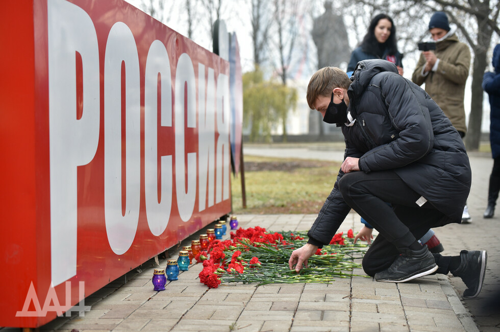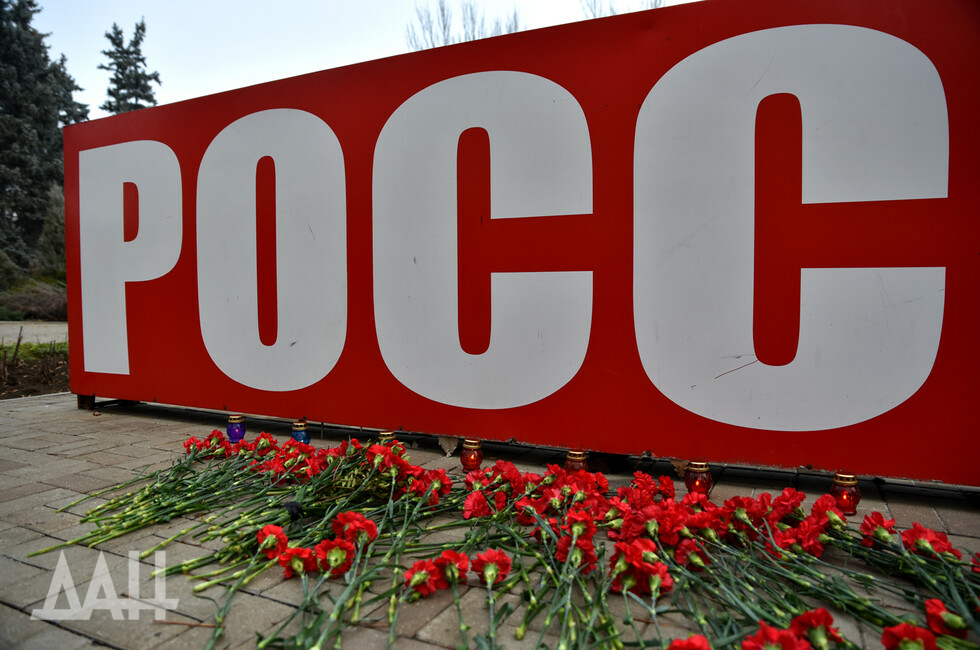 Донецк, 26 ноя – корр. ДАН. Знак «Россия» возле площади Ленина в центре Донецка сегодня стал временным мемориалом. Туда жители и гости города несут цветы в память о погибших в результате трагедии на шахте в Кемеровской области.