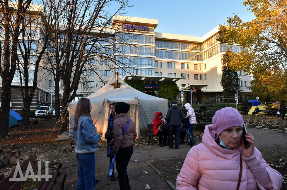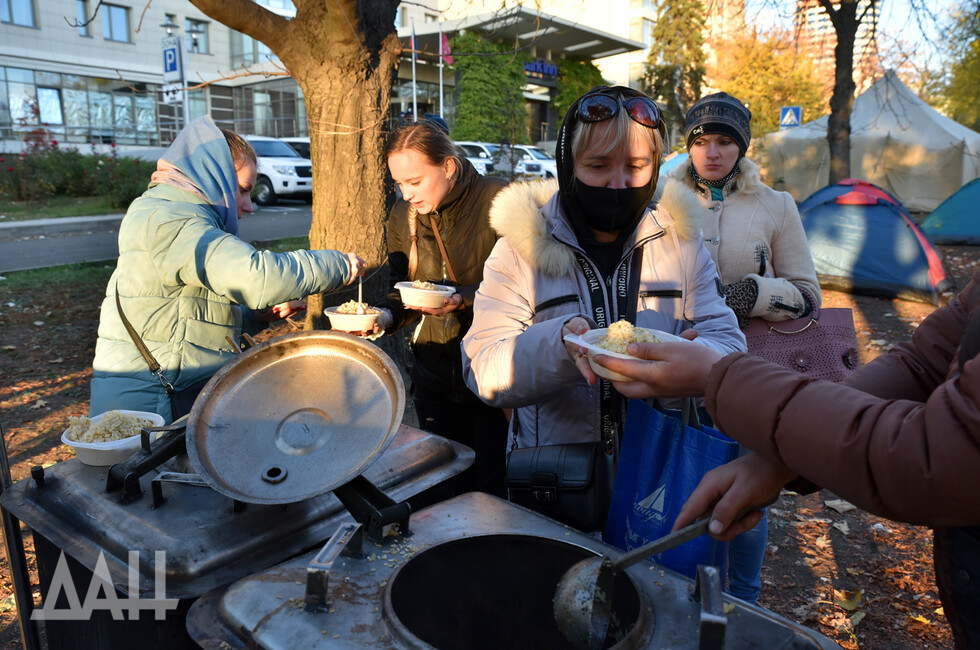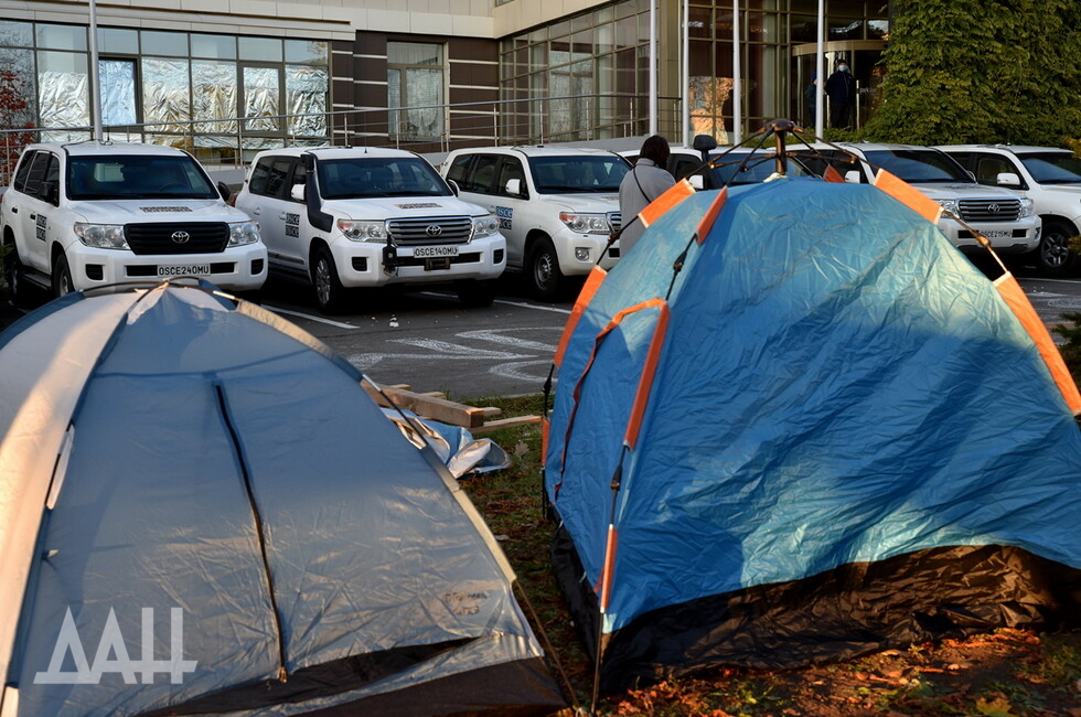 Обстановка на территории палаточного городка сохраняется спокойная. Протестующим раздают теплый чай, также работает полевая кухня. Участники митинга, как и в прошлые дни, выступают с заявлениями в адрес ОБСЕ на импровизированной сцене, включают патриотическую музыку и стоят с плакатами возле крыльца отеля. За порядком следят сотрудники МВД.