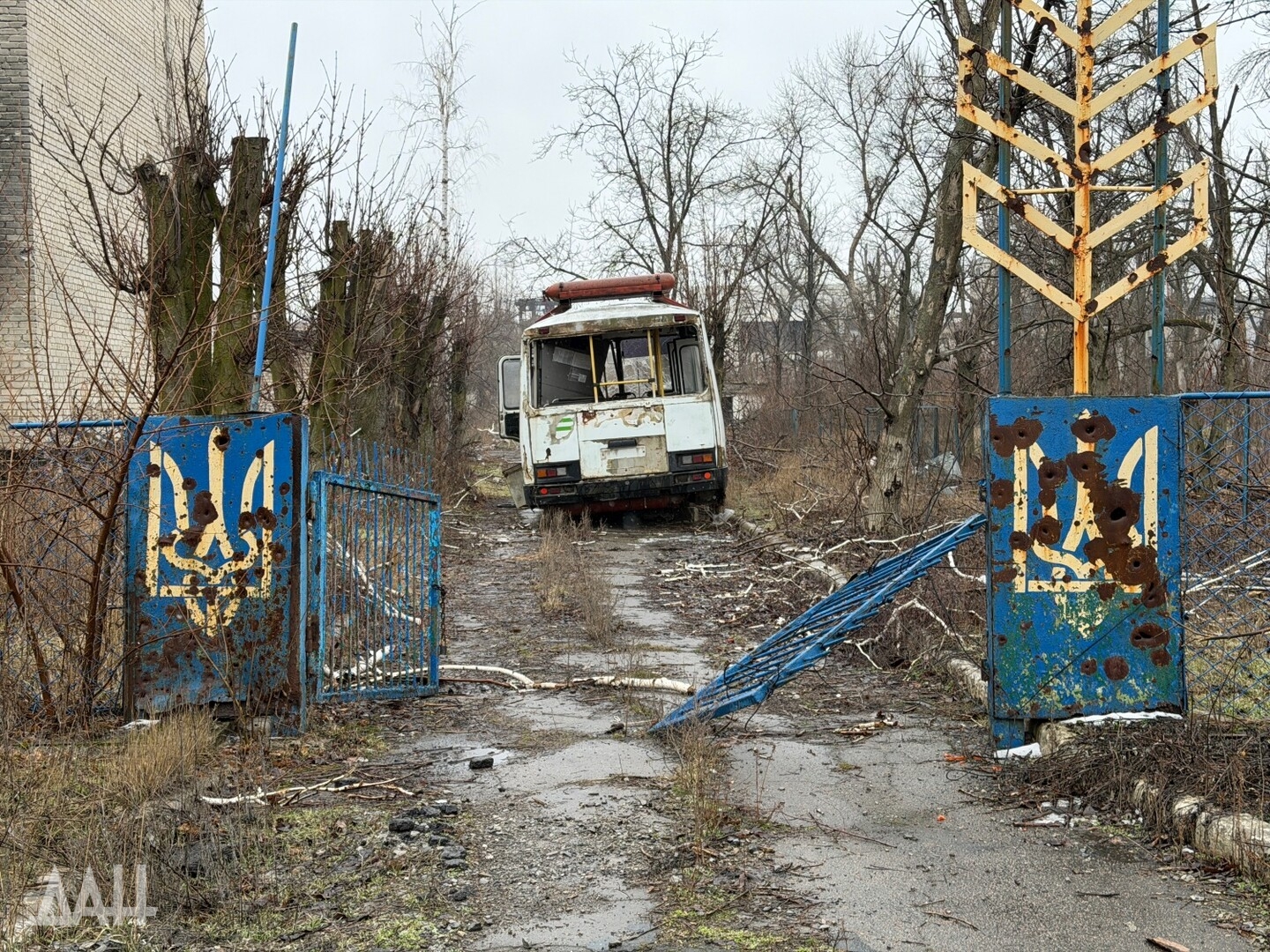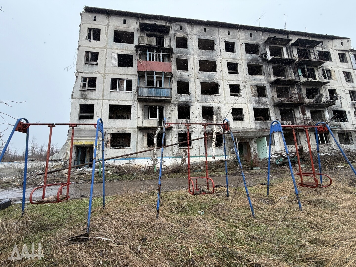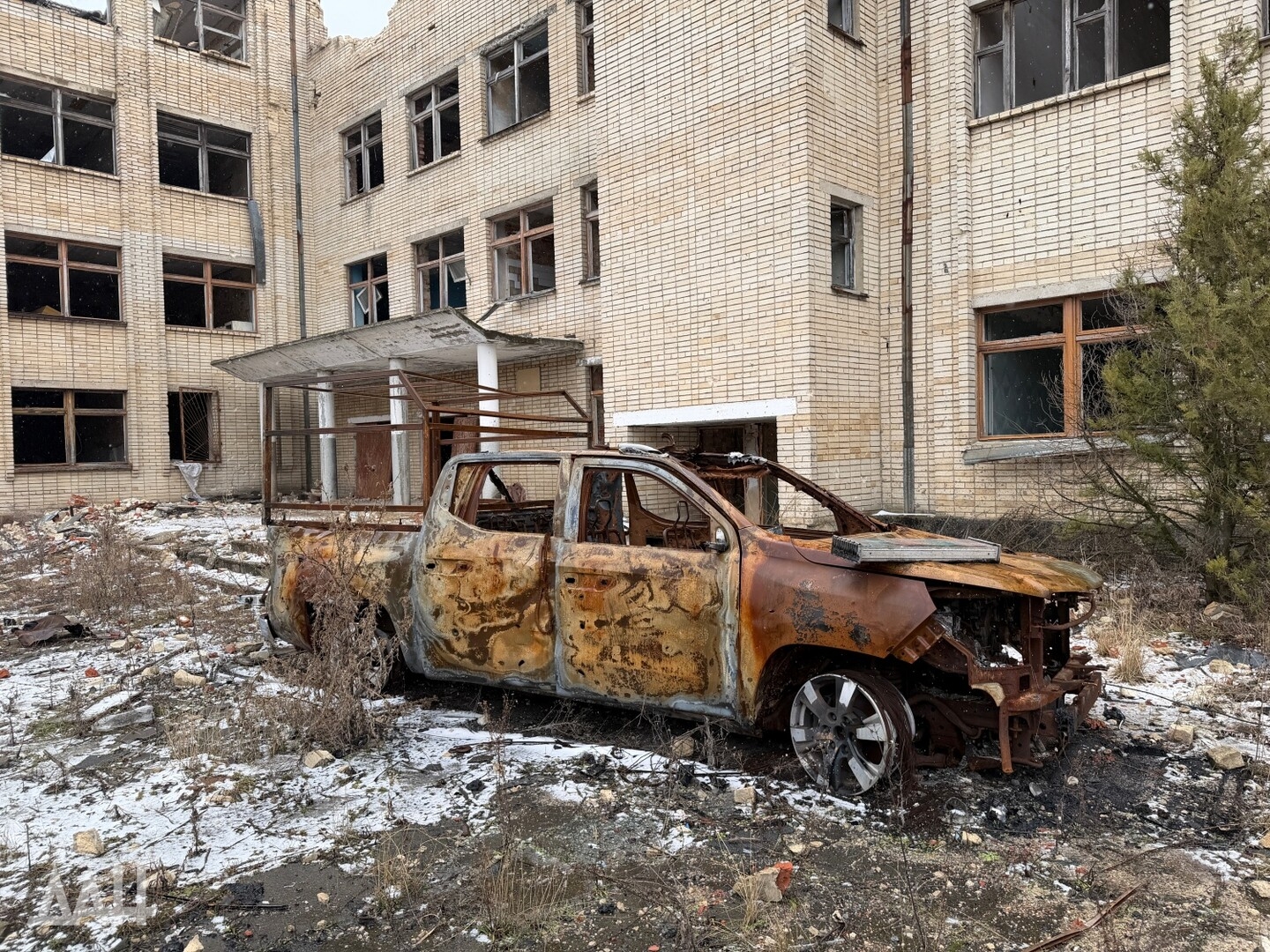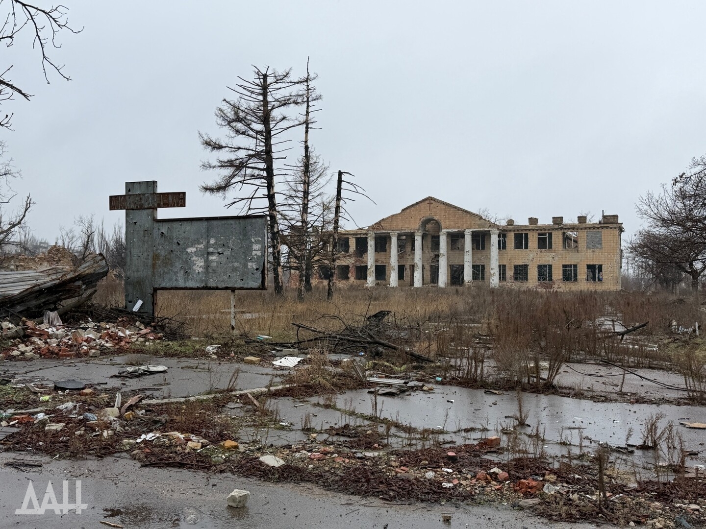 Повсюду здесь следы ожесточенных боев: изрешеченные осколками фасады многоэтажек, сгоревшие остовы автомобилей, брошенная военная техника — все еще хранит воспоминания тяжелых месяцев огня. А вот и местная школа, где от окон остались лишь пустые проемы, а полы покрыты слоем битого стекла и строительной пыли.