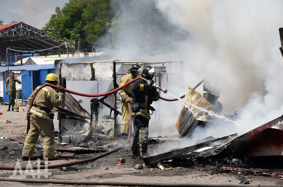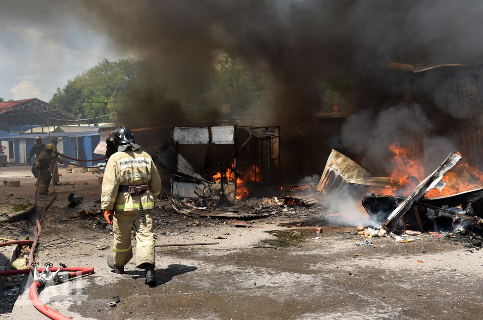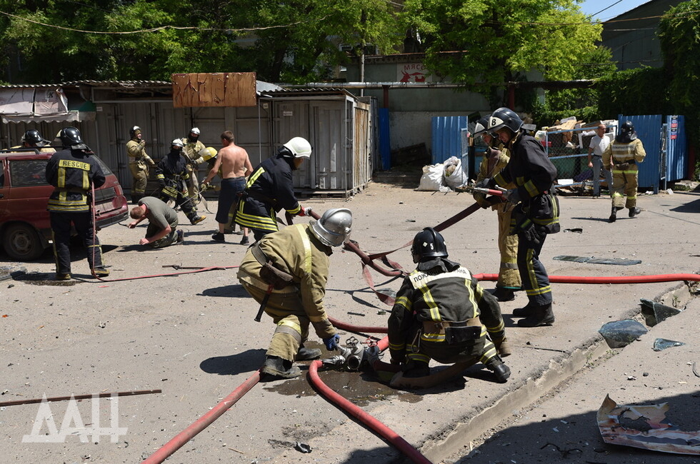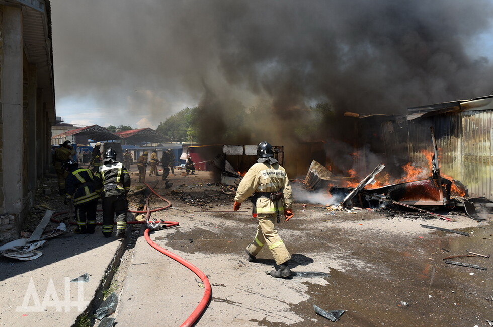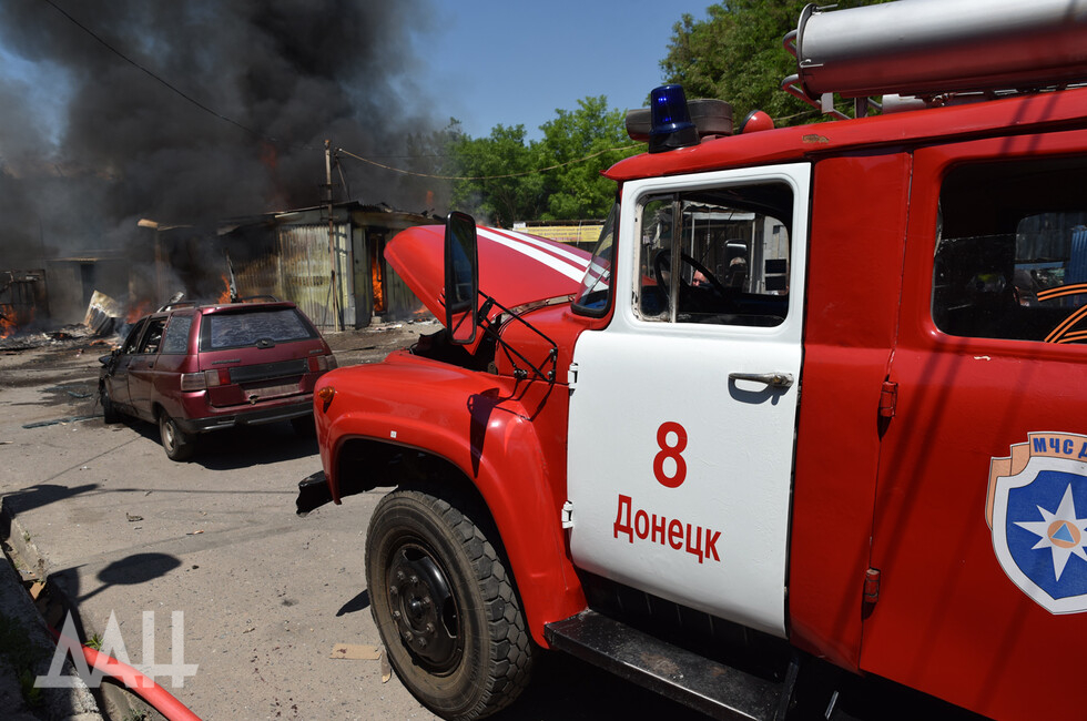 Донецк, 13 июн — ДАН. Пожарные расчеты продолжают ликвидацию возгораний на территории рынка в Буденновском районе Донецка, возникшие из-за обстрелов со стороны украинских войск, передает корр. ДАН с места события.
