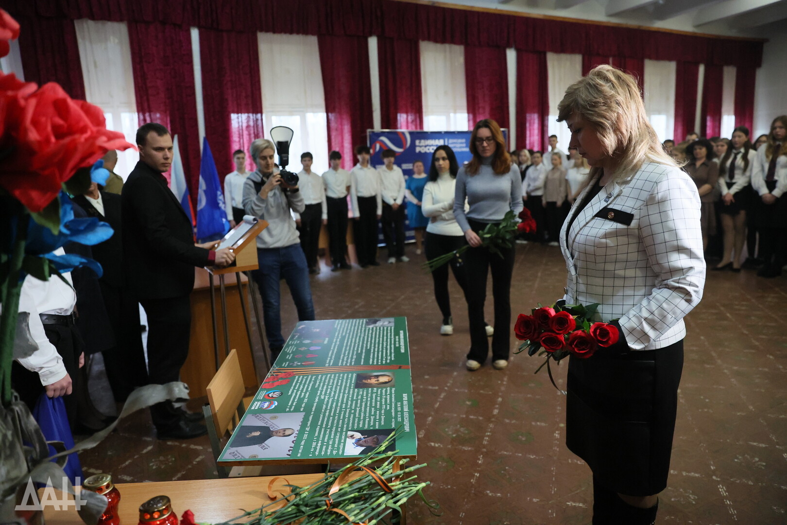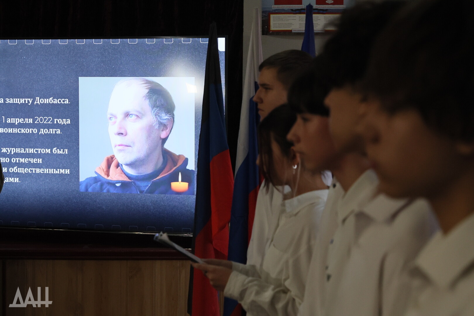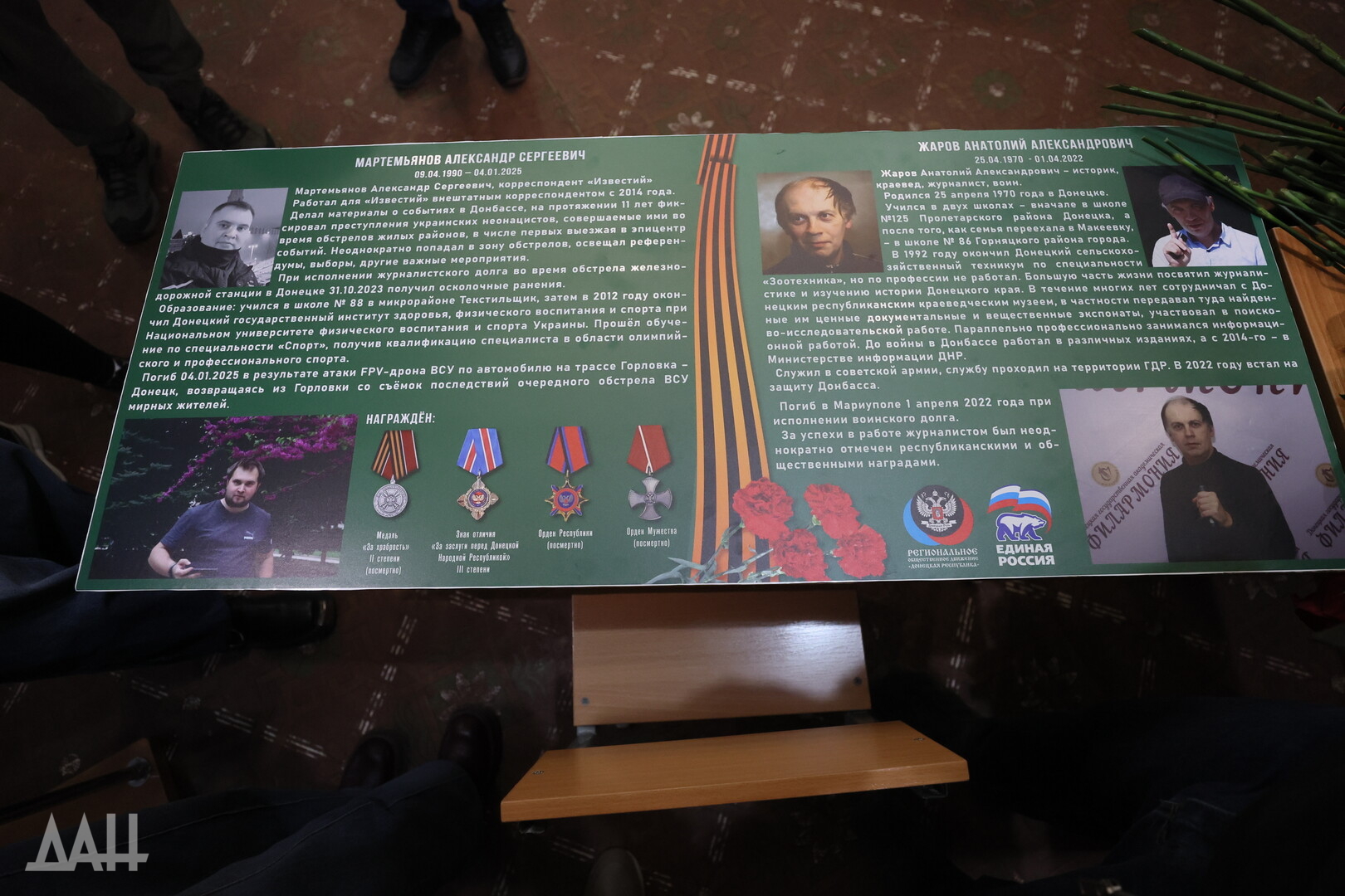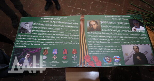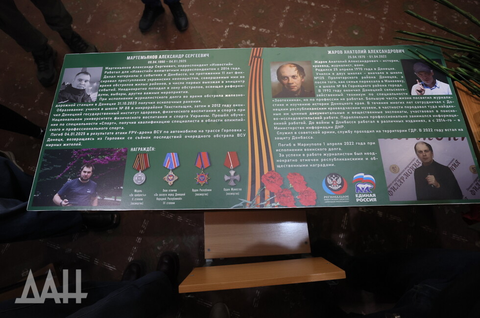Донецк, 5 декабря — корр. ДАН. Память погибших журналистов Александра Мартемьянова и Анатолия Жарова увековечили в донецкой школе №125 открытием Парты героя. Мемориал создан в рамках общественного проекта «Единой Россией» по инициативе Донецкого агентства новостей.