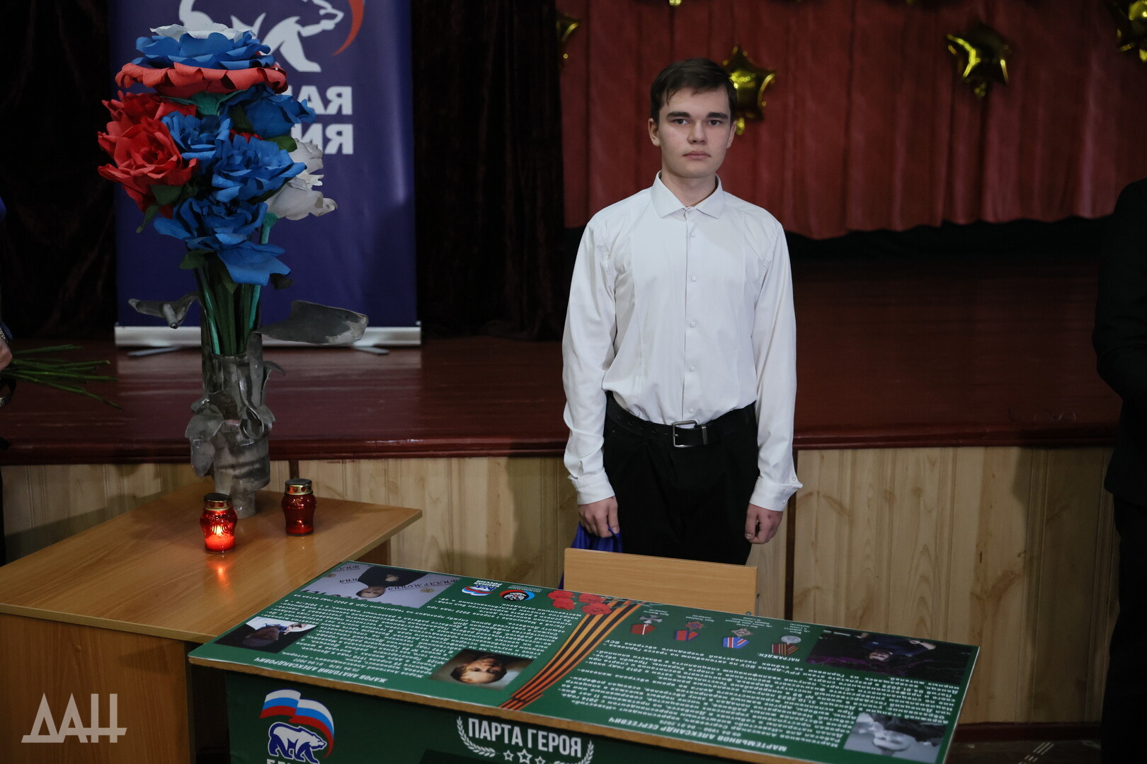 «Парта Героя» — всероссийский образовательный проект, созданный по инициативе партии «Единая Россия» в 2018 году. С его помощью будущее поколение узнает о военных, которые отдали жизнь за будущее России. На парте размещены фотографии погибших бойцов с биографией и заслугами перед Отечеством.