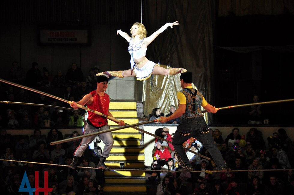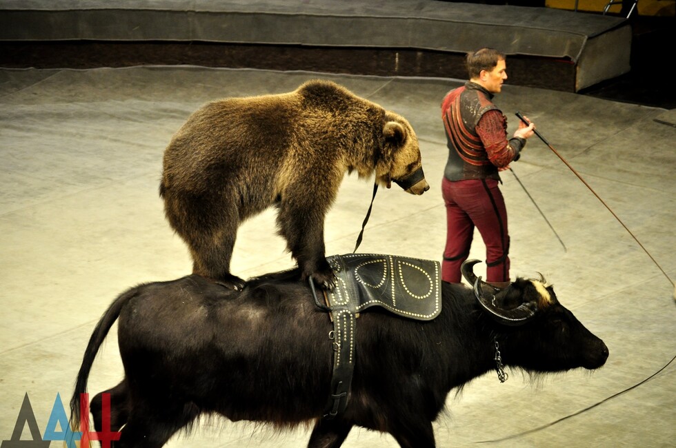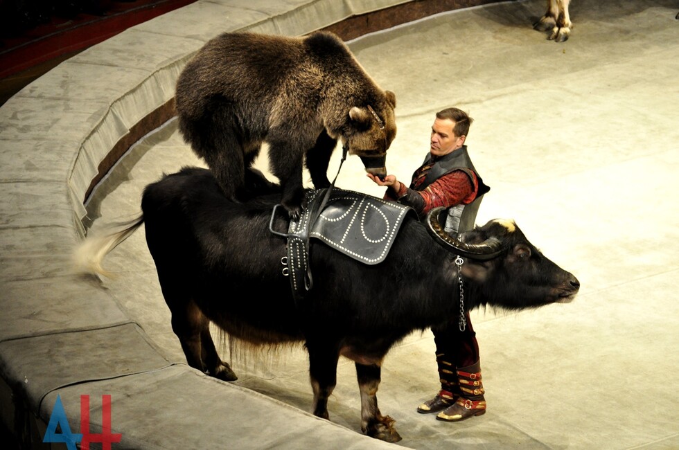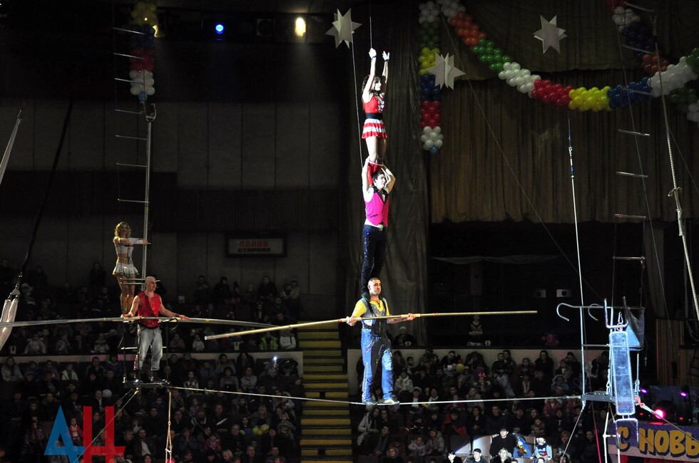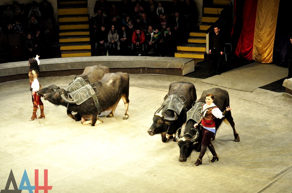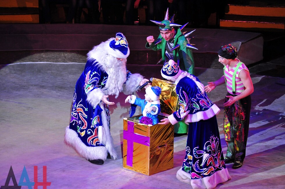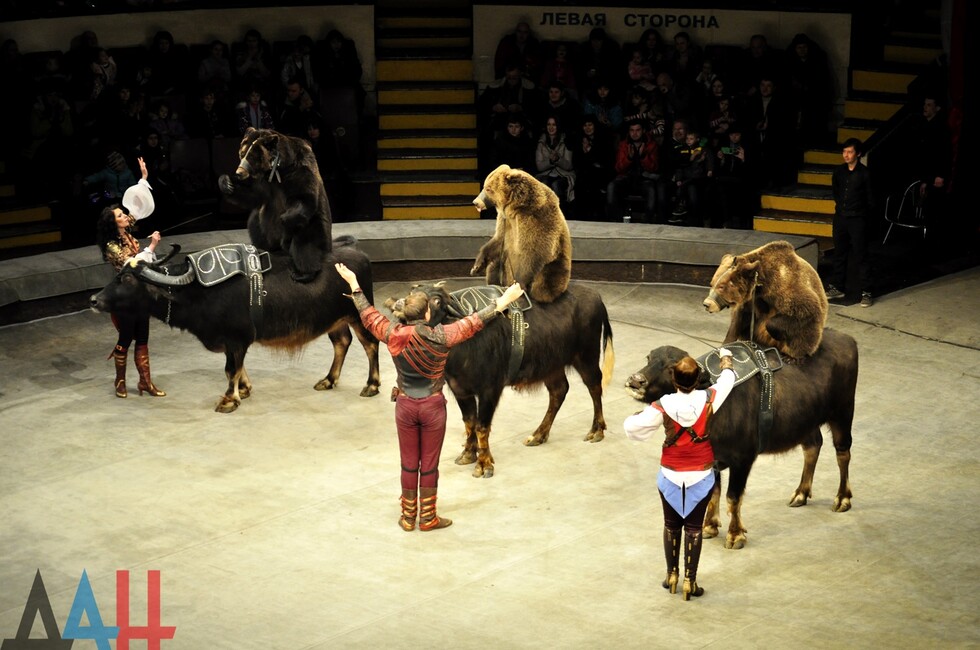 Завершающая новогодняя программа «Росгосцирка» продлилась более двух часов, и включала в себя выступления акробатов, клоунов, дрессировщиков животных - собак, медведей и даже быков. За время гастролей (начались 27 декабря) российские артисты выступили на донецкой арене более 10 раз. *дя*рб*ъъ