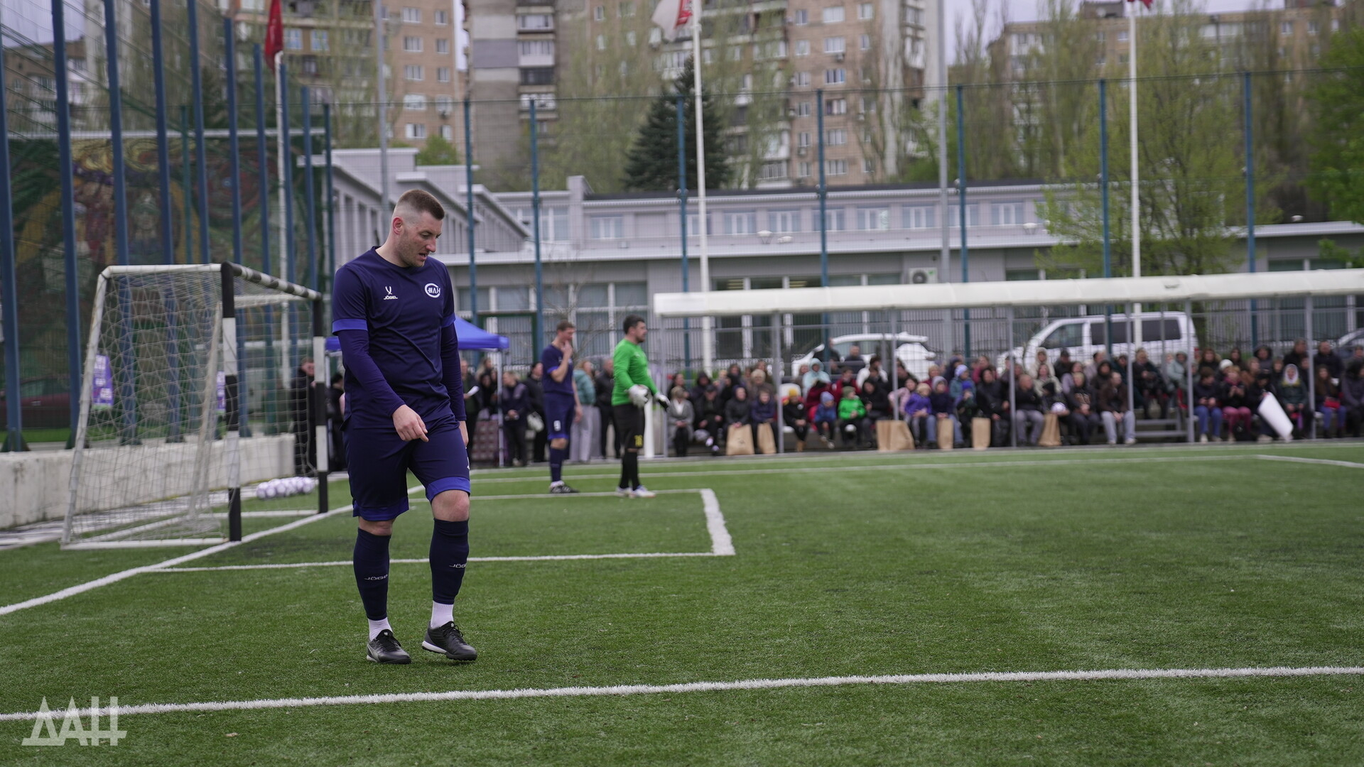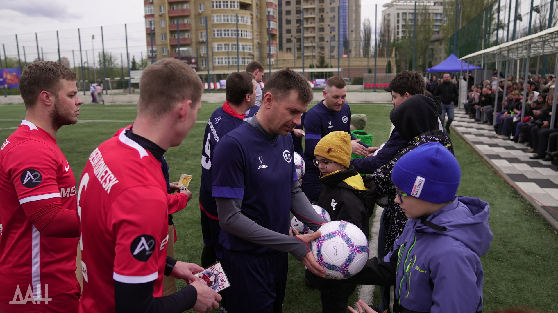 На поле встретились команды ФК «Железные дороги Новороссии» и ФК «Победа». Организаторы назвали игру важной инициативой в поддержку тяжелобольных детей — подопечных фонда «Время добрых».