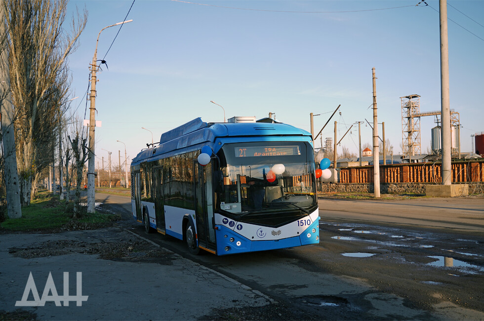 Первый после освобождения города троллейбусный маршрут проложен от морского порта до драматического театра через проспект Металлургов — одну из главных улиц. Он начал работать 23 ноября. Там курсируют троллейбусы на автономном ходу, то есть без подключения троллей. Пока на линии четыре машины, еще одна — в резерве. Движение начинается в восьмом часу утра, последний рейс — в половине шестого вечера.