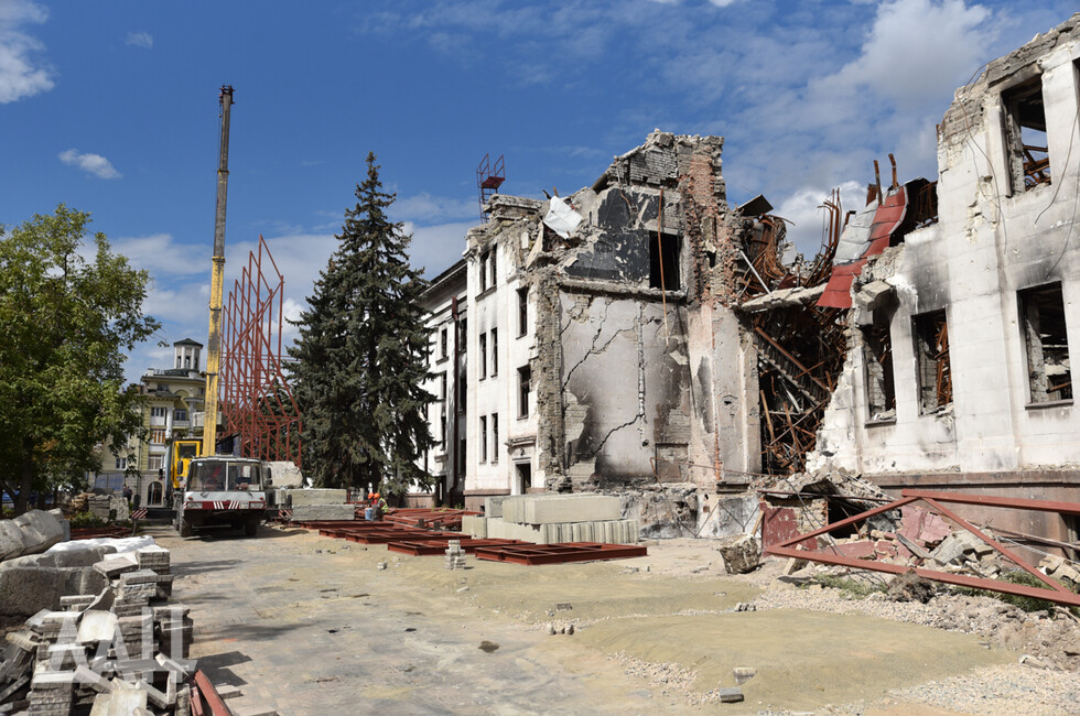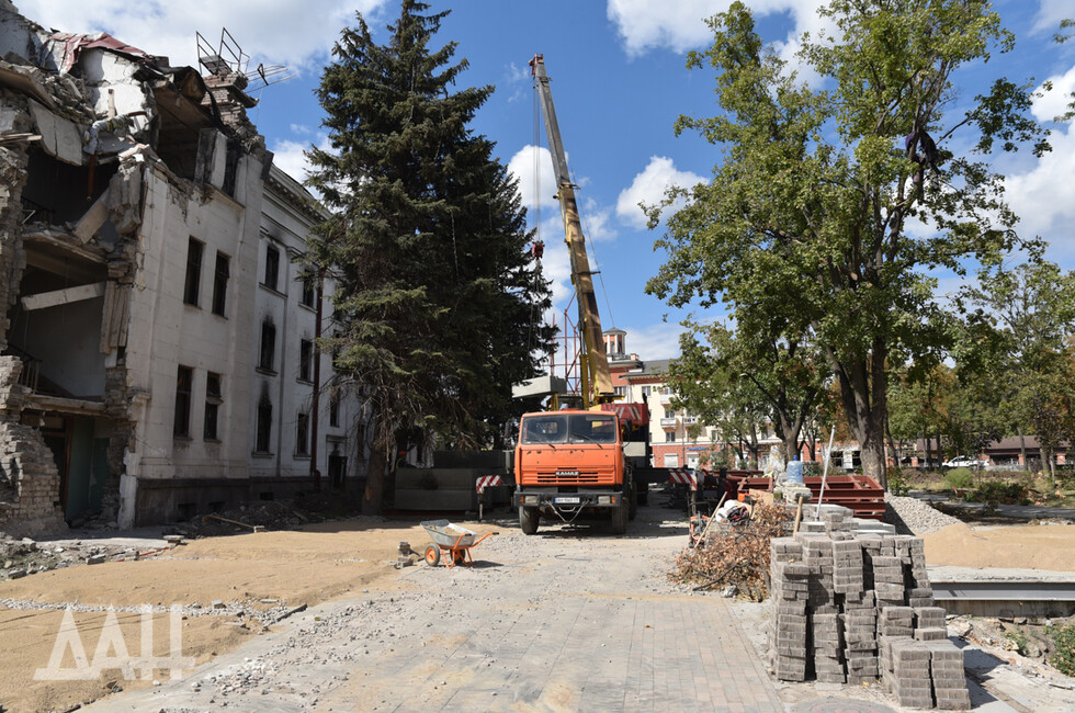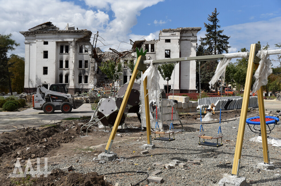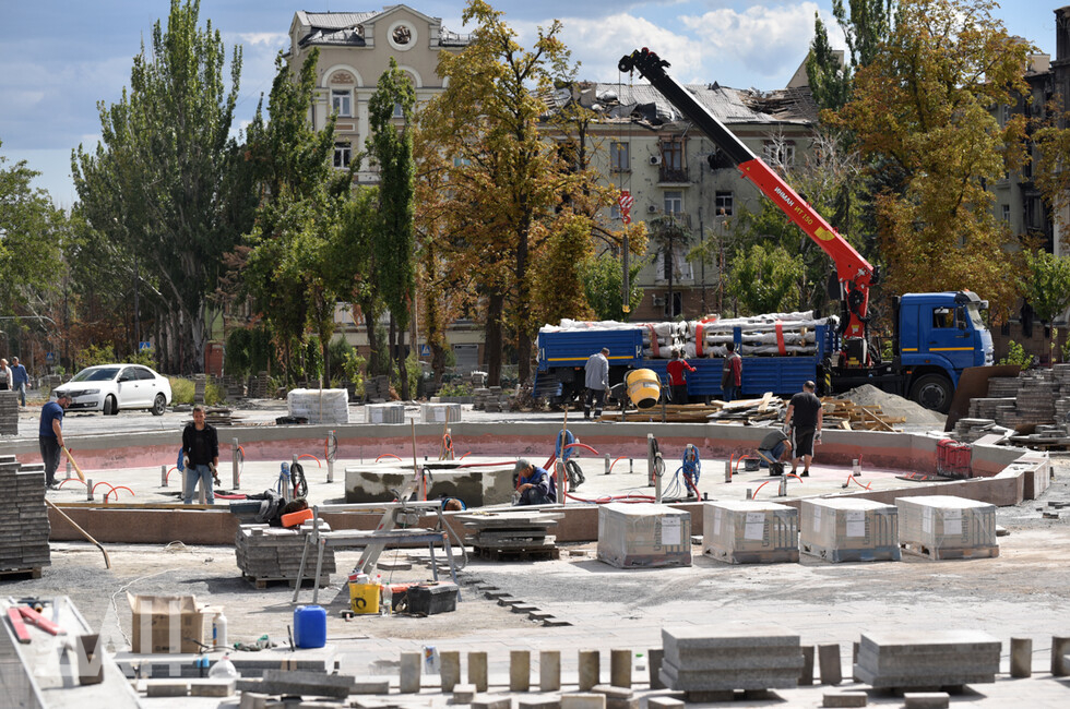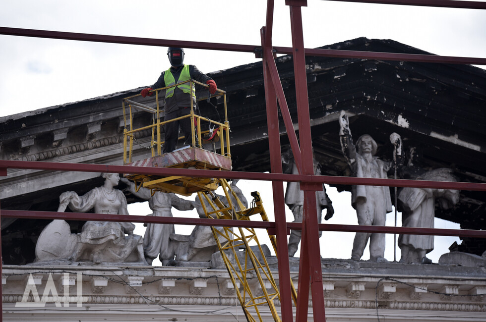 Сквер вокруг и сам драмтеатр, который был разрушен в результате взрыва в середине марта этого года во время активных боевых действий, превращены в стройплощадку. С фронтальной стороны здания сотрудники одной из российских строительных компаний наваривают массивную металлоконструкцию, на которою впоследствии установят стальные листы довольно большой толщины.