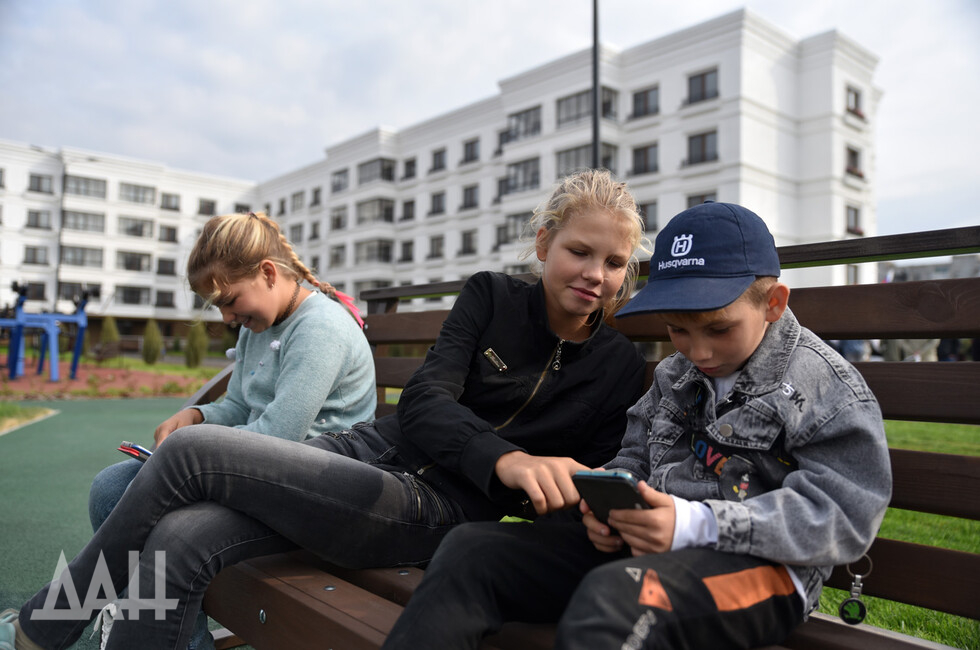 Вокруг микрорайона виднеются закопченные остовы уничтоженных украинскими боевиками домов, внутри — просторный двор с игровой и большой спортивной площадкой, газоны, лавочки. В ожидании почетных гостей дети облюбовали качели, турники и тренажеры.