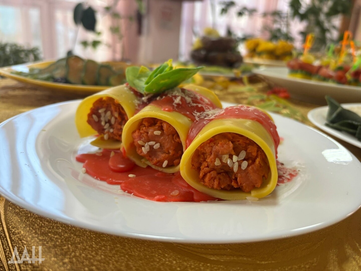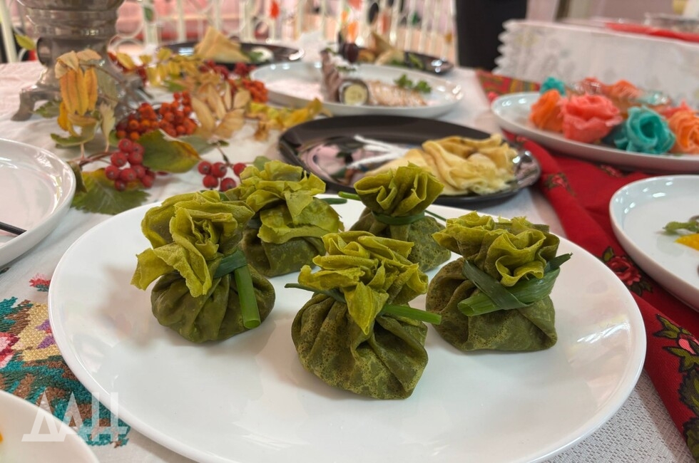 «Самое традиционное блюдо, которое существовало на Руси, — это блины, блинчики, оладьи. Мы хотели сегодня показать, как их можно оформить и подать, ведь блины могут быть как традиционные, так и яркие, праздничные. Блины готовятся с очень разными начинками, здесь чего только нет. Допустим, мы шпинат добавляли, он придает цвет и свою пикантность, изюминку. Свеклу добавили — уже получилась алая красивая роза. Цветная капуста синяя — сделали правильный сок, получились синие блинчики», — отметила мастер производственного обучения высшей категории Людмила Кожемякина.