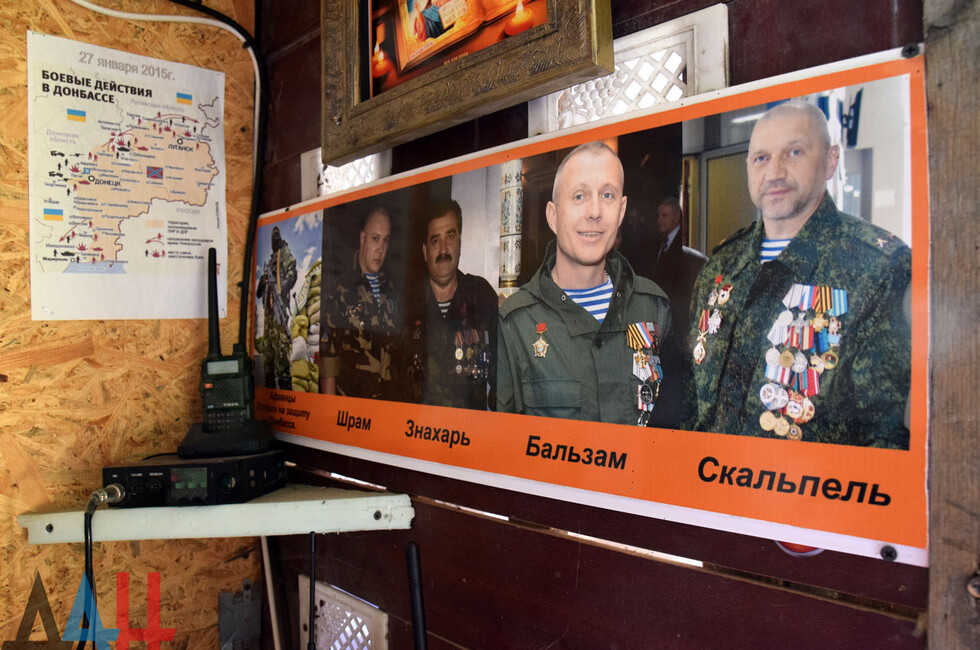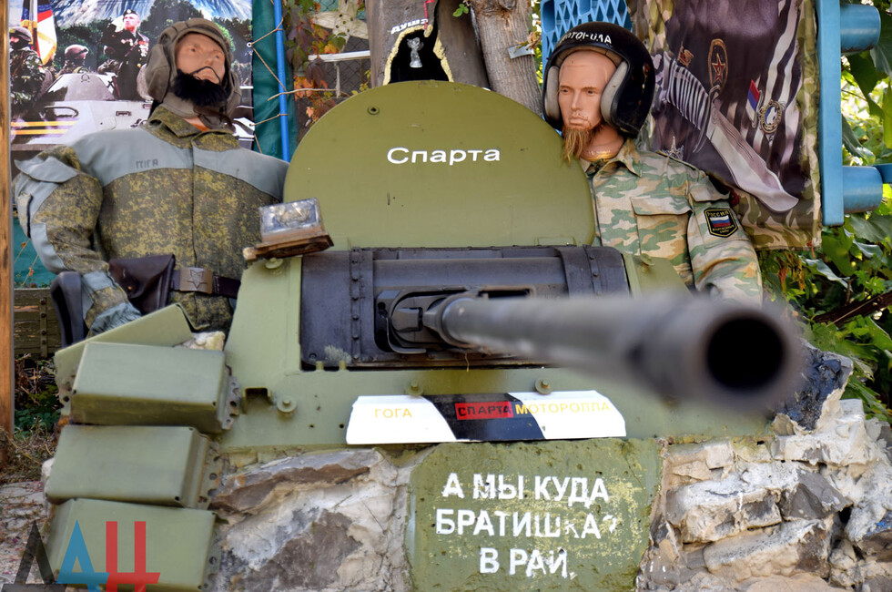 При входе в музей гостей встречает «дядя Вася» – ополченец ДНР, в руках у которого автомат – трофей «Иловайского котла». Чуть дальше расположена площадка «Боевые действия». Она представляет собой импровизированную военную базу: пройдя через блокпост, посетители могут посмотреть на рации, одежду, сухпайки и другие вещи из обихода военнослужащего.