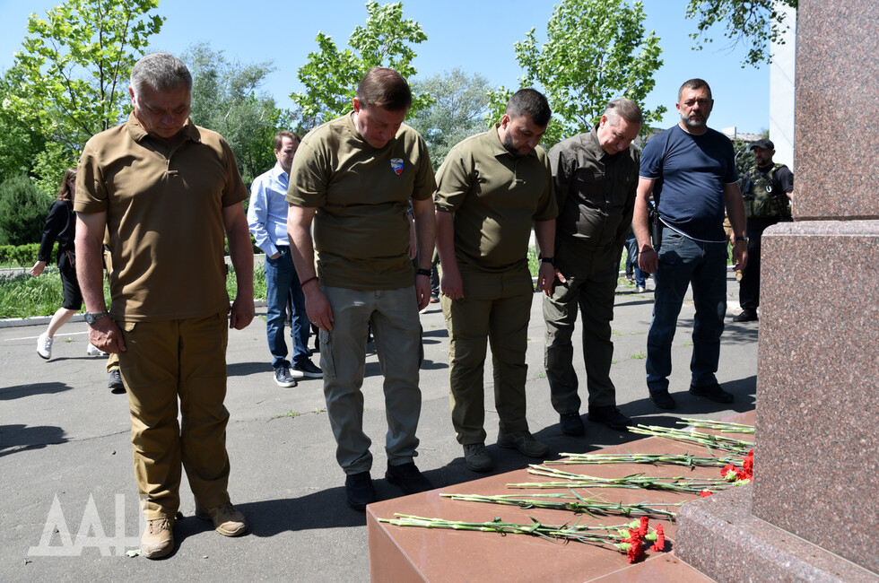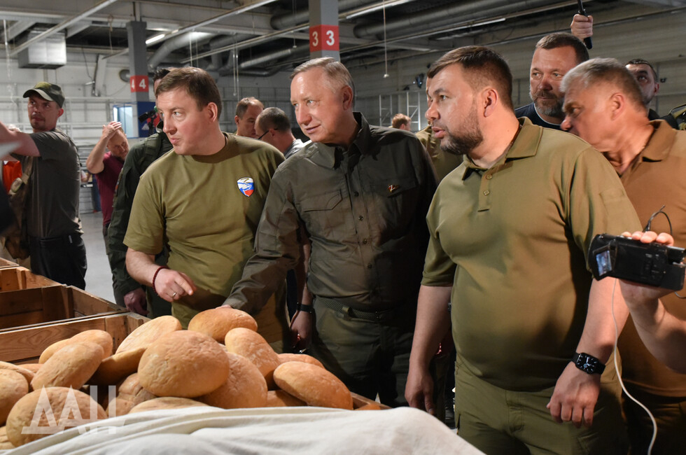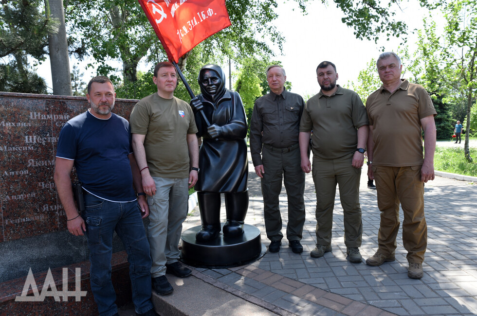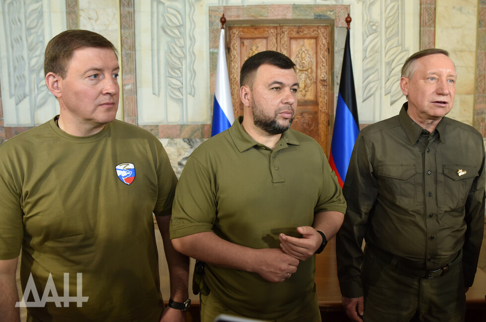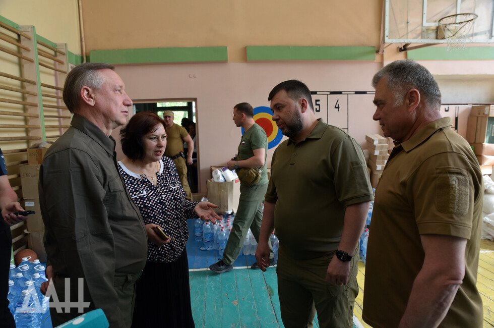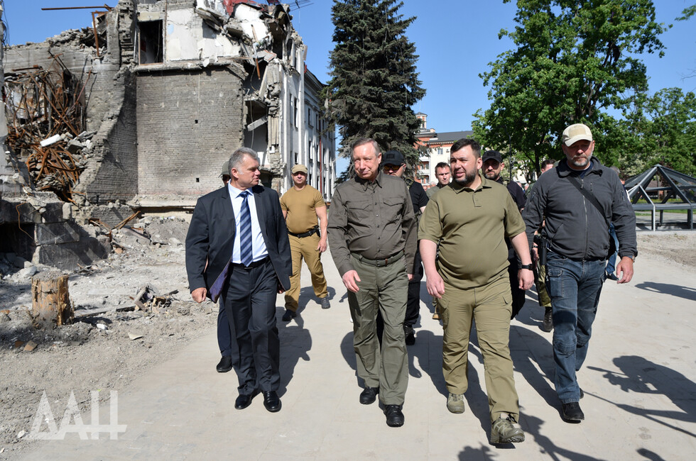 В состав делегации вошел губернатор Санкт-Петербурга Александр Беглов, также присутствовали Глава ДНР Денис Пушилин и первый заместитель председателя Совета Федерации Андрей Турчак. Они осмотрели разрушенный украинскими войсками драматический театр, возложили цветы к мемориалу Героям СССР, посетили гуманитарный центр.