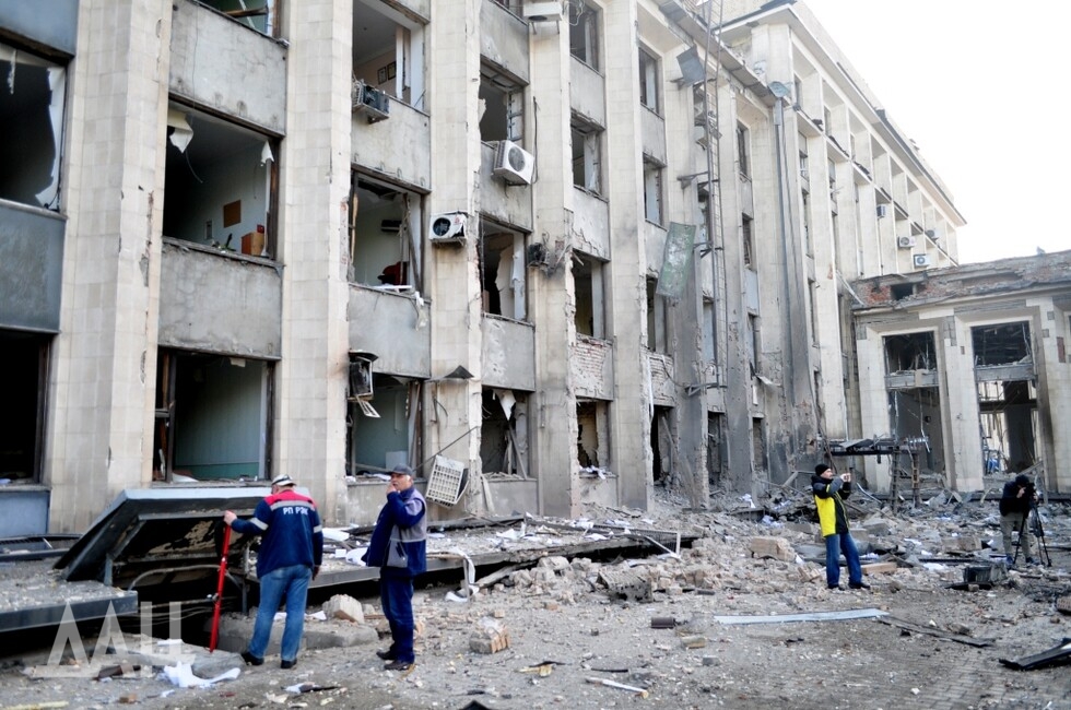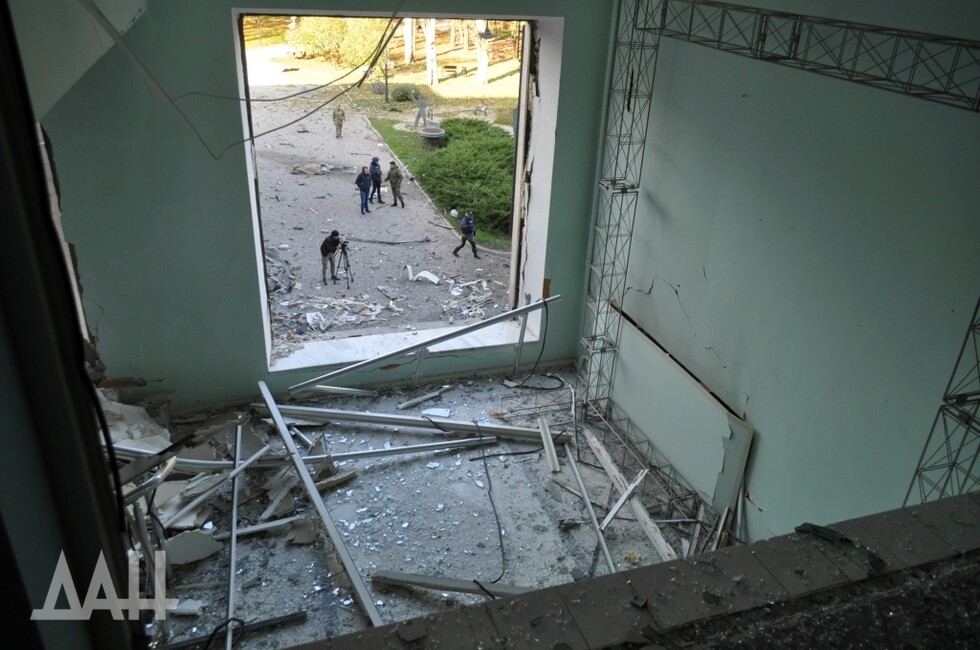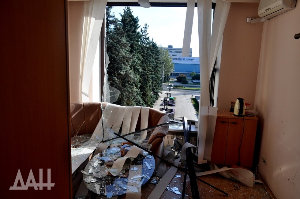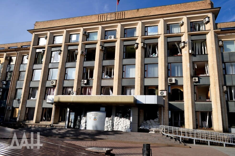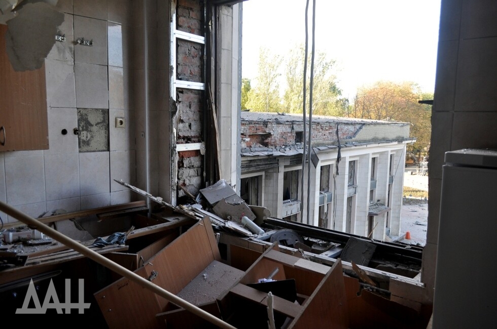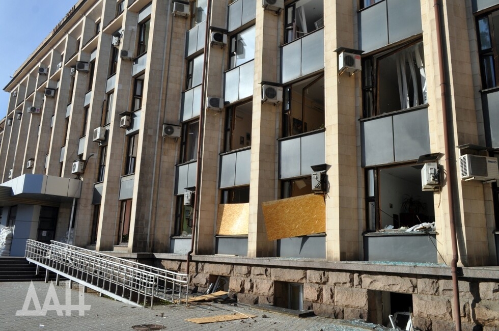 Донецк, 16 окт — ДАН. Здание городской администрации Донецка в Ворошиловском районе сегодня утром оказалось под обстрелом со стороны вооруженных формирований Украины. Корреспонденты ДАН отсняли последствия и собрали основную информацию о случившимся.