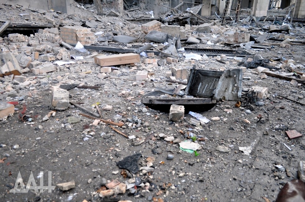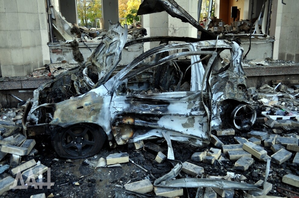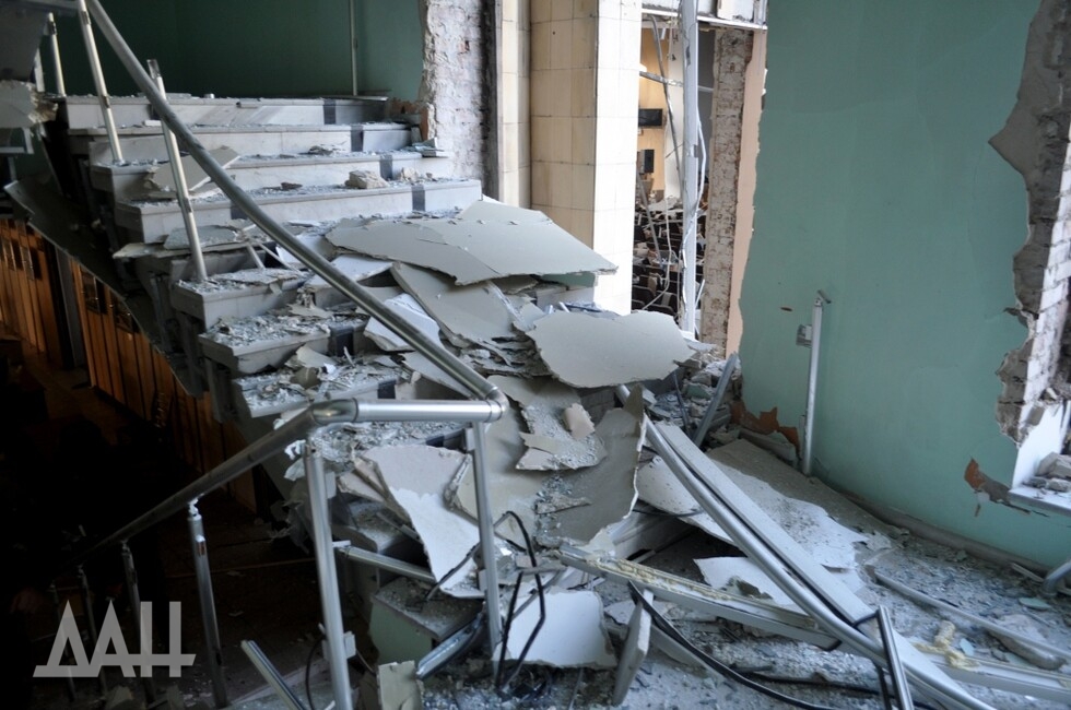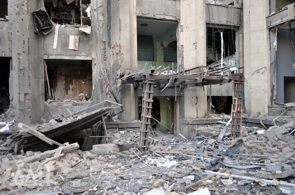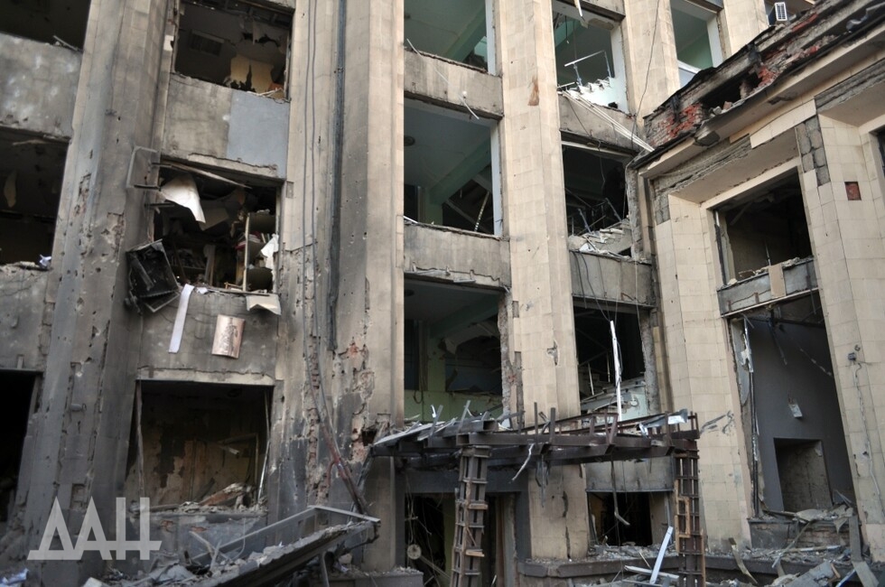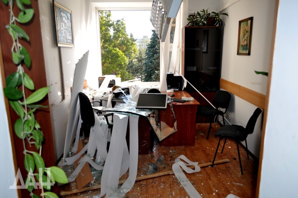 Донецк, 16 окт — ДАН. Здание городской администрации Донецка в Ворошиловском районе сегодня утром оказалось под обстрелом со стороны вооруженных формирований Украины. Корреспонденты ДАН отсняли последствия и собрали основную информацию о случившимся.