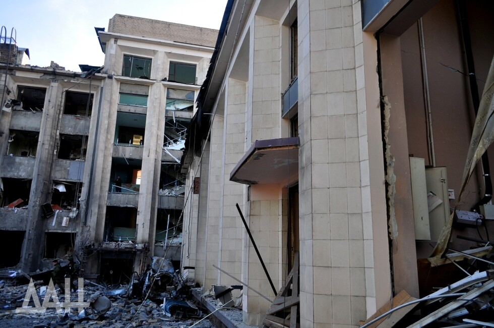 Одна из ракет попала прямо в столичную мэрию. По наблюдениям корр. ДАН, основной удар пришелся в заднюю часть здания. Здесь полностью обрушена облицовка, выбиты окна, покорежены металлоконструкции и разбиты лестничные пролеты. В кабинетах и помещениях повреждены перегородки, выбиты двери, разбита мебель, разбросаны вещи и осколки стекла. На парковке же находится ряд сгоревших автомобилей.