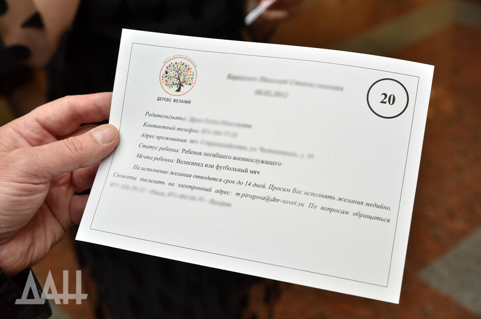 Проект «Дерево желаний» начался в 2019 году. Акция проводится под патронатом Народного Совета при поддержке Главы ДНР Дениса Пушилина. В прошлом году подарки получили около 240 детей из разных городов и районов Республики.