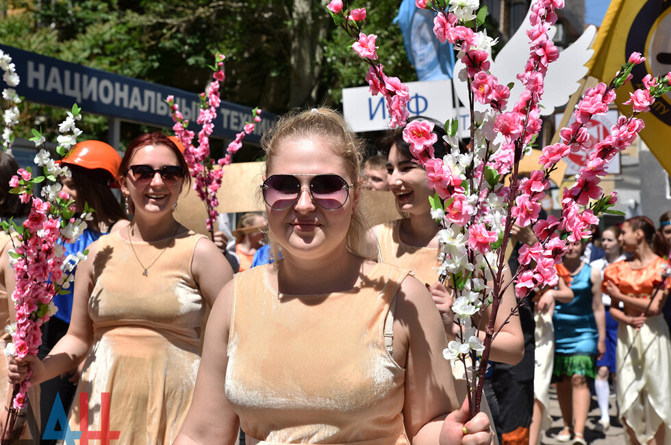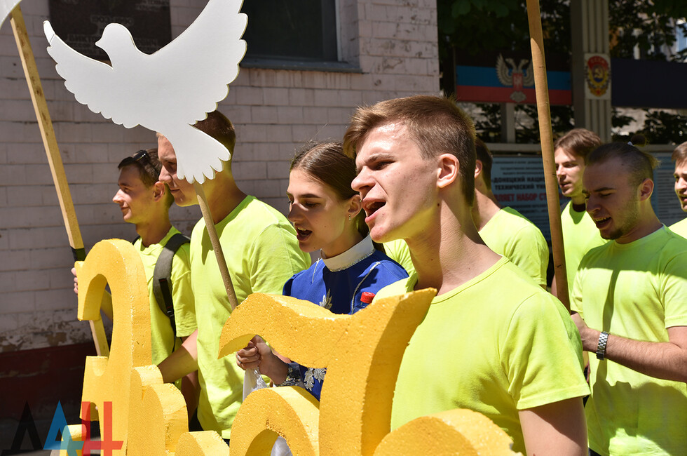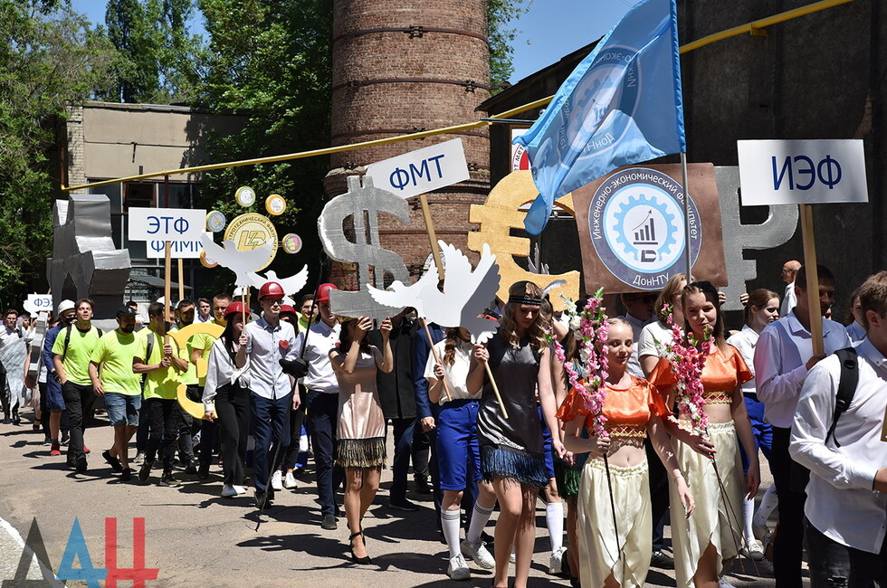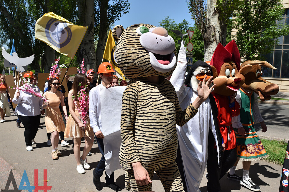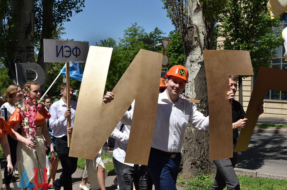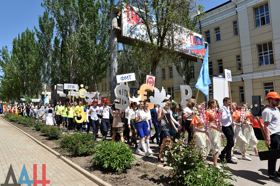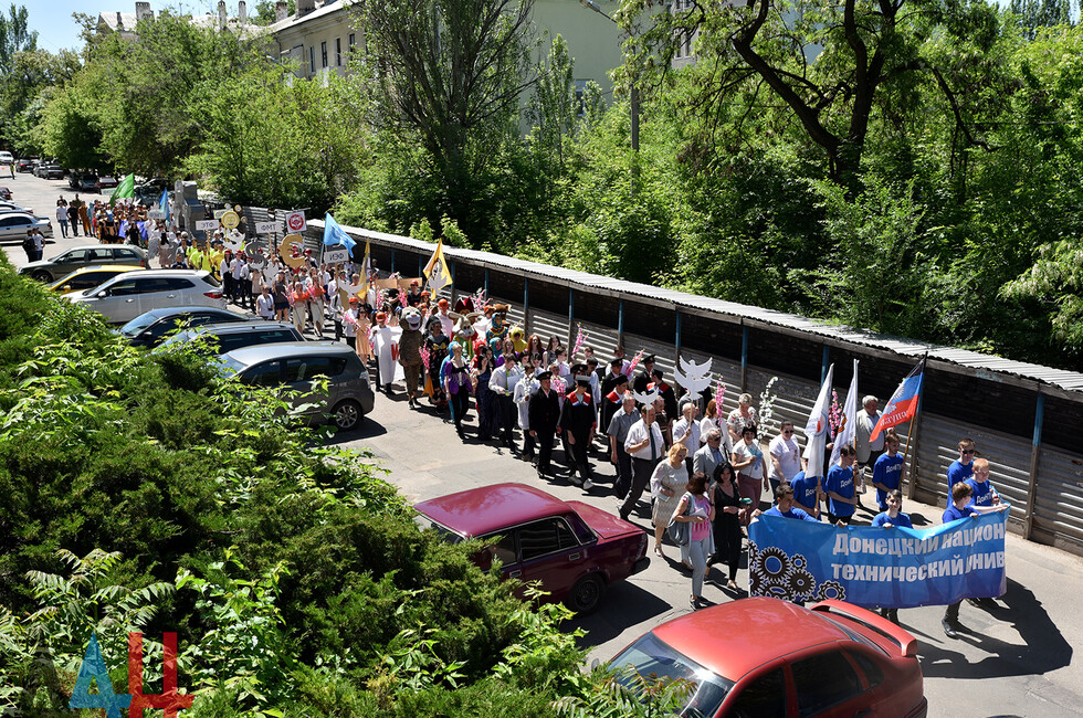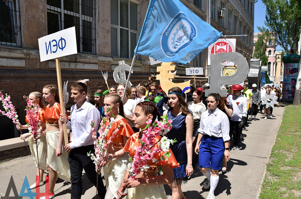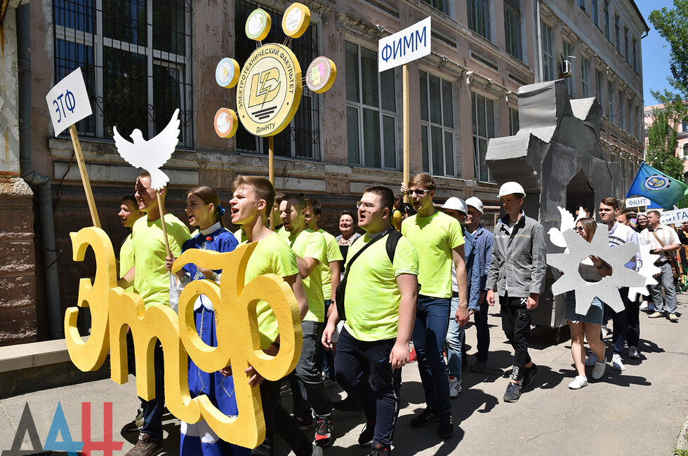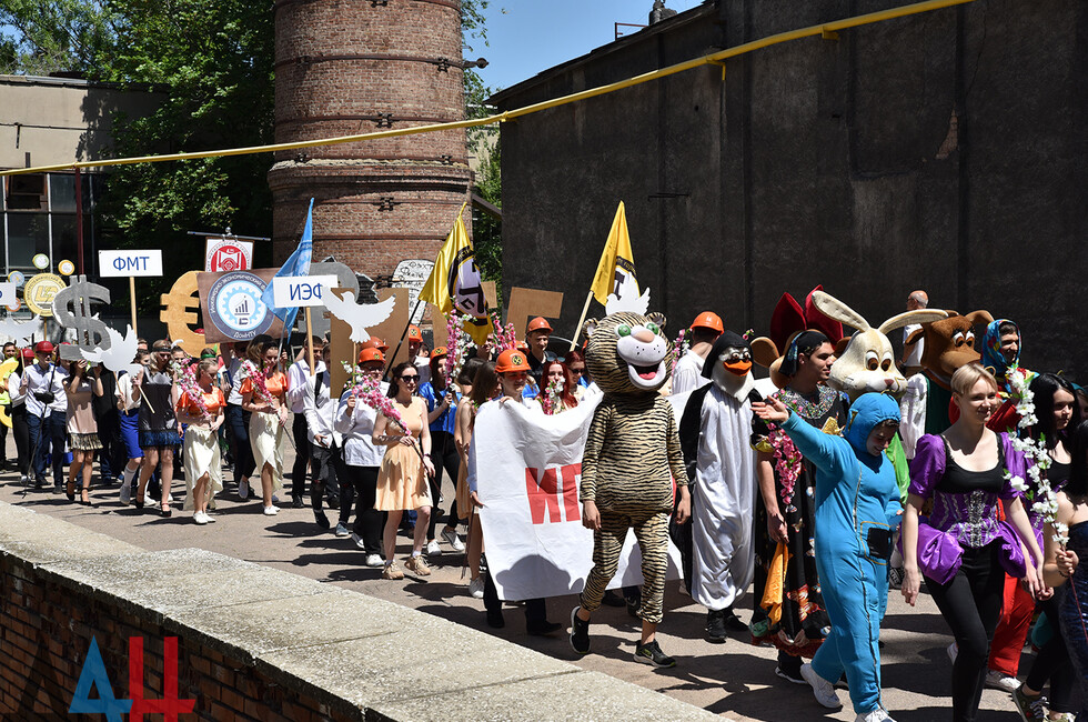 Донецк, 27 мая - корр. ДАН. Праздничное шествие в честь столетия Донецкого национального технического университета состоялось сегодня в столице ДНР. Несколько сотен студентов заполнили улицы возле вузовского городка в Ворошиловском районе.