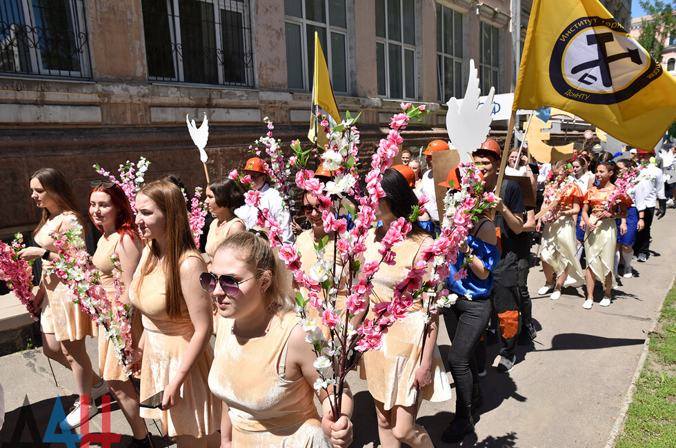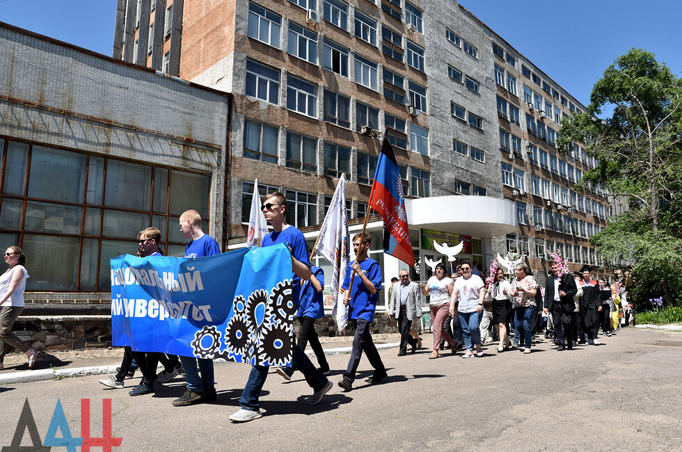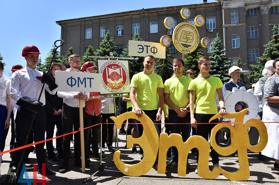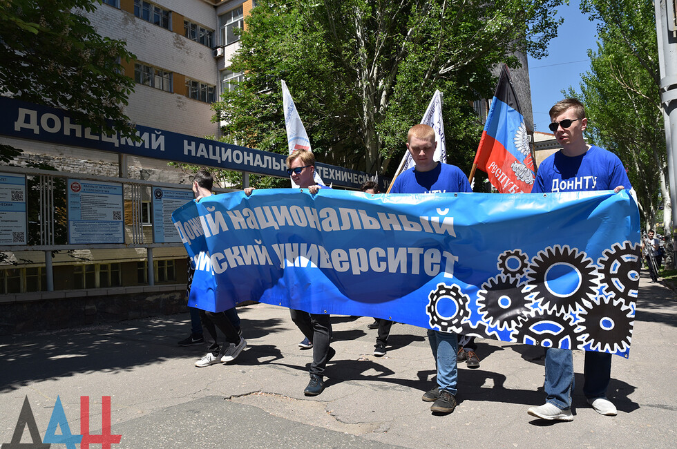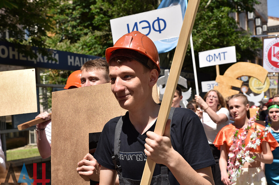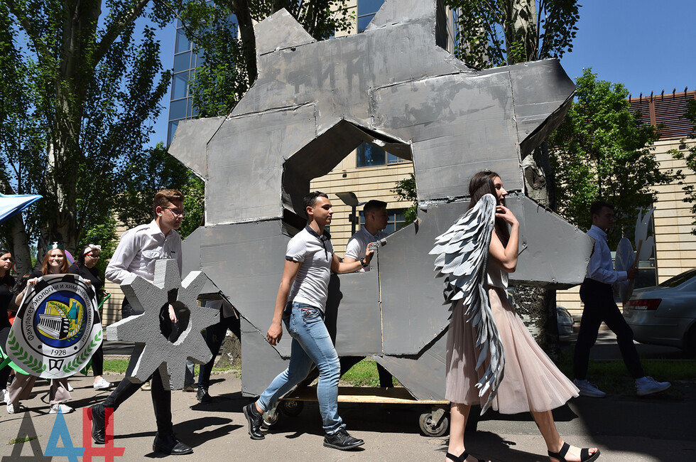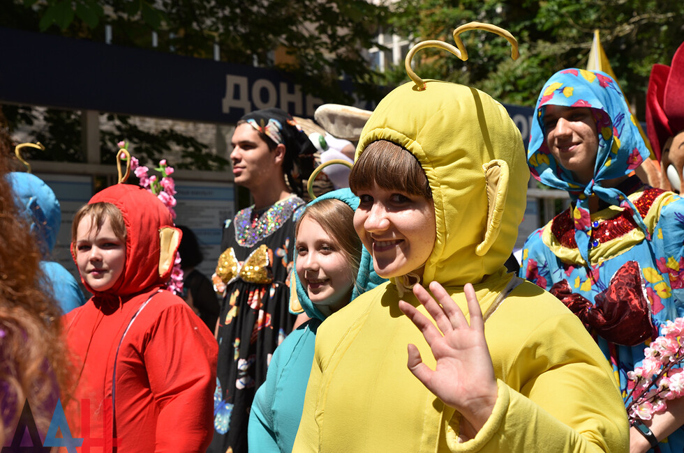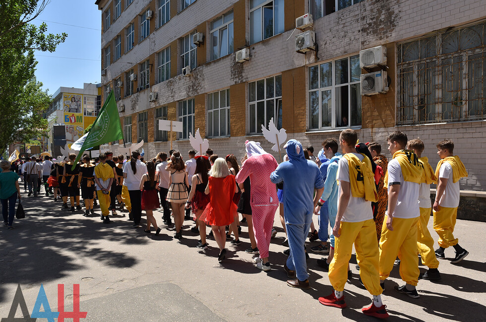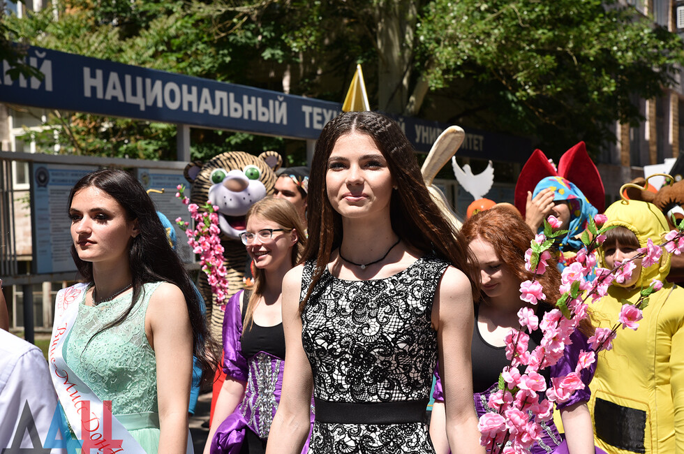 Донецк, 27 мая - корр. ДАН. Праздничное шествие в честь столетия Донецкого национального технического университета состоялось сегодня в столице ДНР. Несколько сотен студентов заполнили улицы возле вузовского городка в Ворошиловском районе.