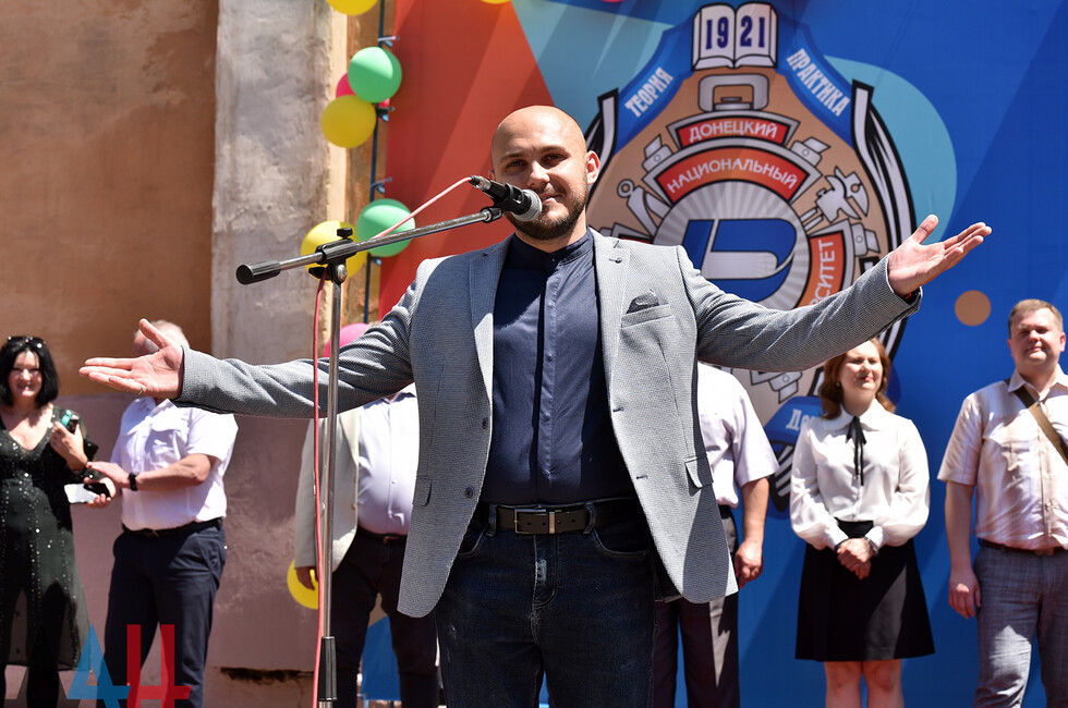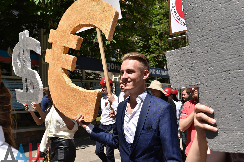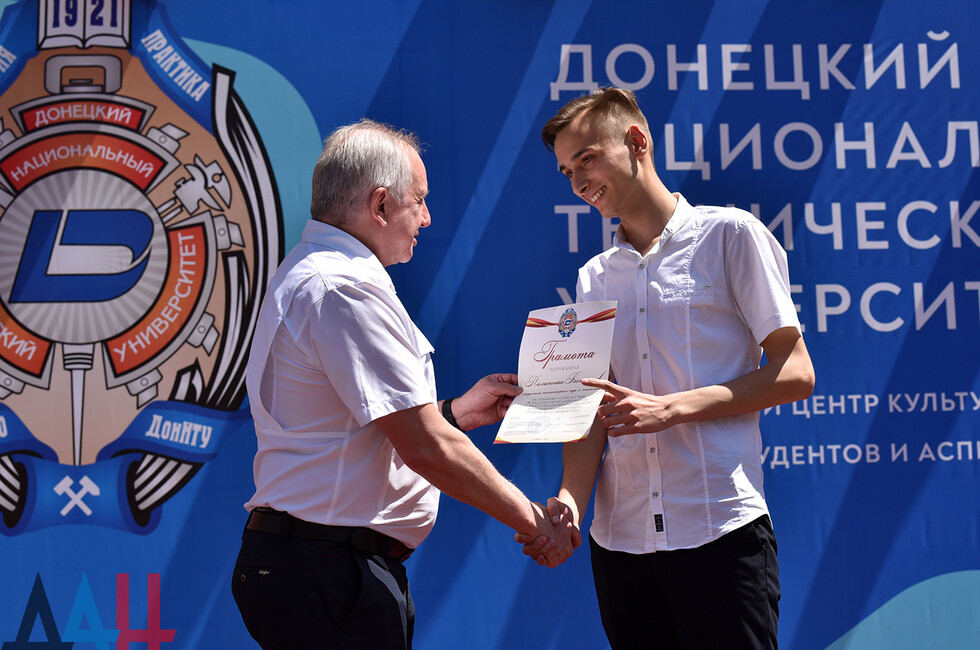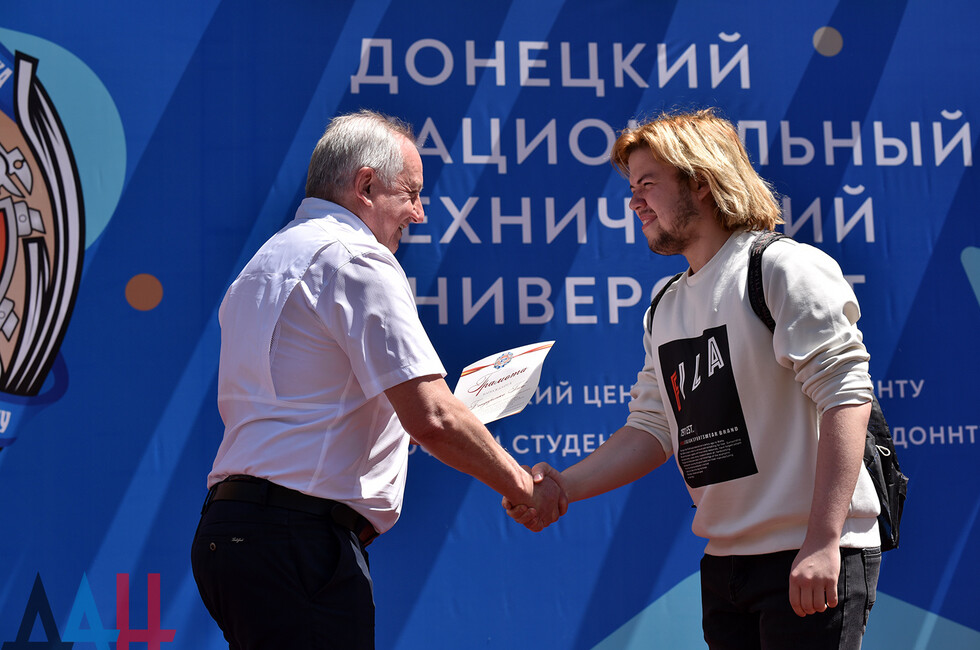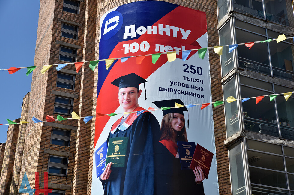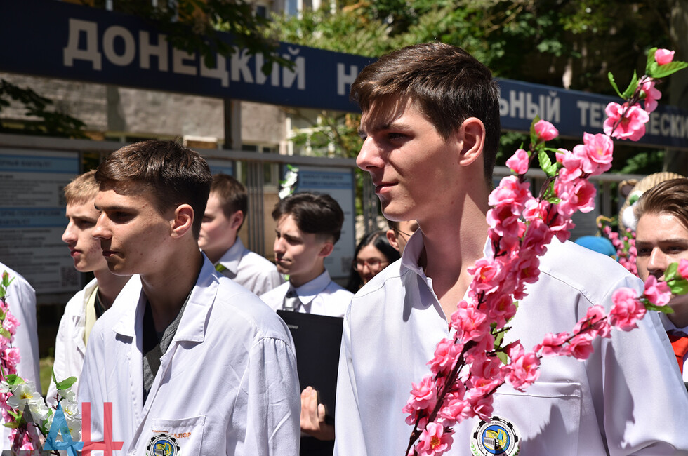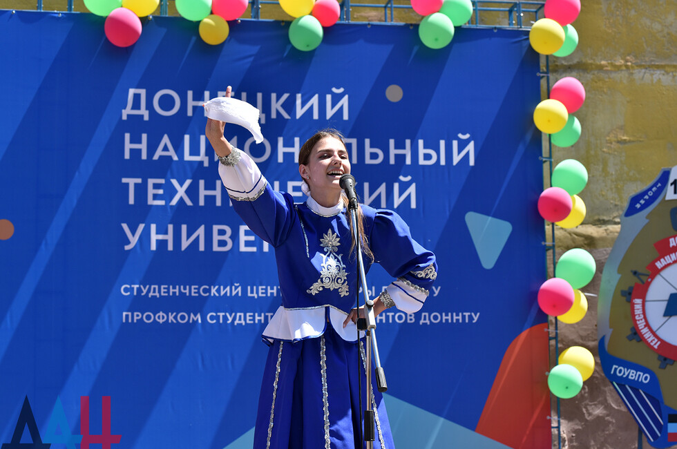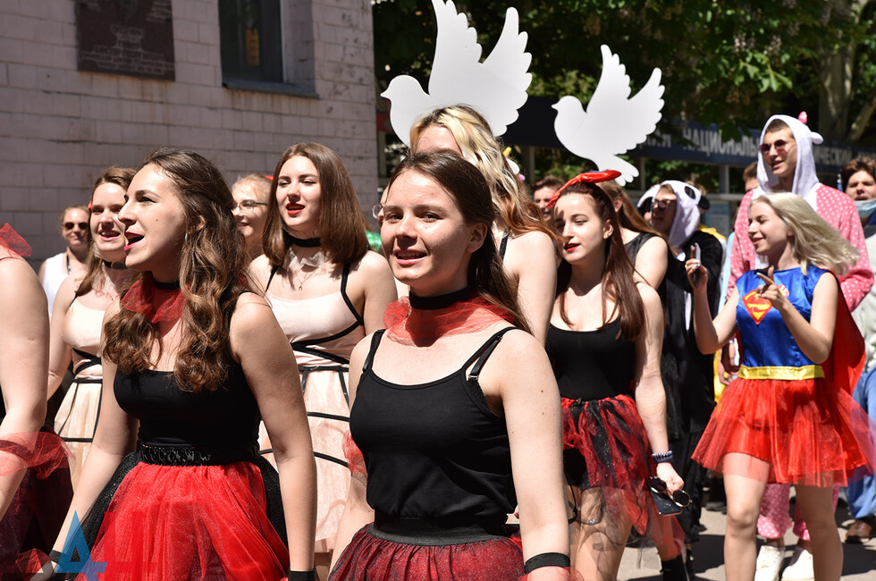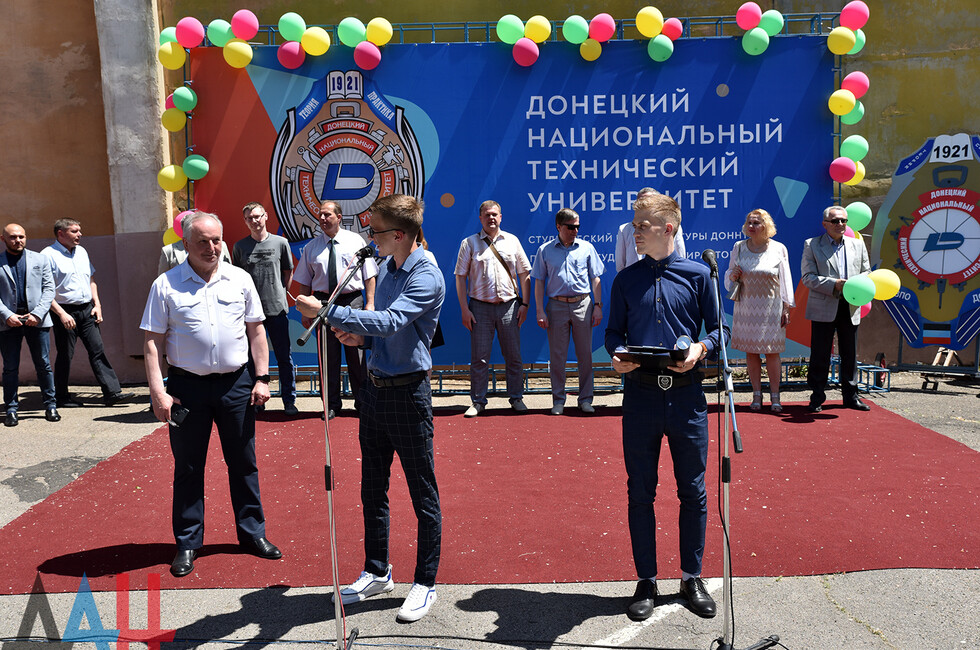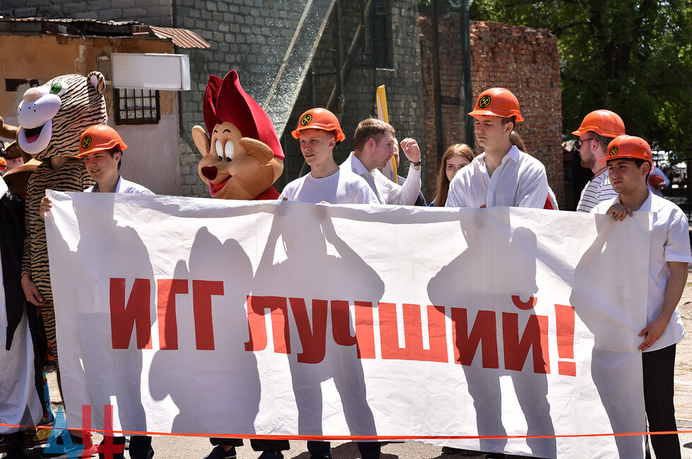 Донецк, 27 мая - корр. ДАН. Праздничное шествие в честь столетия Донецкого национального технического университета состоялось сегодня в столице ДНР. Несколько сотен студентов заполнили улицы возле вузовского городка в Ворошиловском районе.