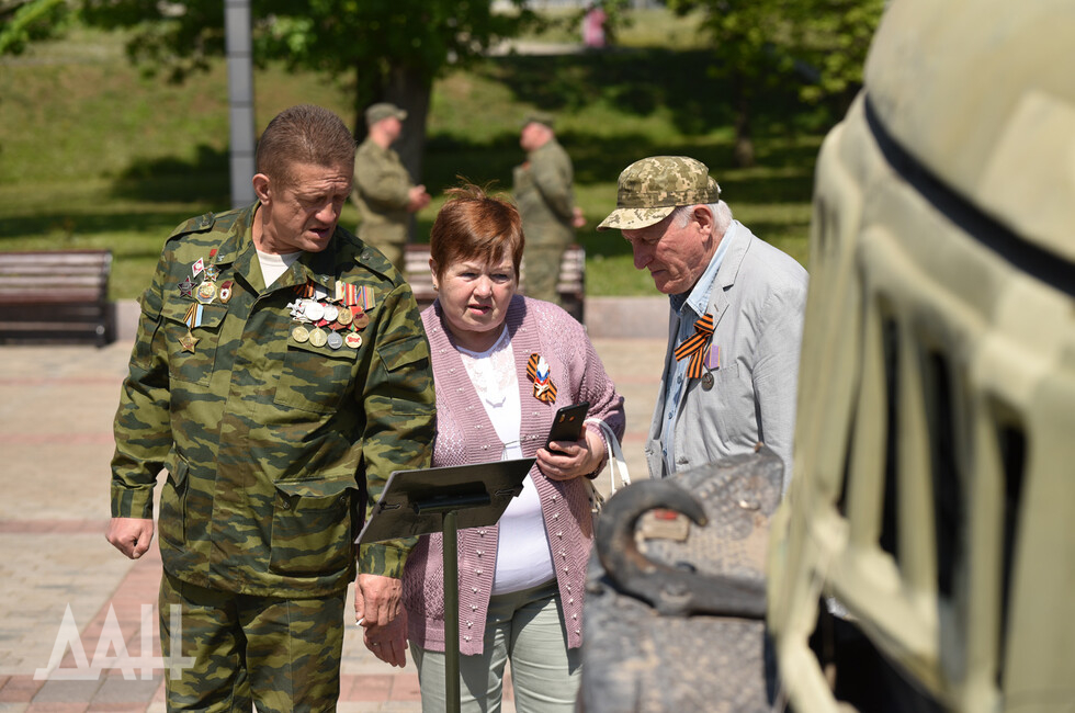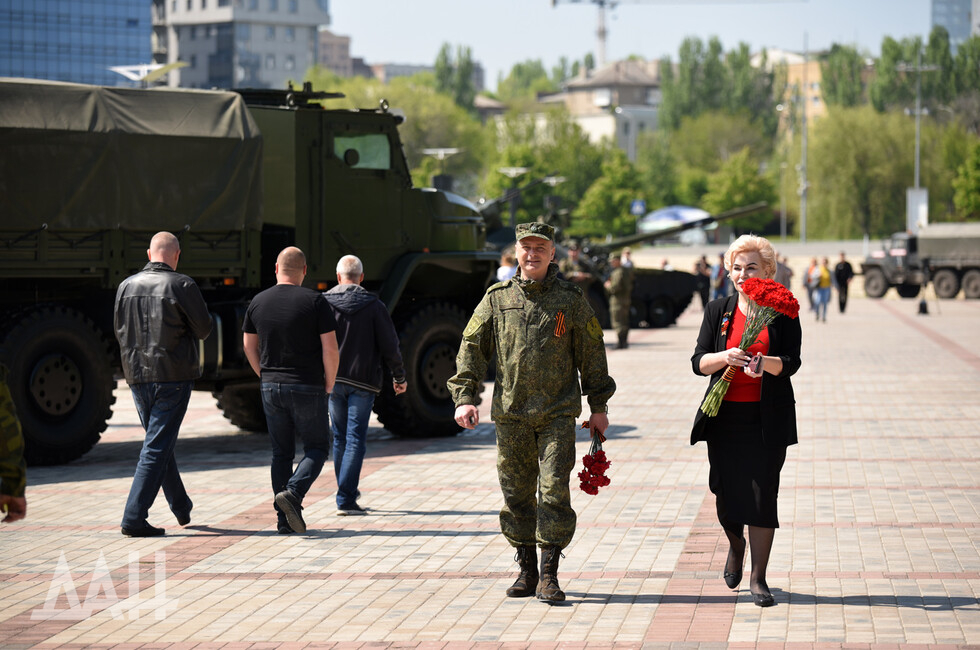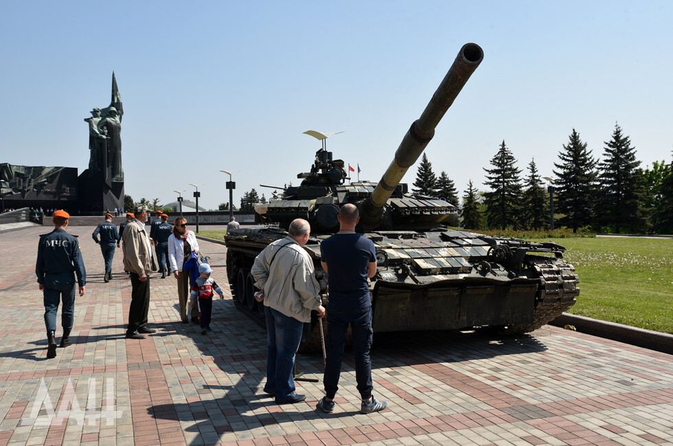 В парке культуры и отдыха имени Ленинского комсомола в этот солнечный праздничный день людей было не много. Виной тому – опасность больших скоплений народа ввиду угрозы обстрелов и других террористических актов со стороны украинских боевиков. И все же люди приходили почтить память павших героев, возложить цветы возле Вечного огня у расположенного здесь мемориала «Твоим освободителям, Донбасс».