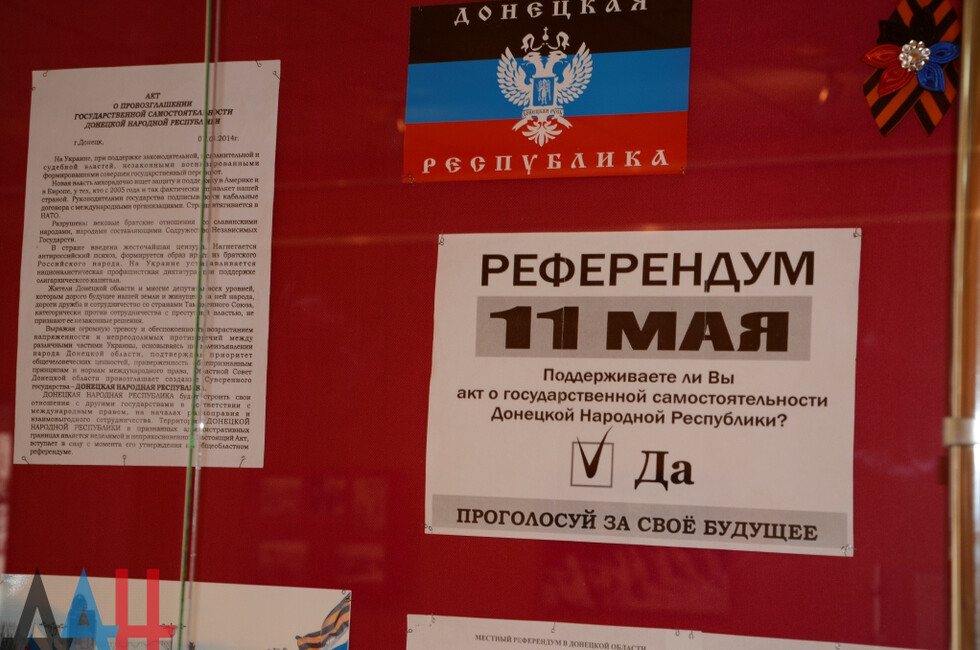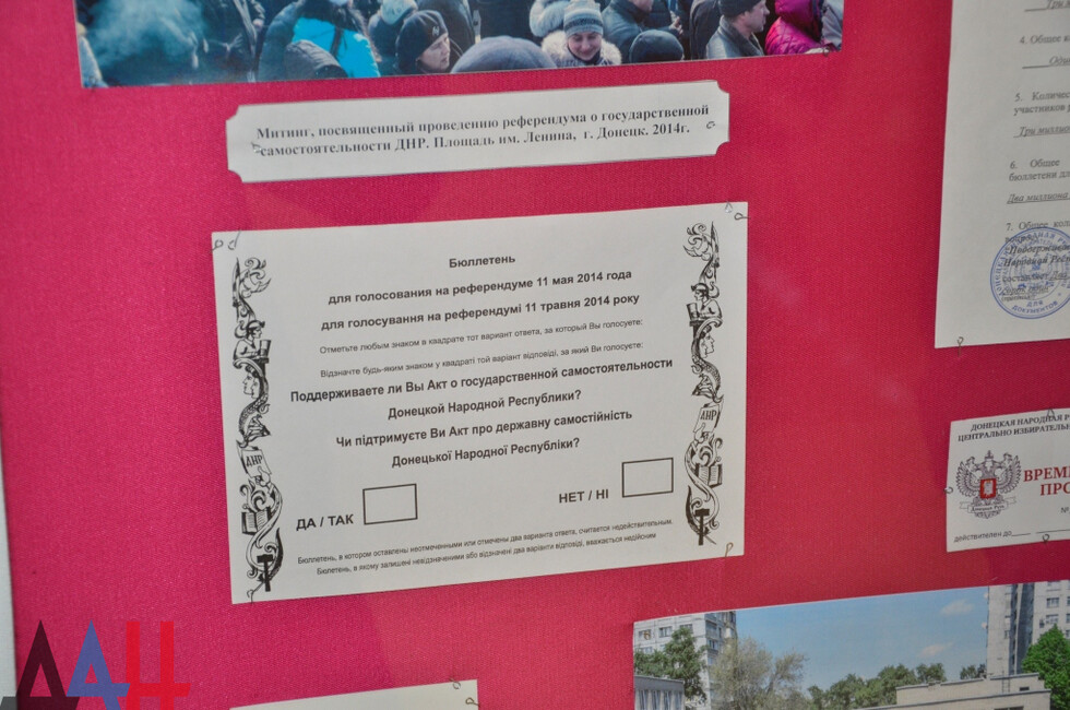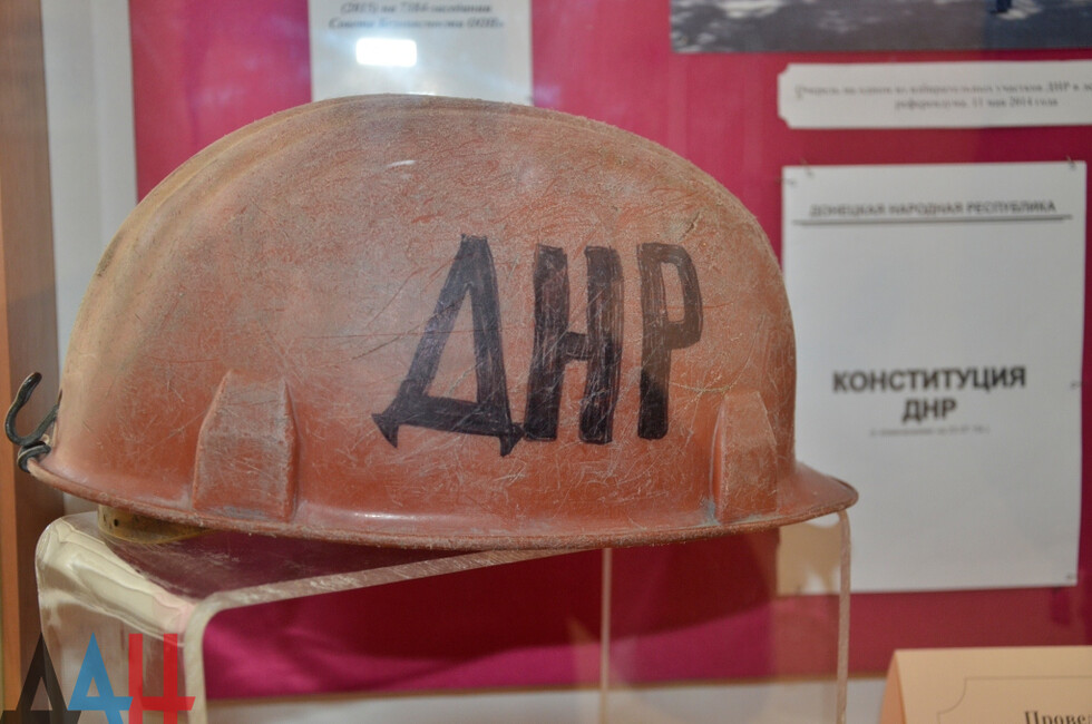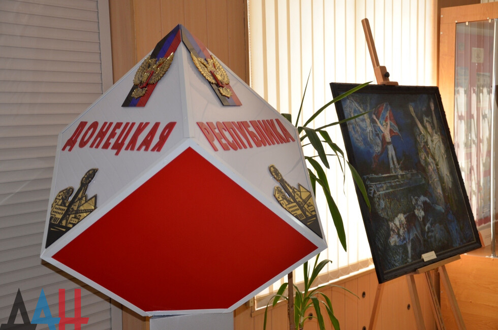 Выставка расположена в холле музея на первом этаже. Она разделена на шесть тематических витрин - сфер развития ДНР. Так, основная представляет собой уникальные документы о политическом становлении Республики. Здесь можно увидеть подлинники протокола об итогах голосования на Референдуме 11 мая, акт о провозглашении независимости ДНР, а также первую редакцию Конституции Республики.